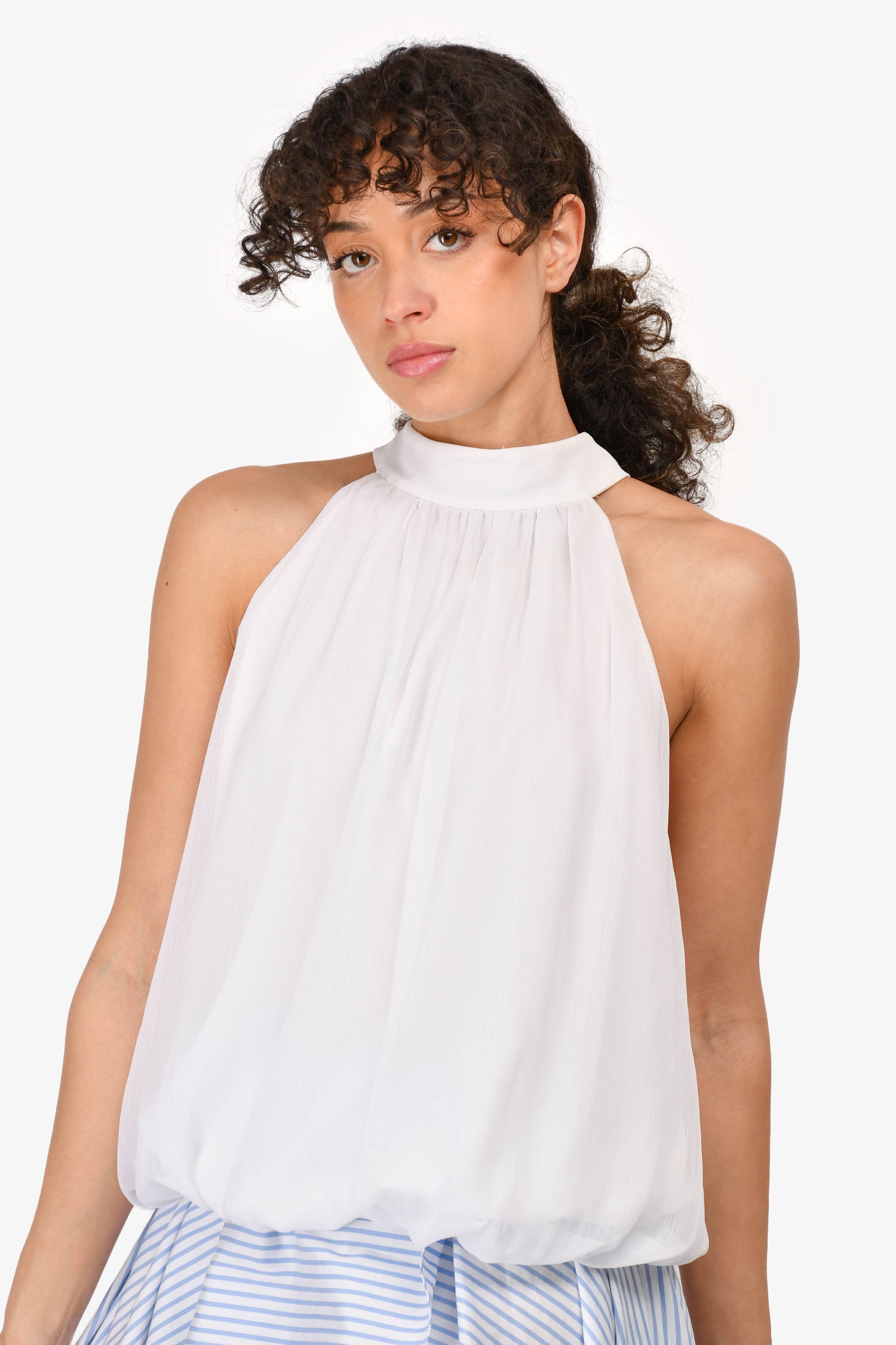 Refresh availabilityAlice & Olivia White Double Line Mock Neck Tie Top. Rear neck-tie closure. Open back. Tonal stitching.