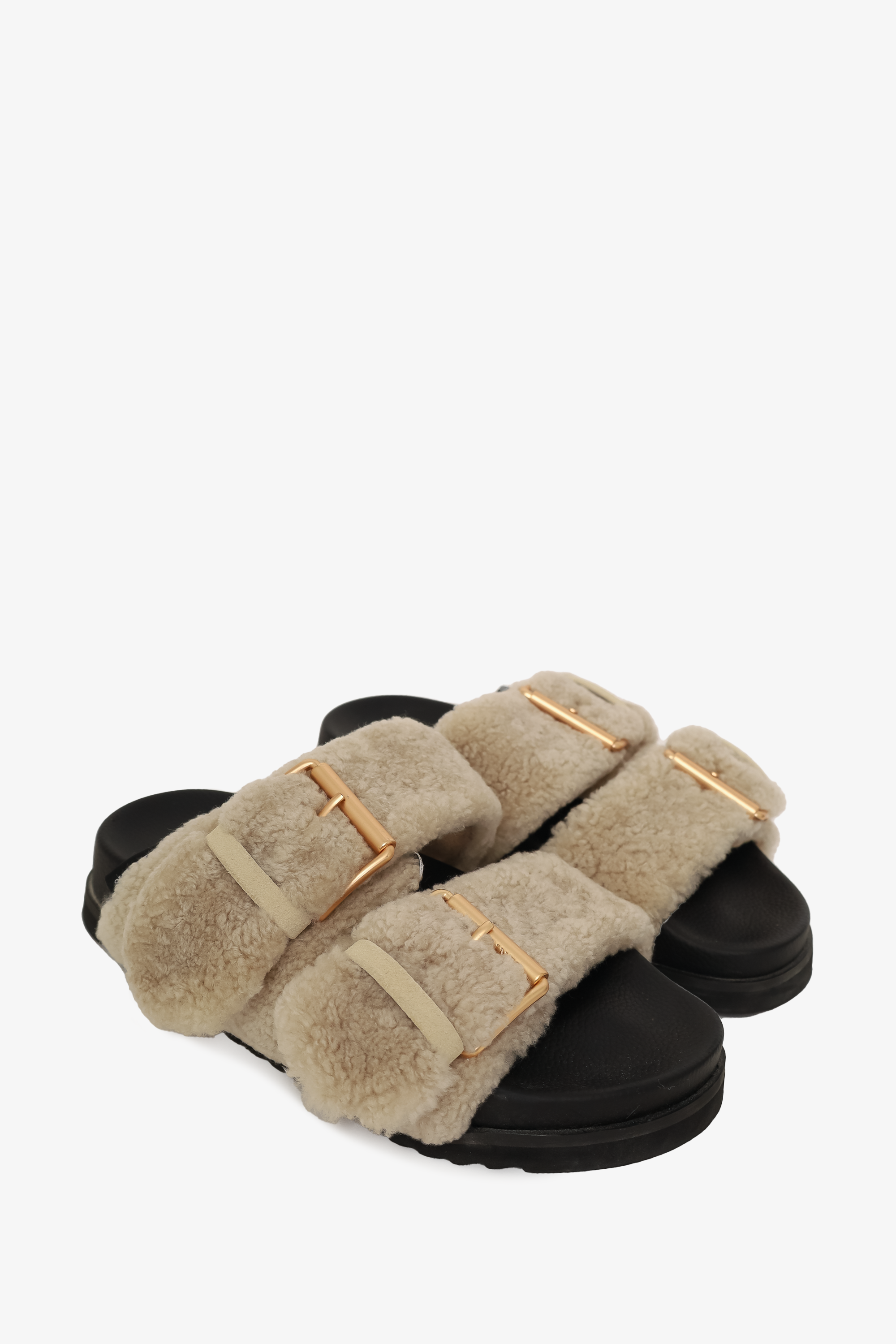 Refresh availabilityAll Saints Beige/Black Sian Sherpa Sandal. Slip-on. Round open toe. Strap with buckle detail. Rose gold hardware. Tonal stitching.