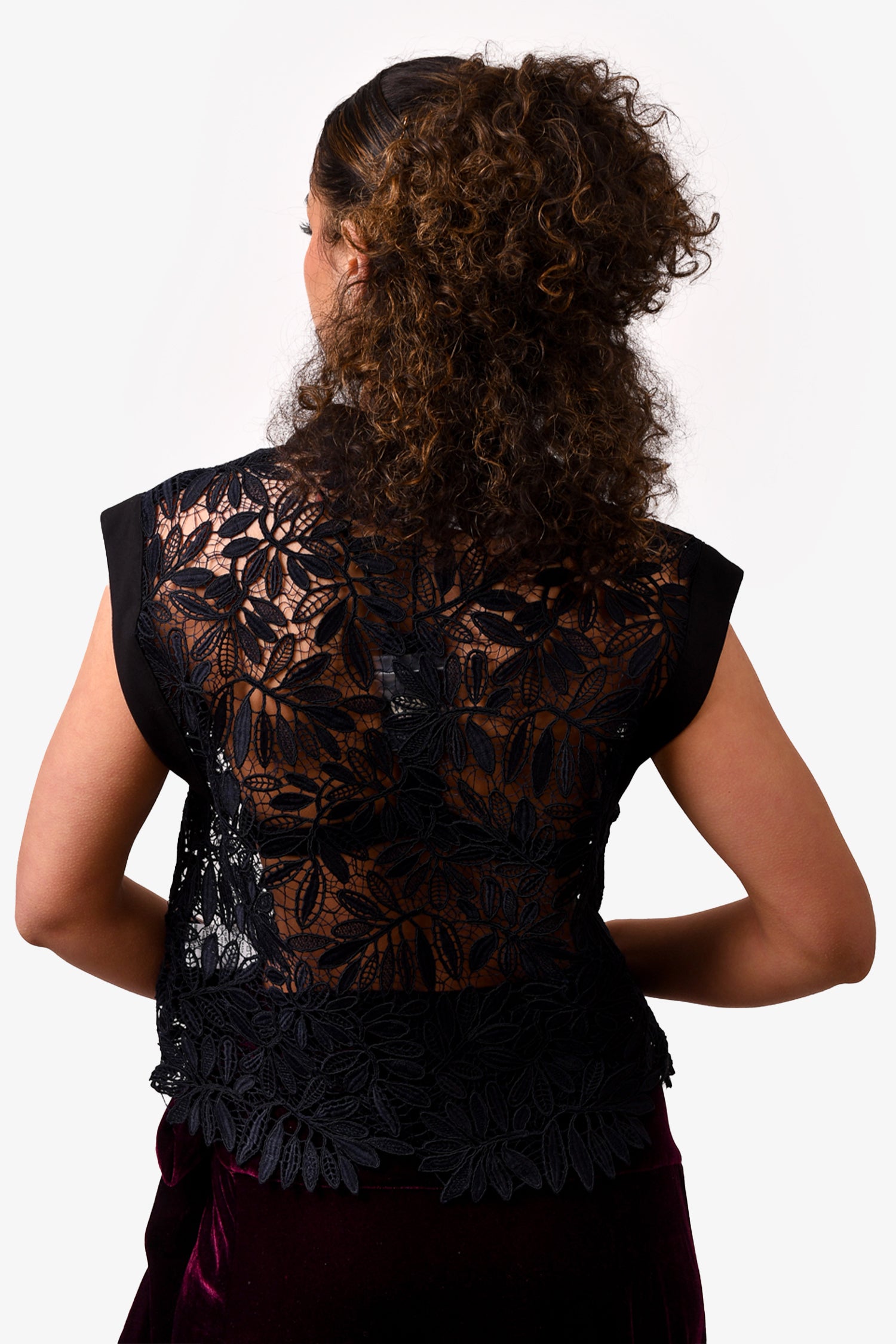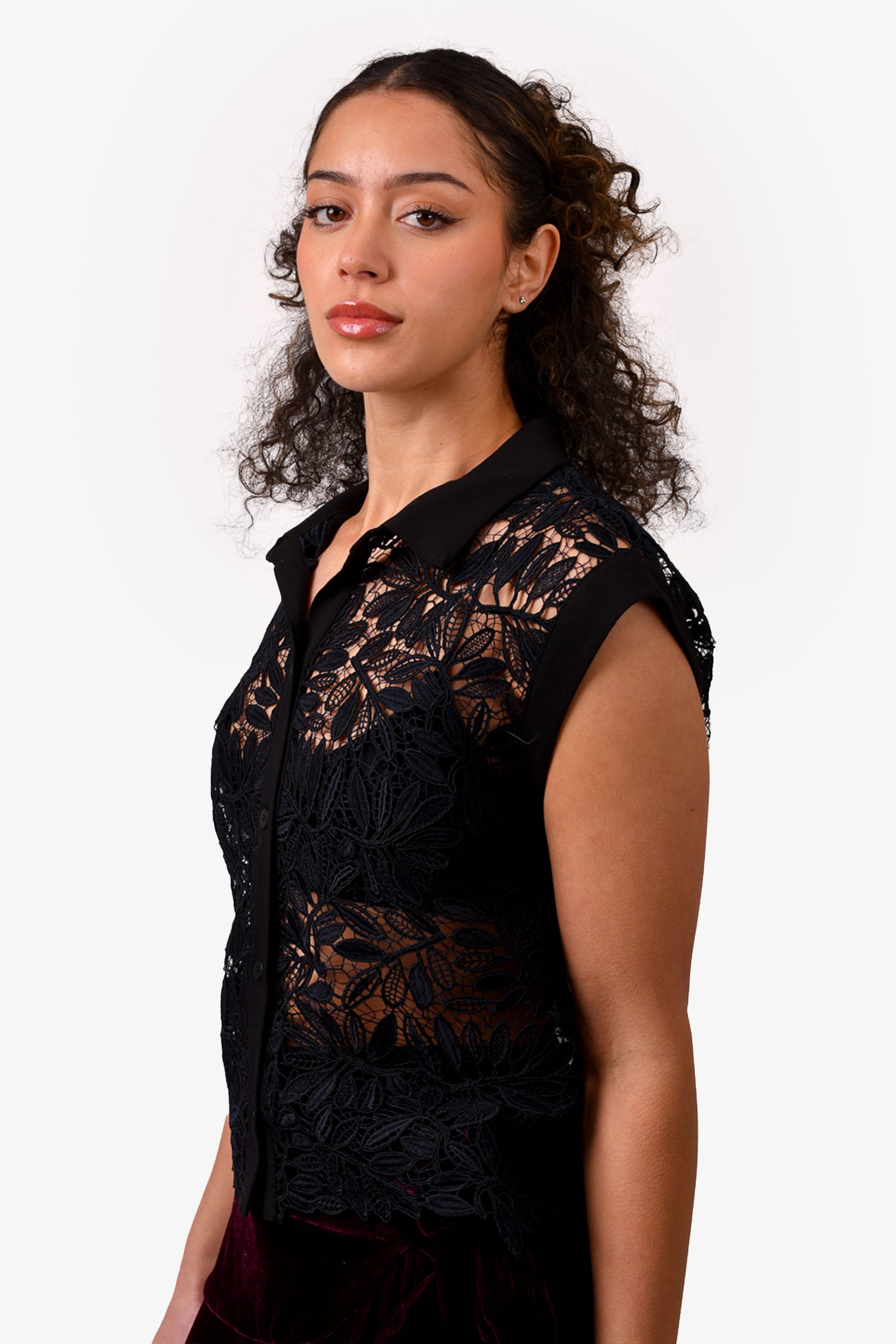 Refresh availabilityAllen Schwartz Navy/Black Sleeveless Lace Collard Blouse. Front button closure. Collared neckline. Unlined. Tonal stitching.