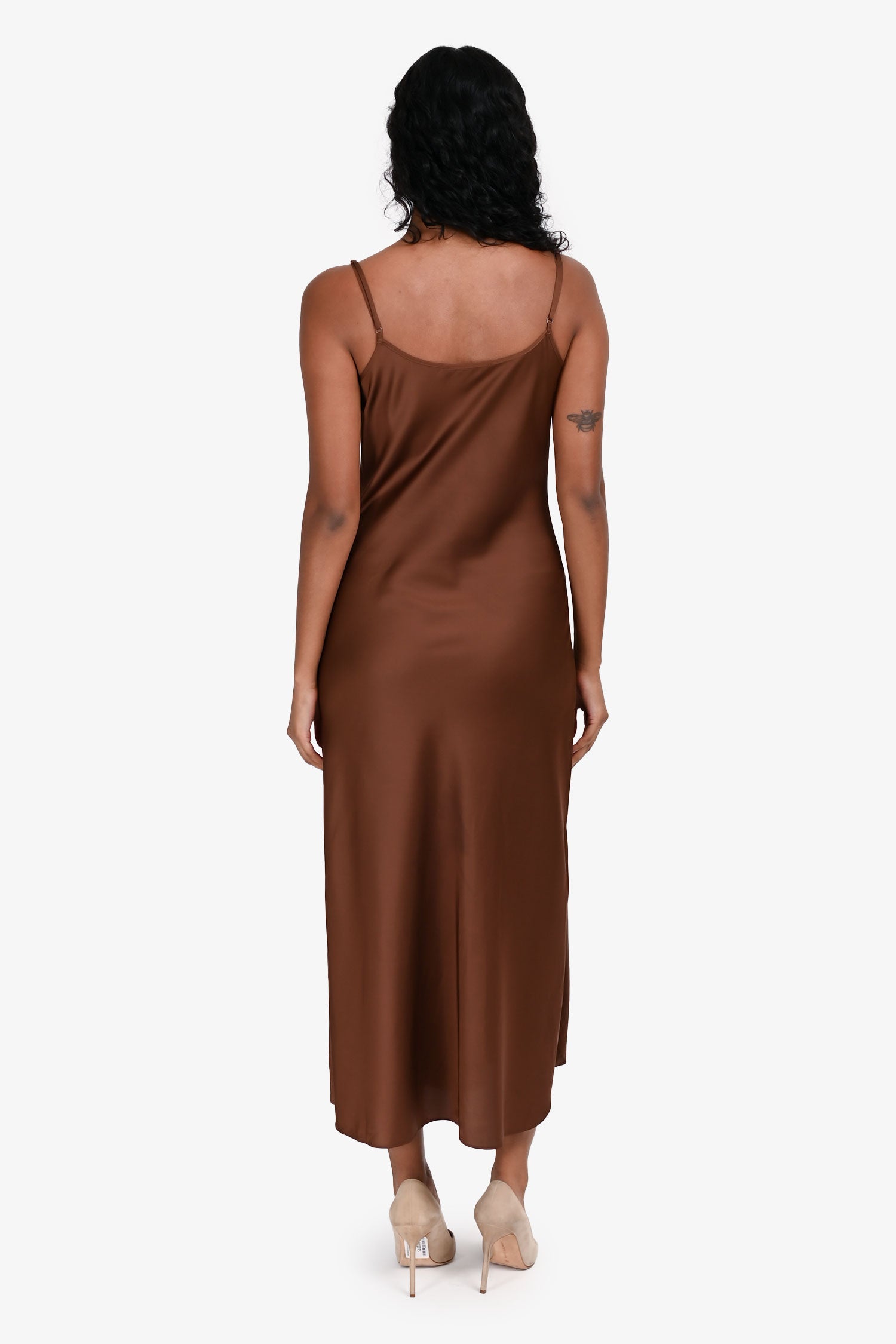Refresh availabilityAllSaints Brown Satin Cowl Neck Maxi Dress. Pull-on. V-neckline. Adjustable straps.