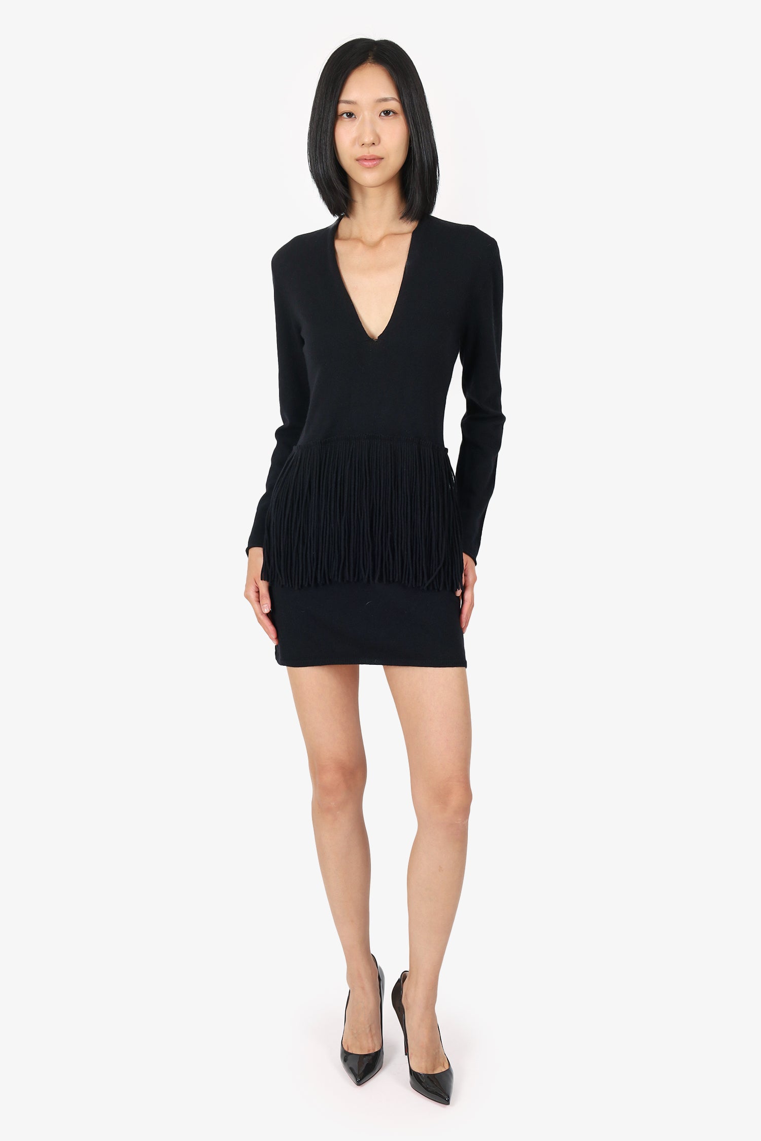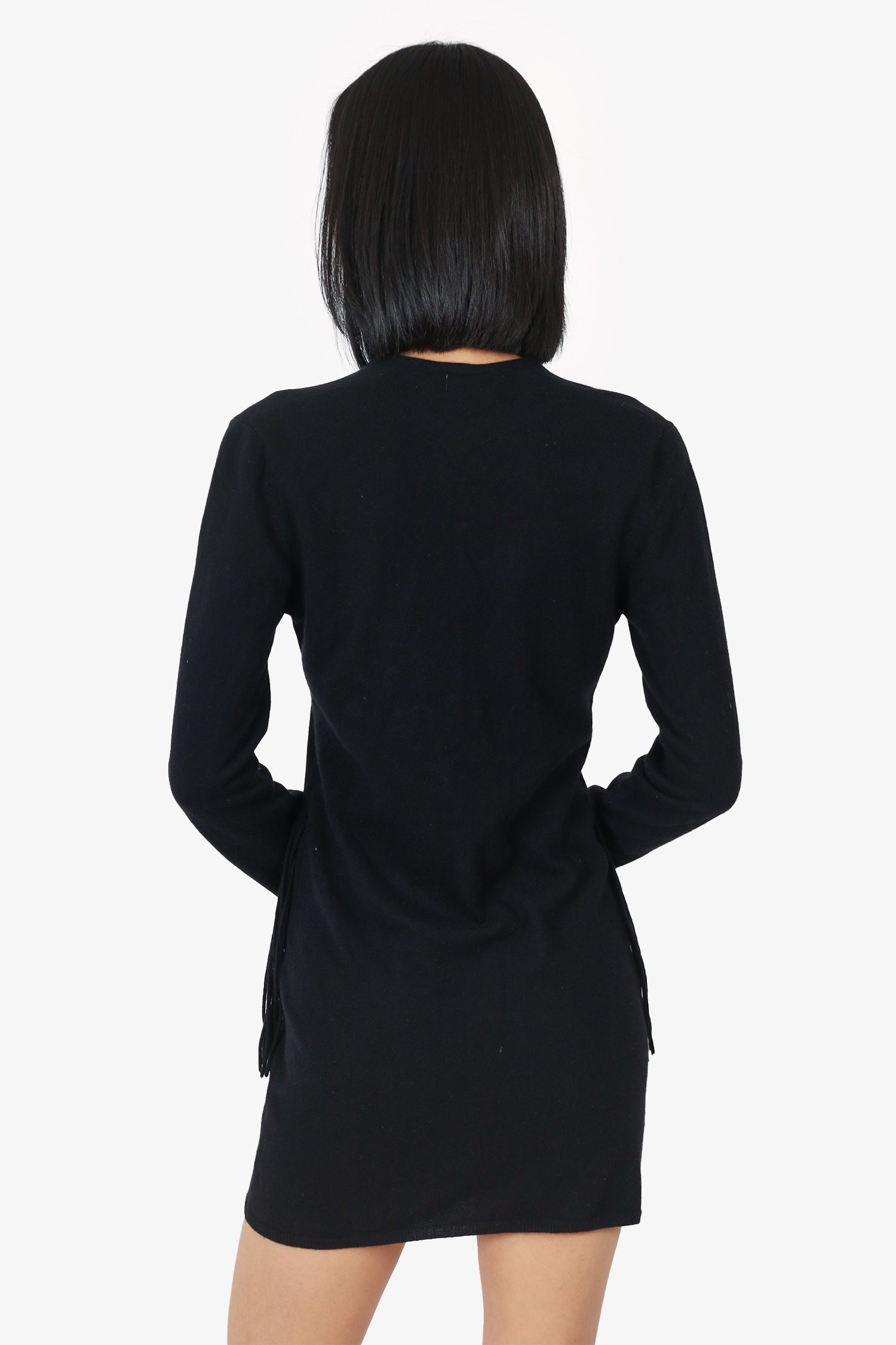 Refresh availabilityAllude Black Cashmere Fringed Knitted Long Sleeve Mini Dress. Pull-on. V-neckline. Tonal stitching.