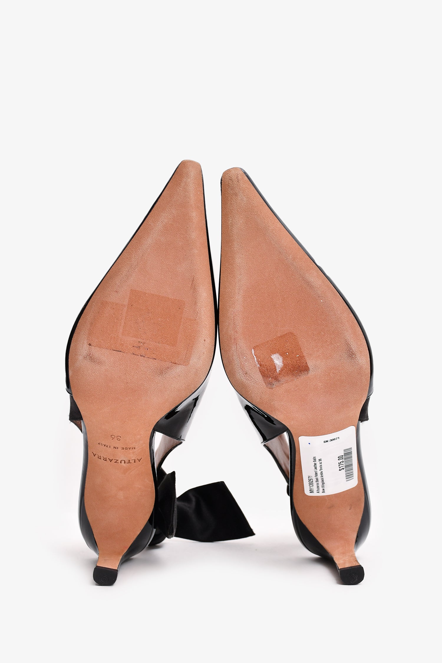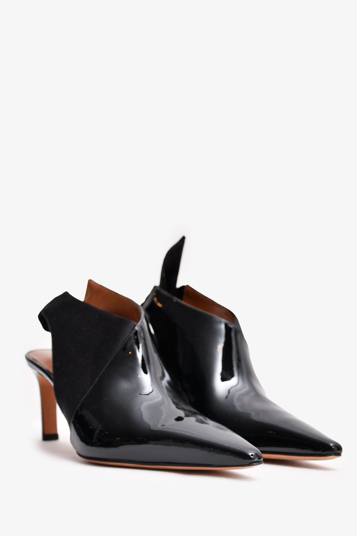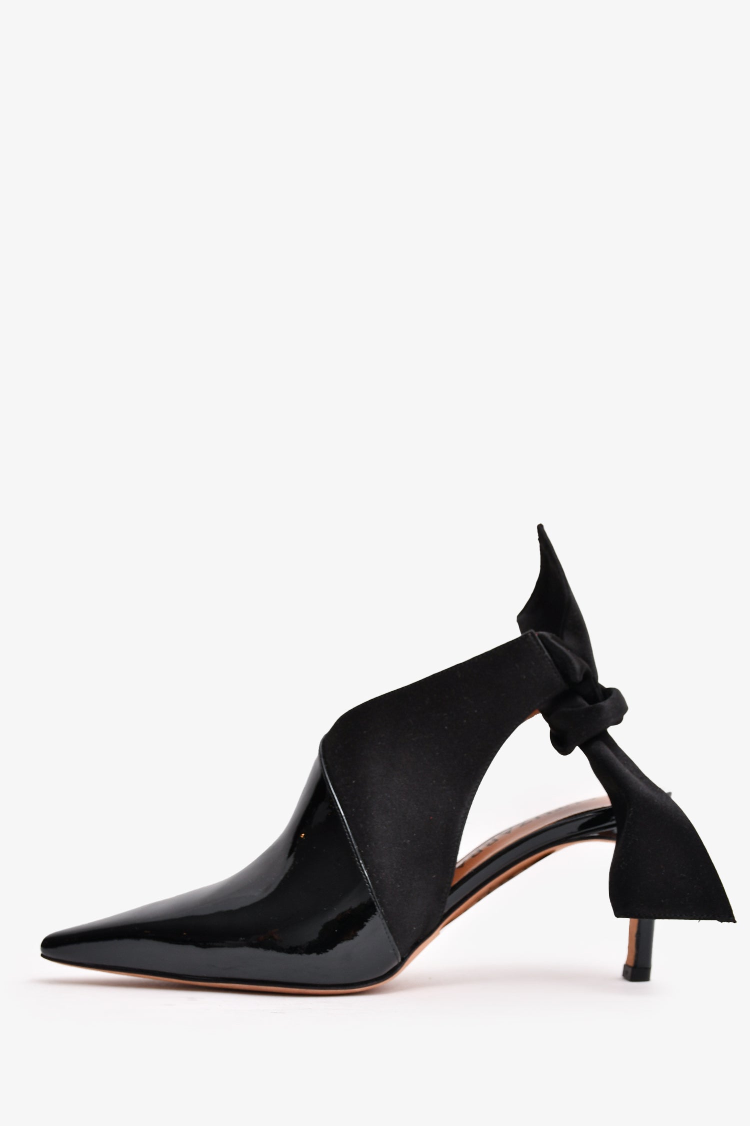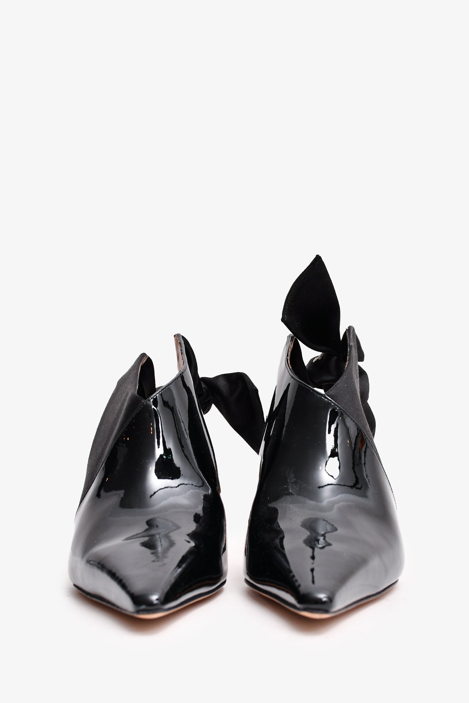 Refresh availabilityAltuzarra Black Patent Leather Satin Bow Slingback Ankle Boots. Pointed toe. Open back. Glossy finish.