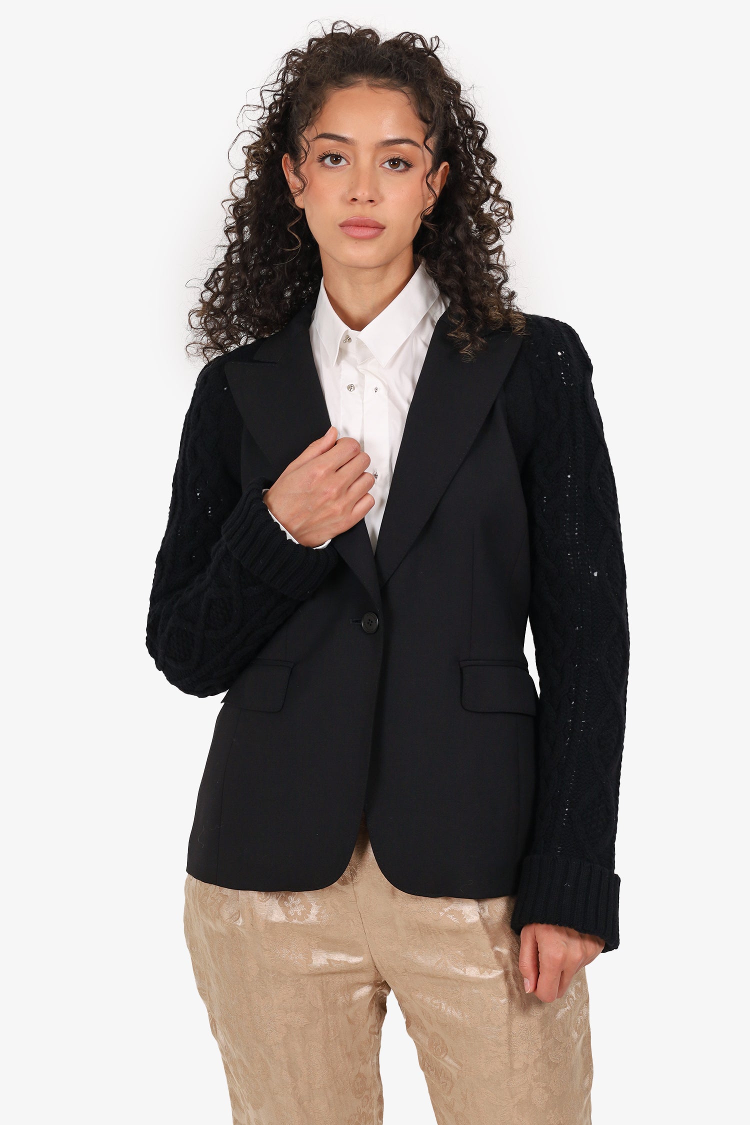 Refresh availabilityAltuzarra Black Virgin Wool Knit Sleeve Single Breasted Blazer. Pull-on. Peak-lapel. Front button-up closure. 2 front exterior flap pockets. Lined interior. Tonal stitching.