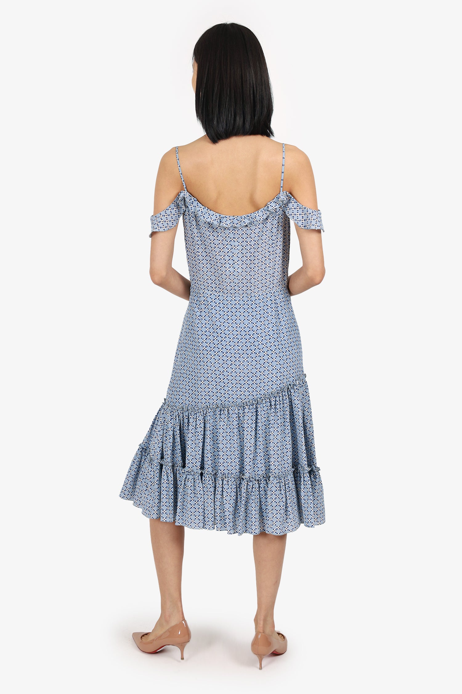 Refresh availabilityAltuzarra Blue Silk Ruffle Dress. Slip-on. V-neckline. Side zip with hook closure. Cold-shoulder. Attached interior lining. Tonal stitching.