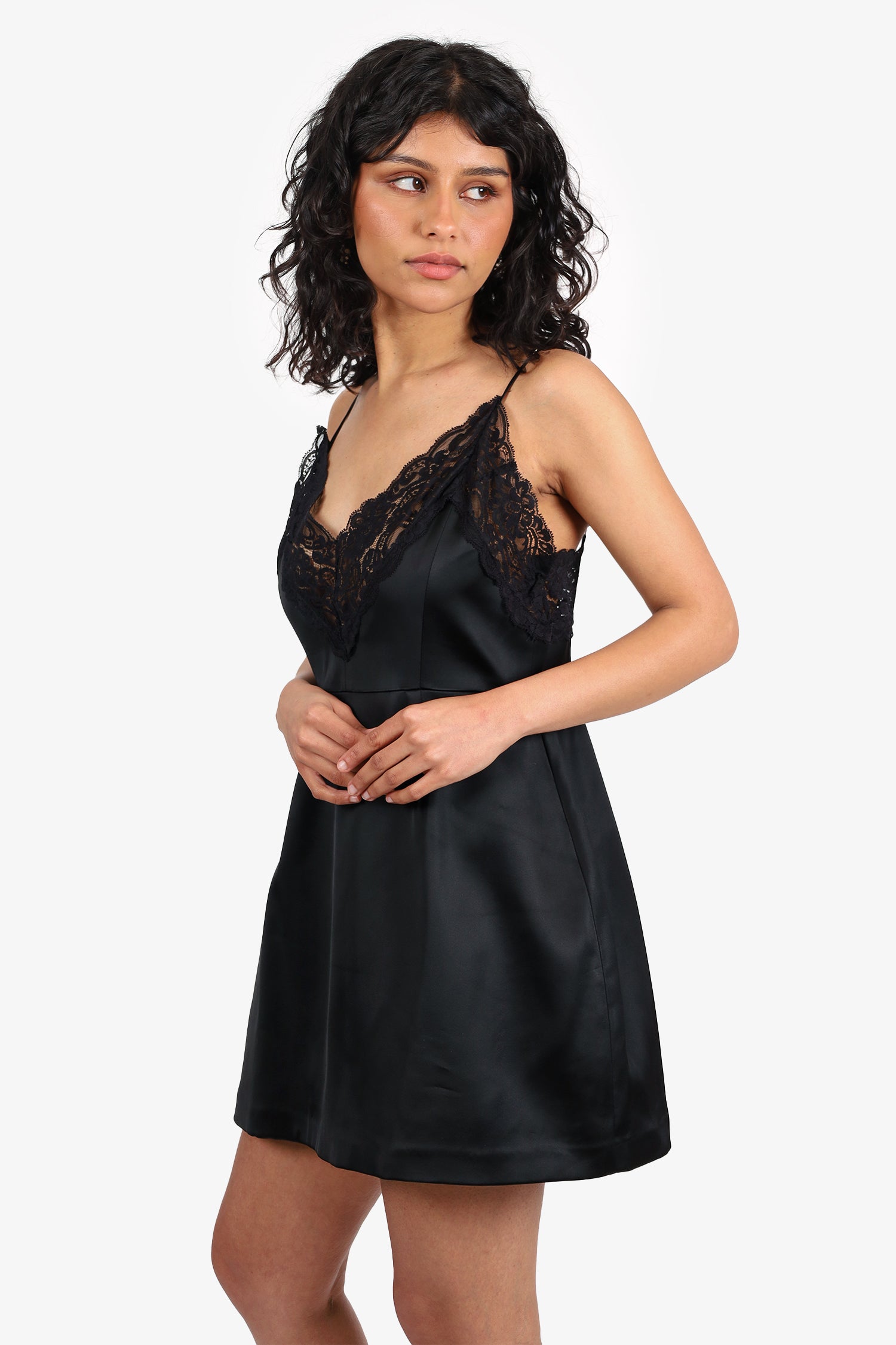 Amanda Uprichard Black Satin Lace V-Neck Mini Dress Size M