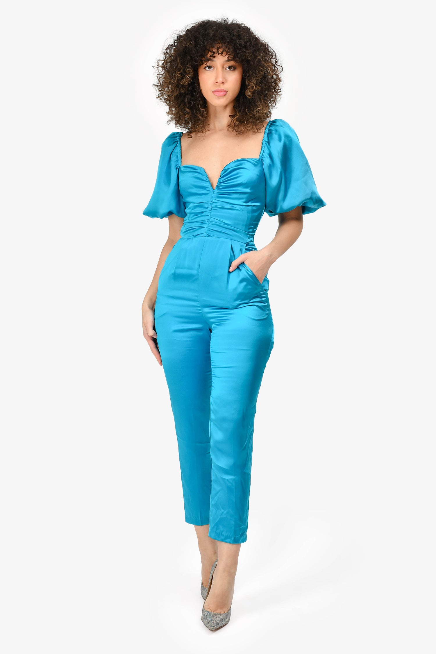 Refresh availabilityAmanda Uprichard Blue Puff Sleeve 'Santucci' Jumpsuit. Back hidden zip-up closure. Smocked detailing on the sides. Elasticized on the shoulders and cuffs. Side slip pockets. Tonal stitching. *Modelled in Size XS