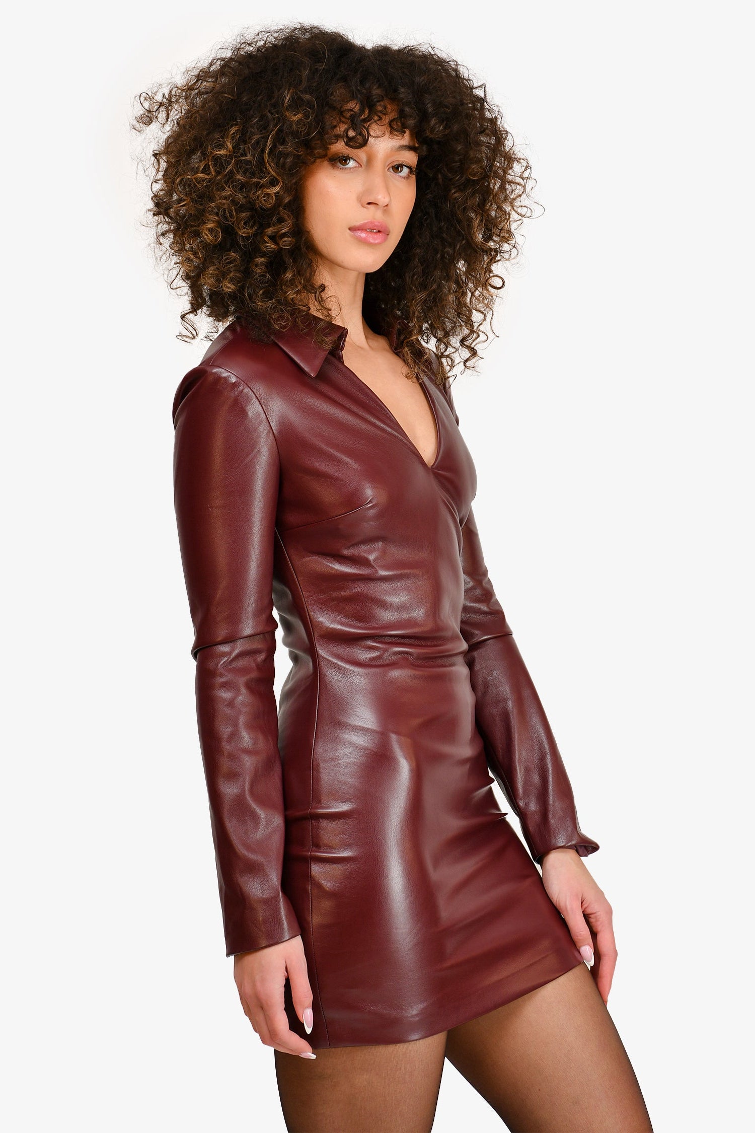 Refresh availabilityAmanda Uprichard Burgundy Leather Collared Mini 'Sloane' Dress. Concealed back zipper. V-neck. Tonal stitching.