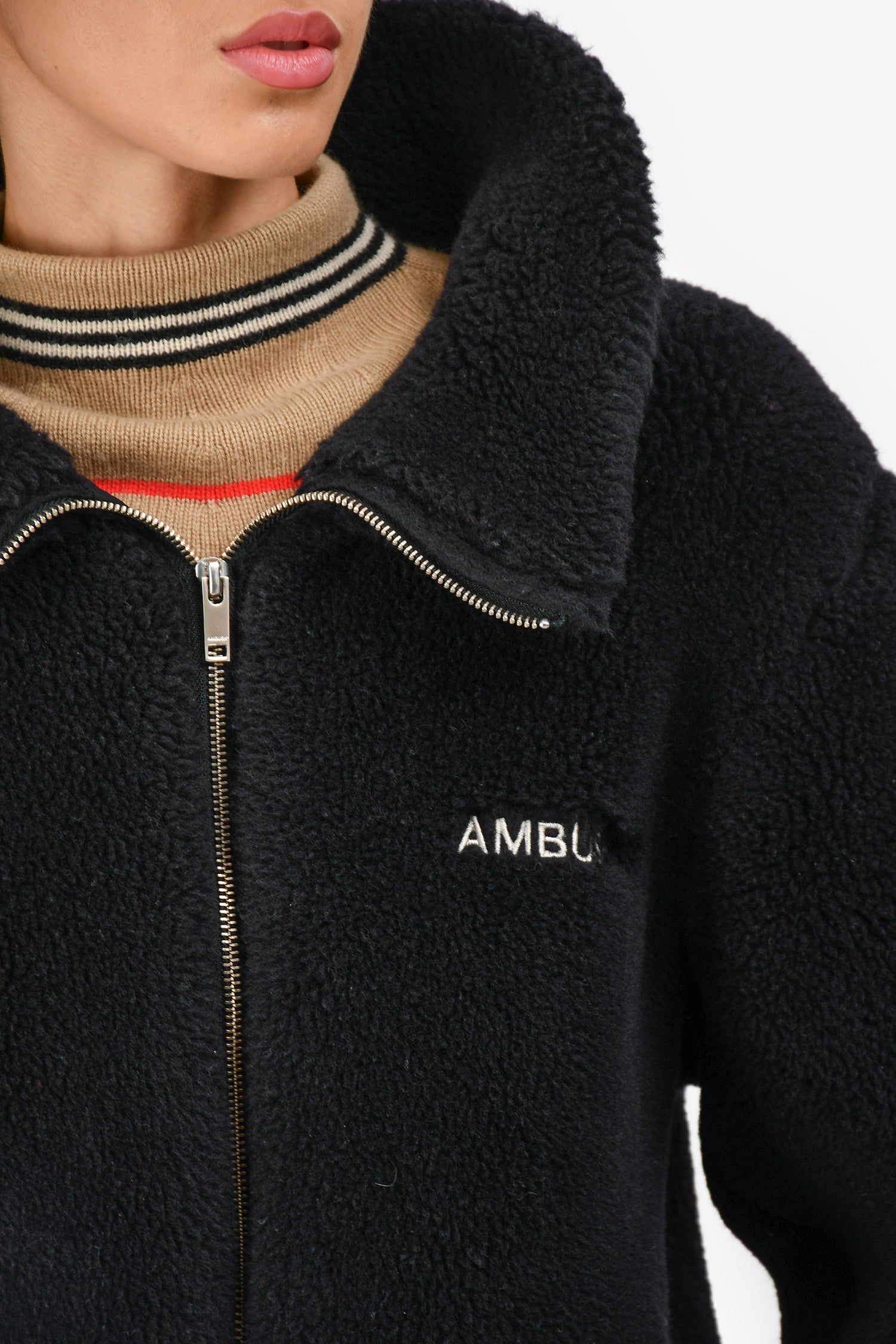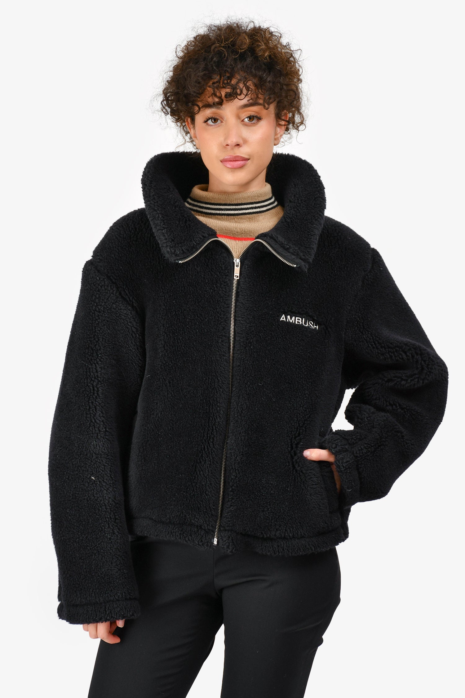 Refresh availabilityAmbush Black Wool Teddy Bear Style Zip Up Jacket. Collared neckline. Front zip closure. 2 side slip pockets. Lined. Tonal stitching.