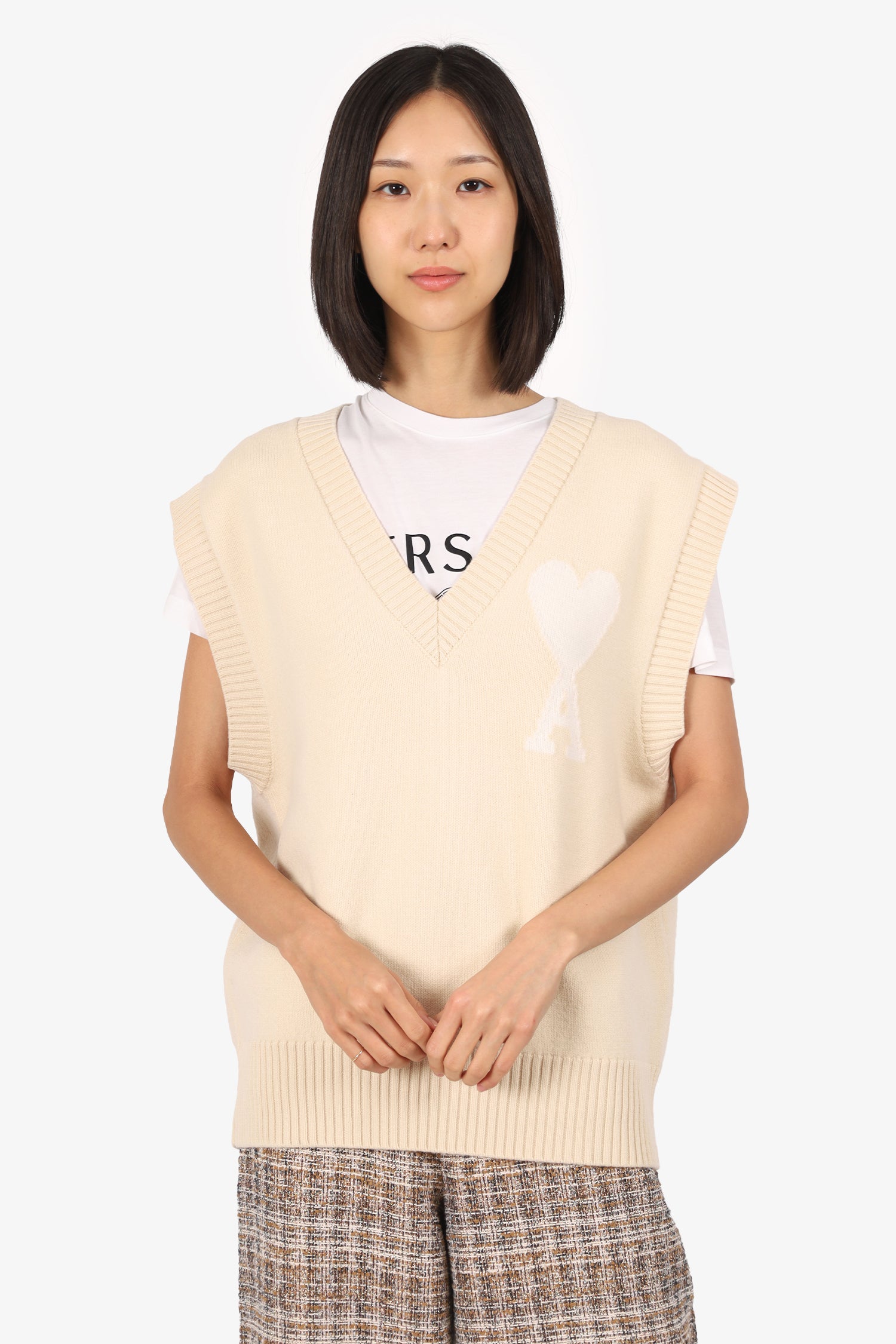 Refresh availabilityAmi Paris Cream Heart Logo Knit Vest. Pull-on. V-neckline. Tonal stitching.