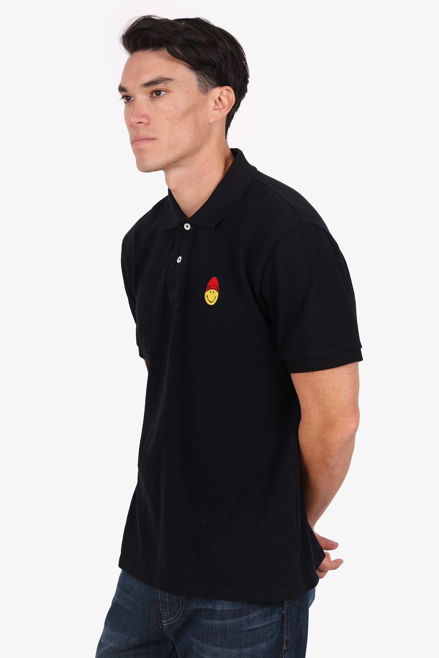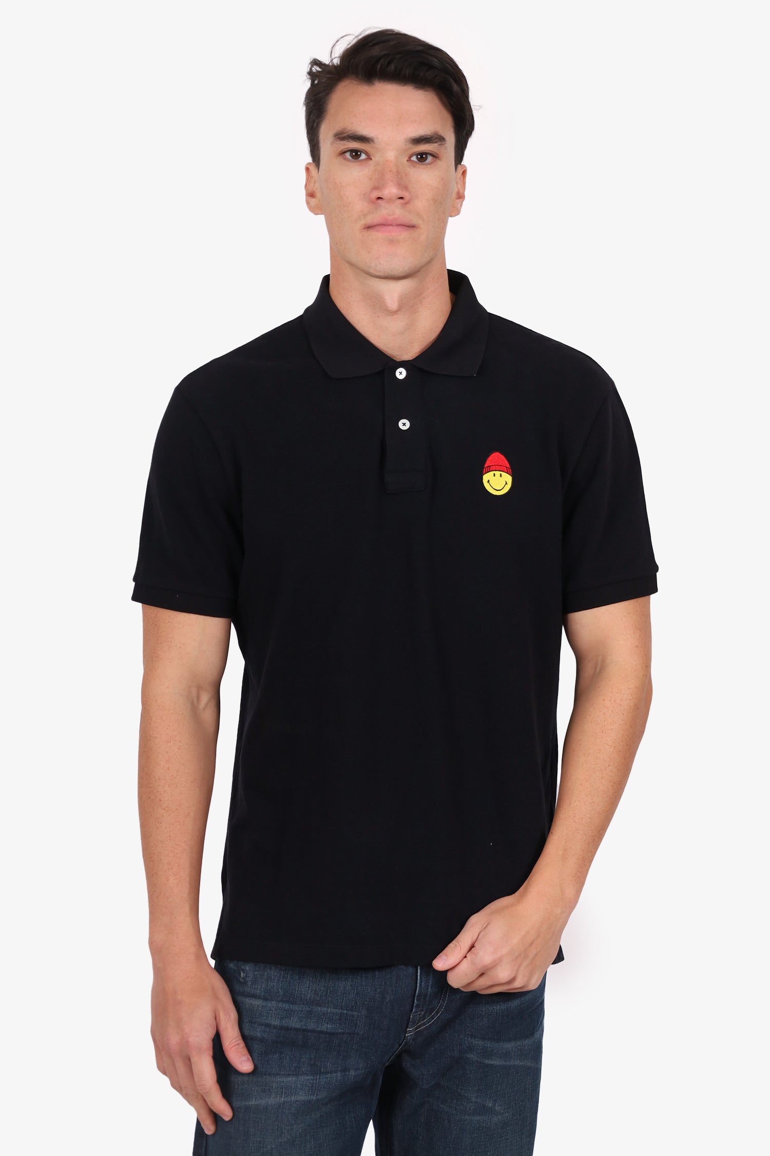 Refresh availabilityAmi X Smiley Black Smiley Face Polo Top. Pull-on. Collared-neckline. Front button-up closure. Tonal stitching.