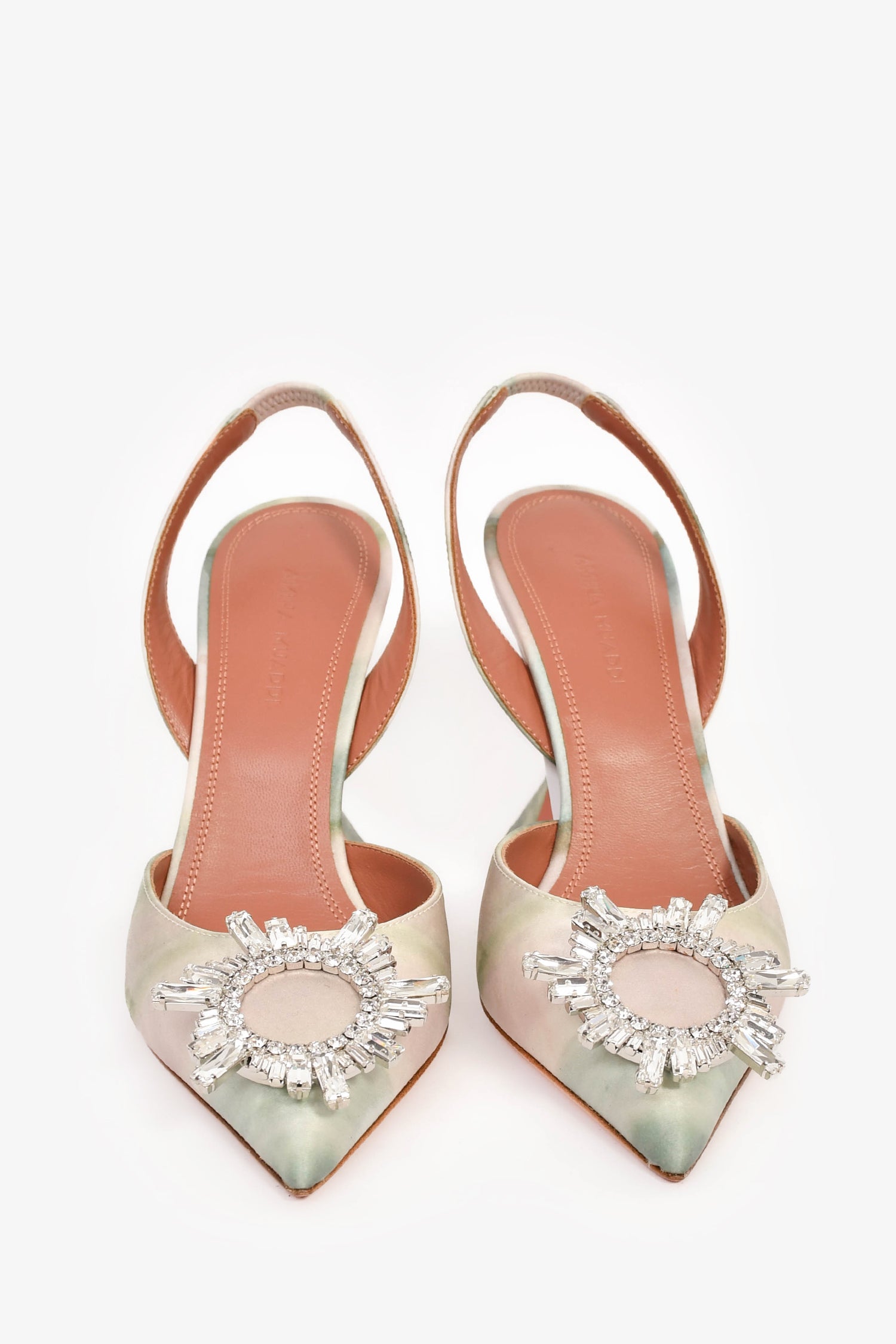 Refresh availabilityAmina Muaddi 2023 Green/Pink Satin Crystal Embellished Begum Sling Heels. Slip-on. Pointed toe. Lined leather interior. Tonal stitching.
