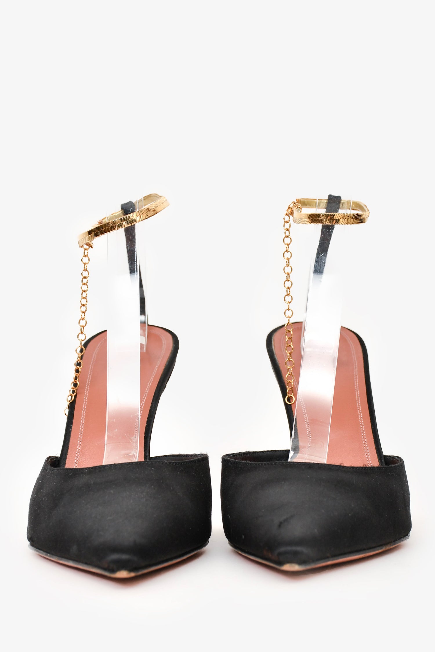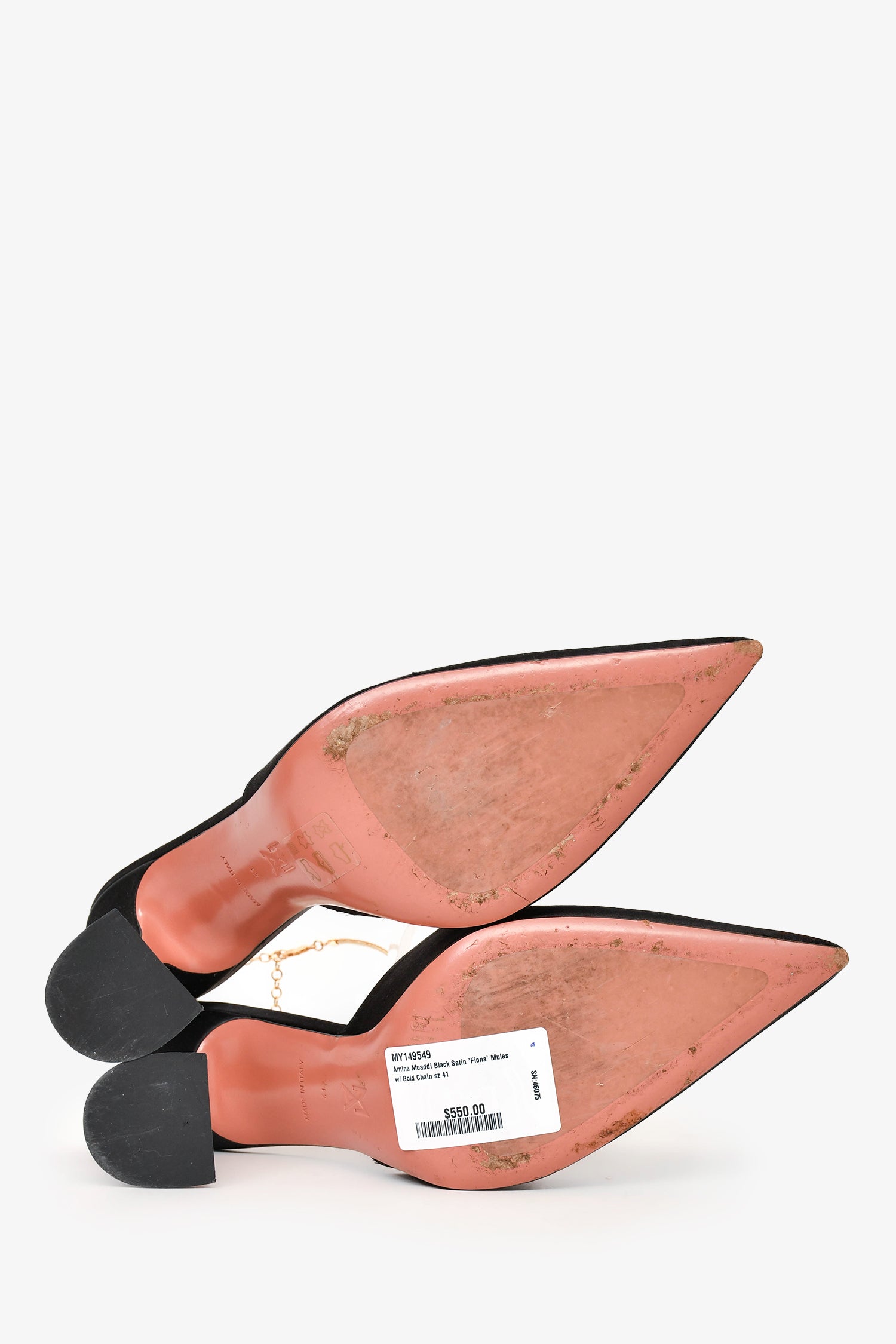 Refresh availabilityAmina Muaddi Black Satin 'Fiona' Mules With Gold Chain. Pointed toe. Gold-tone hardware. Lobster claw chain closure. Tonal stitching.