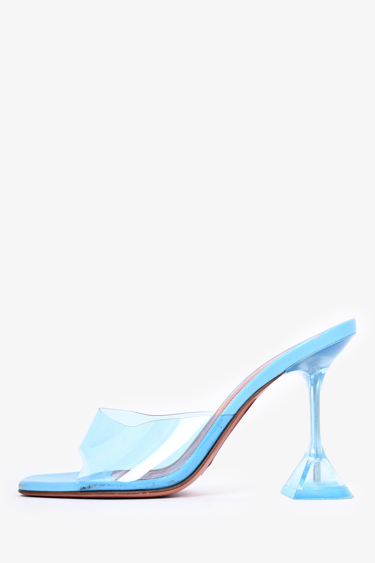 Refresh availabilityAmina Muaddi Blue Leather/PVC 'Lupita' Heeled Sandals. PVC toe strap front. Square toe front. Flutted heels.