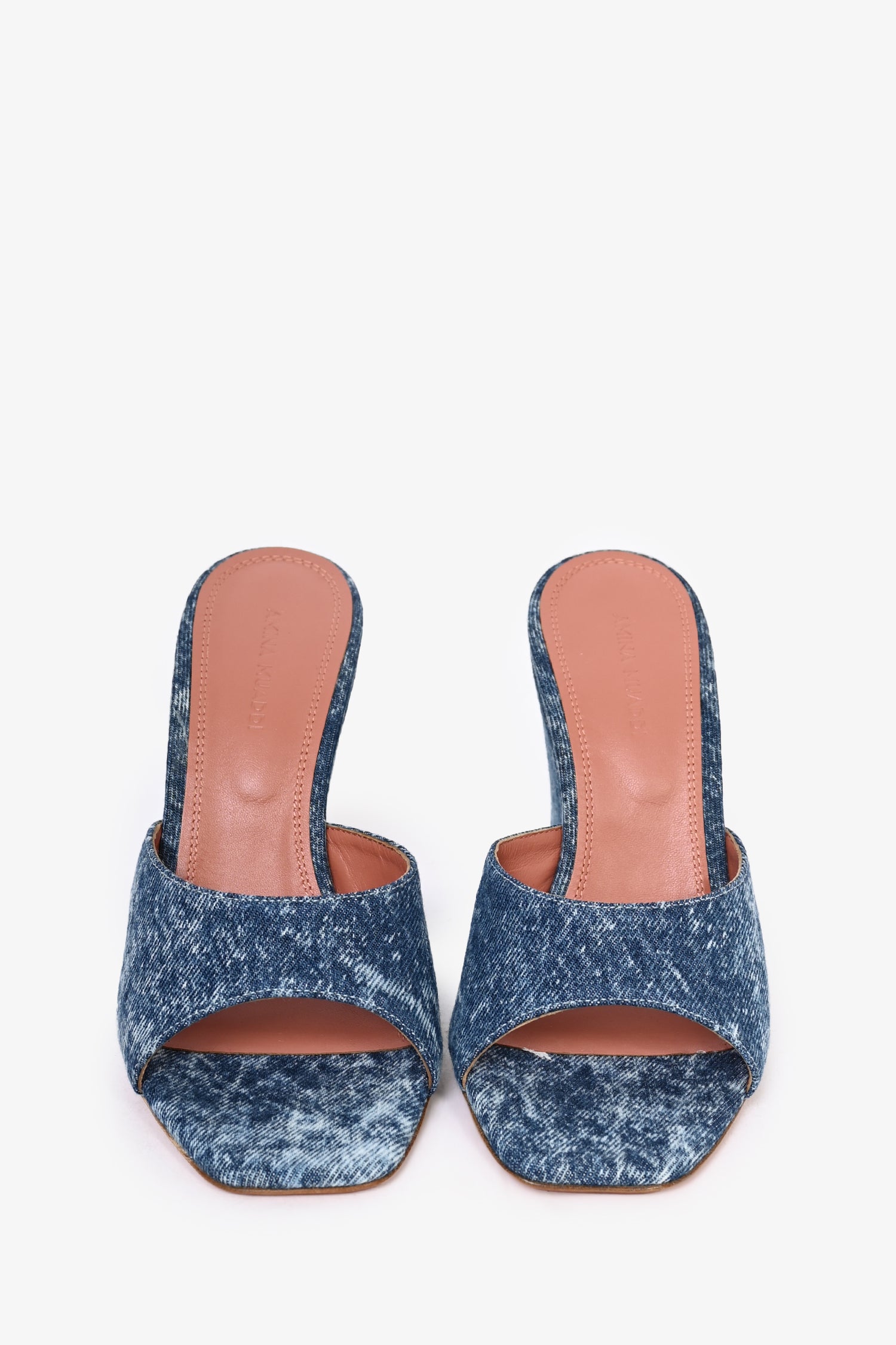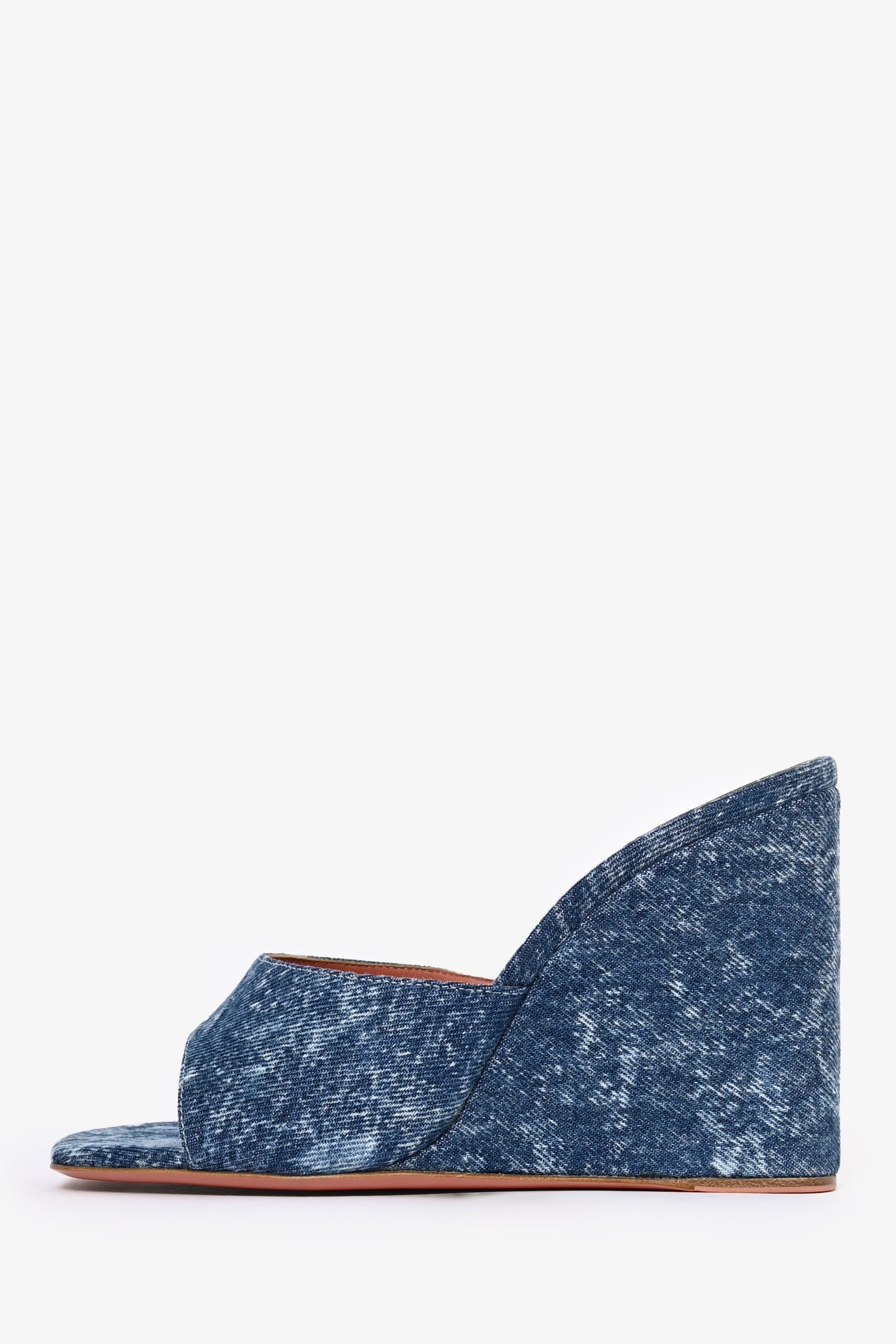 Refresh availabilityAmina Muaddi Medium Denim Wash Wedge Heels. Leather insole with debossed logo lettering. Peep-toe square opening. Covered acid-denim wash throughout. Tonal stitching.