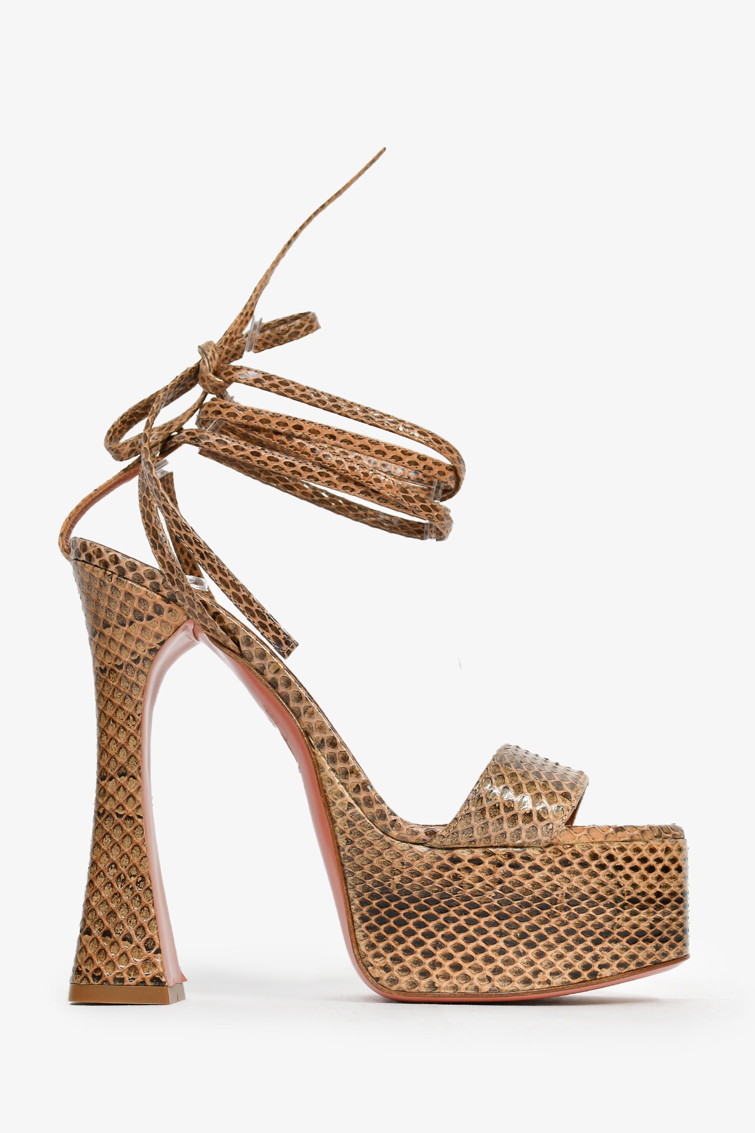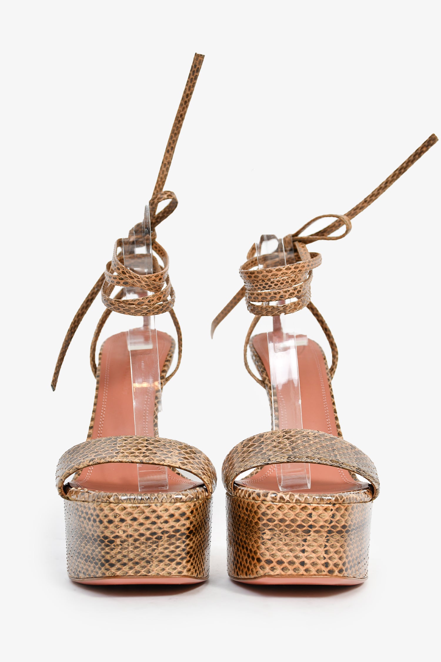 Refresh availabilityAmina Muaddi Brown Python Wrap Platform Heels. Square open toe. Wrap-around ankle straps. Tonal stitching.