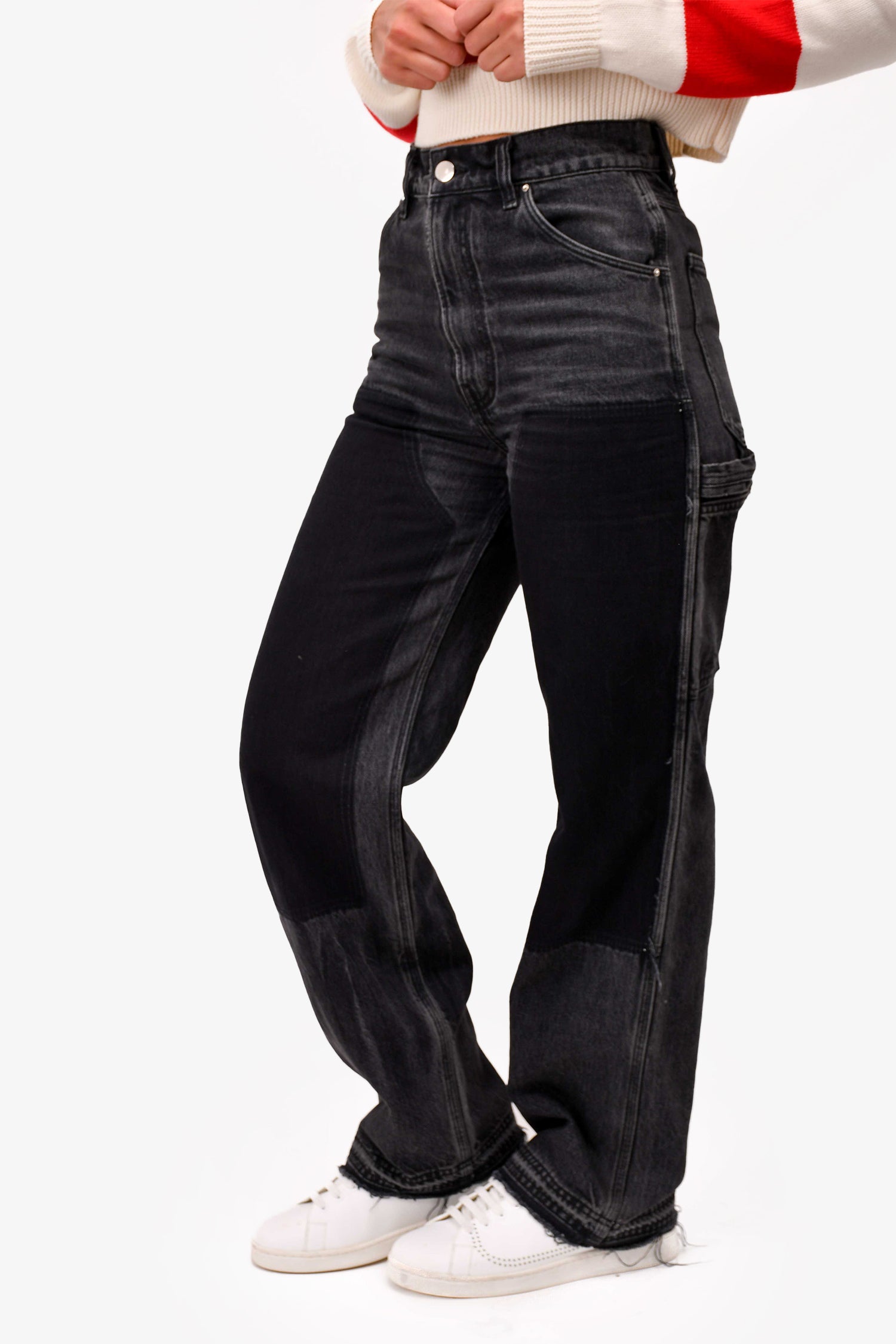 Refresh availabilityAmiri Black Straight Leg Patchwork Denim Jeans. Front zip-up and button closure. Pockets on pant leg. Silver-tone hardware. Mid-rise. Tonal stitching.