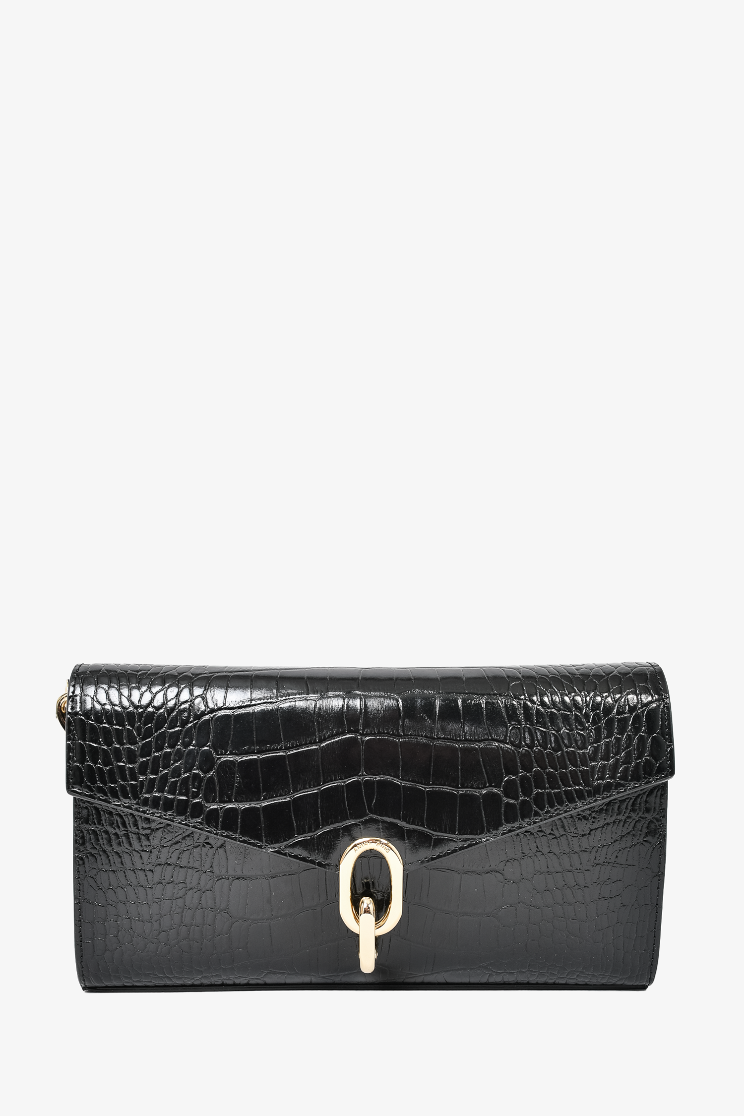 Refresh availabilityAnine Bing Black Croc Embossed Leather Colette Shoulder Bag with Strap. Top lift-closure. One exterior back slip pocket. One interior zip-closure pocket. Detachable strap. Gold-toned hardware. Tonal stitching.