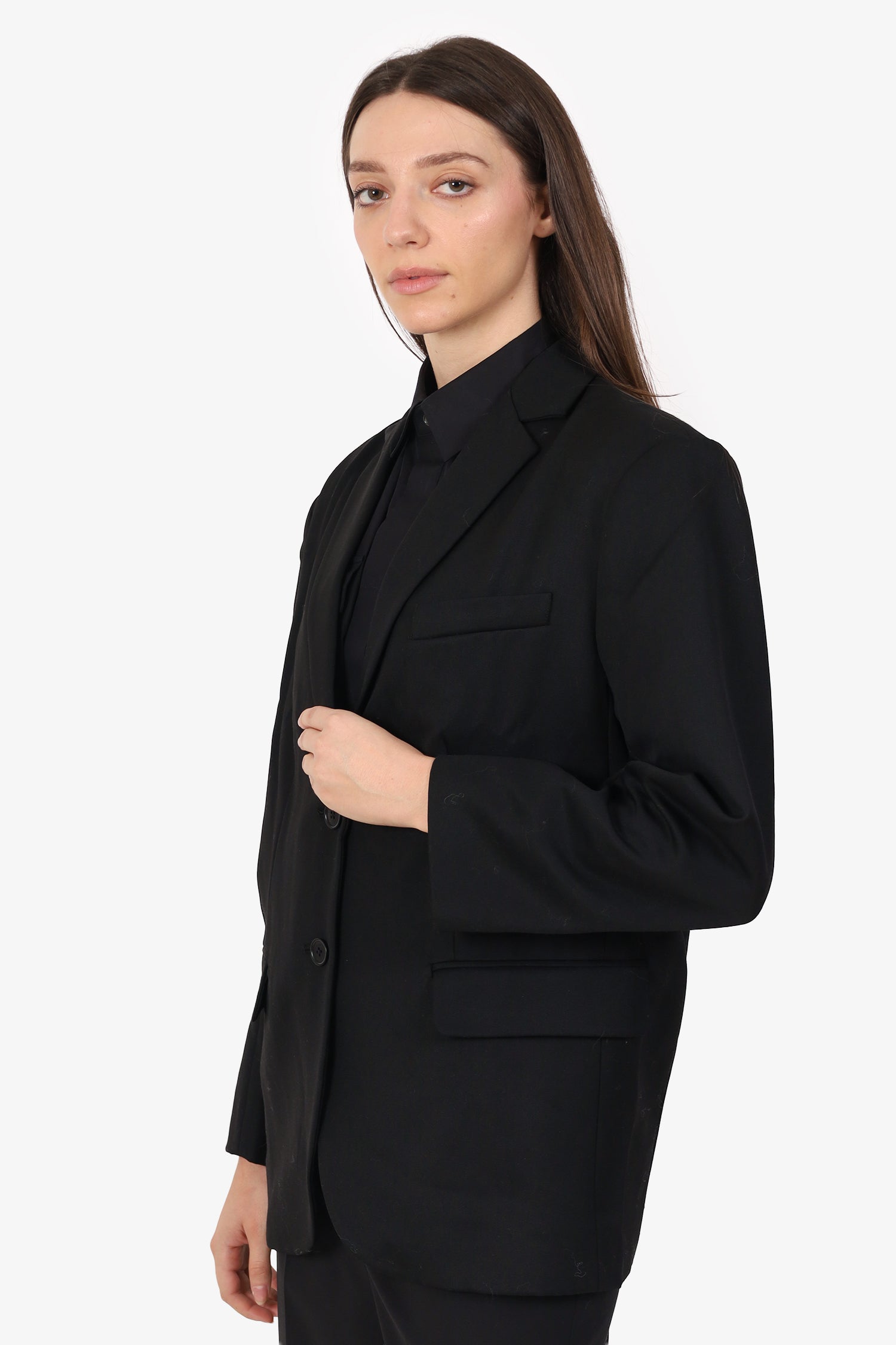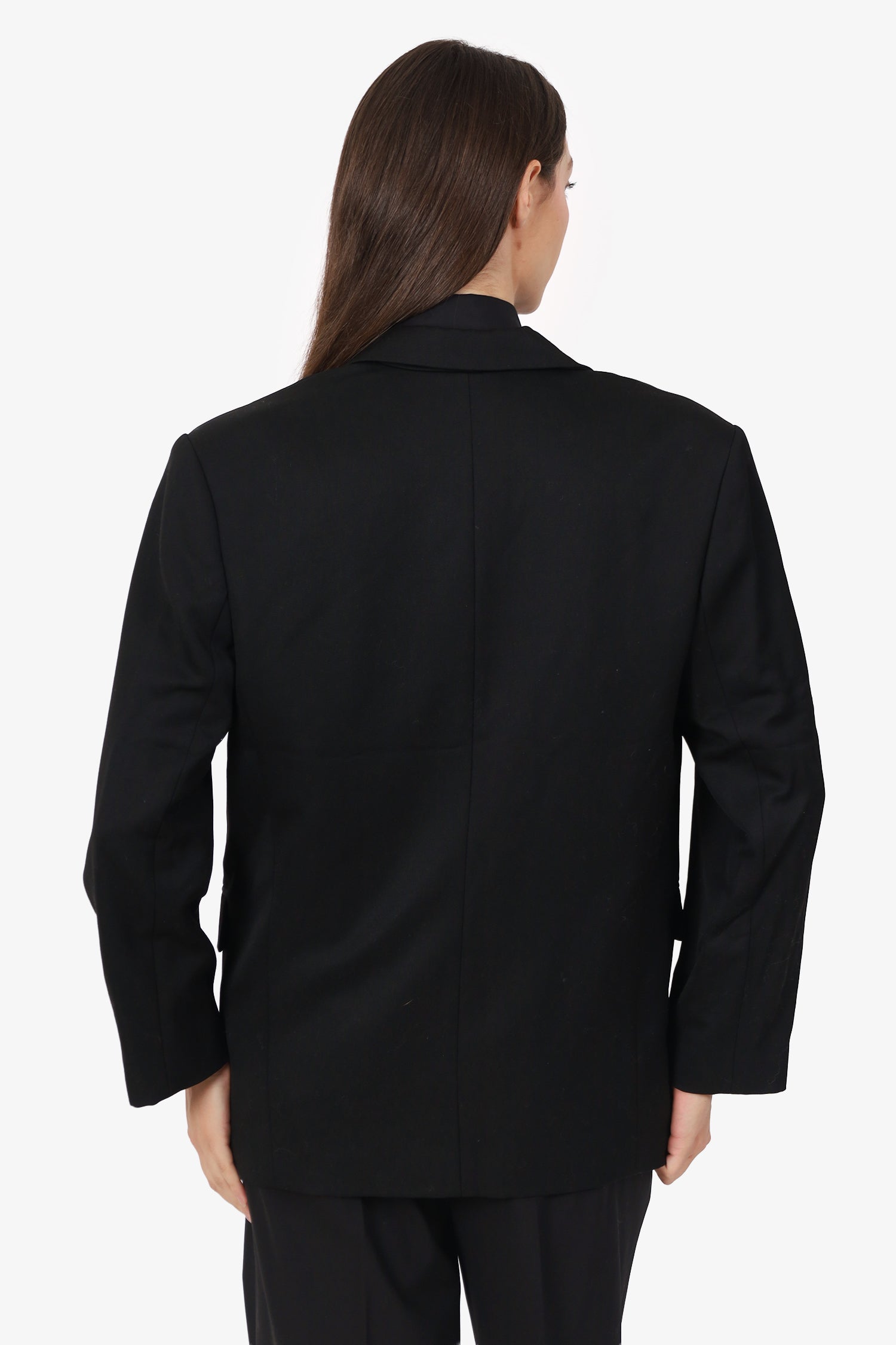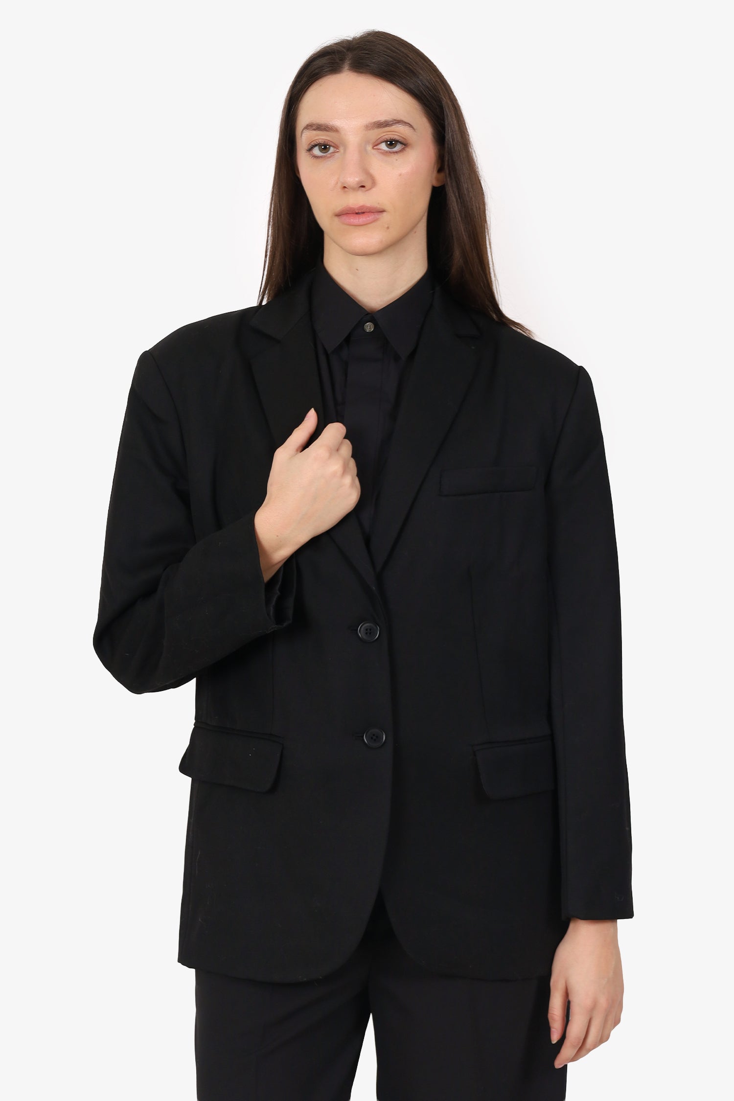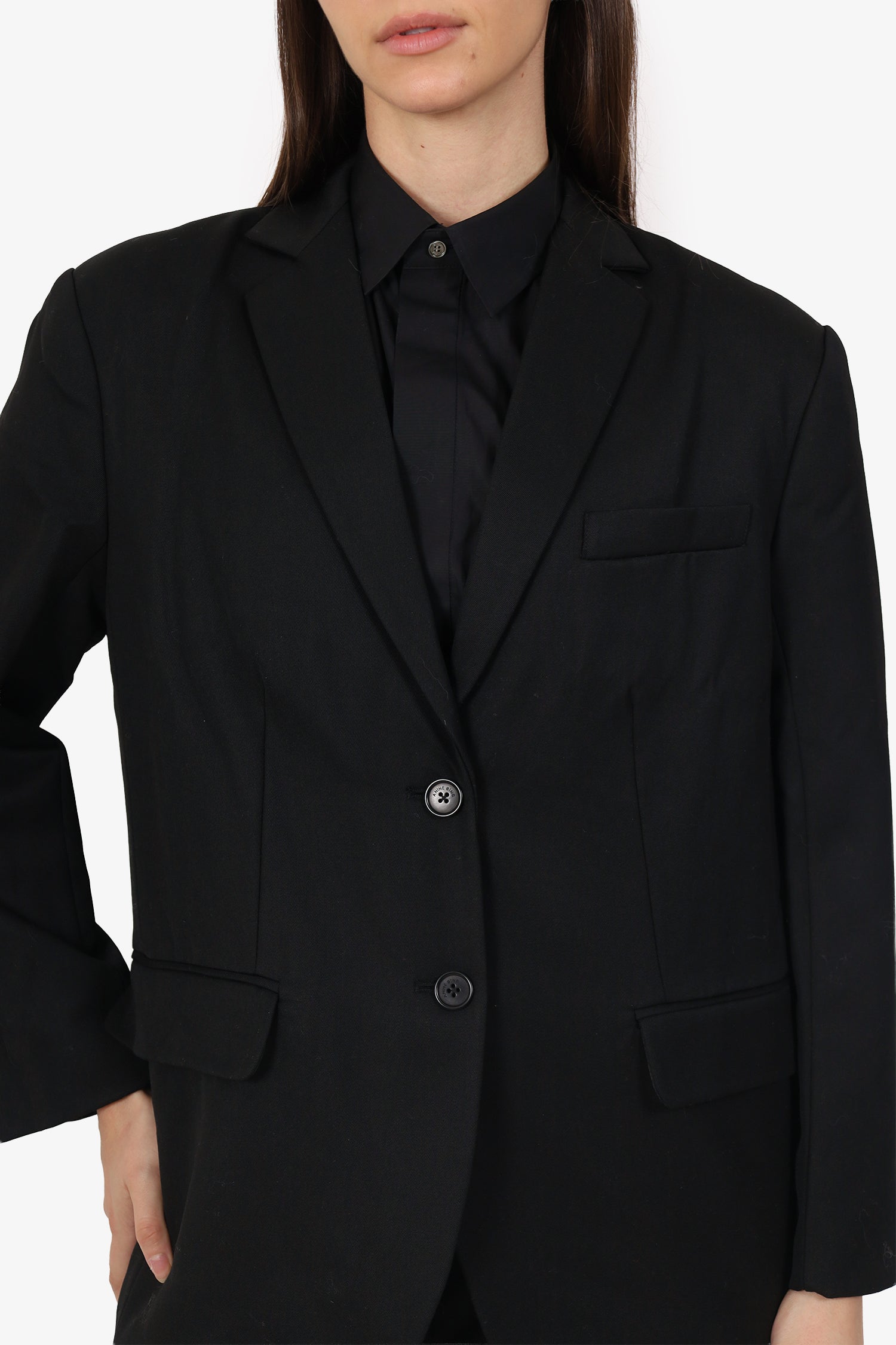 Refresh availabilityAnine Bing Black Quinn Blazer. Pull-on. Notch lapel. Front button-up closure. Padding to shoulders. 3 exterior pockets; 1 chest, and 2 front fold-over flap. Lined interior. Tonal stitching.