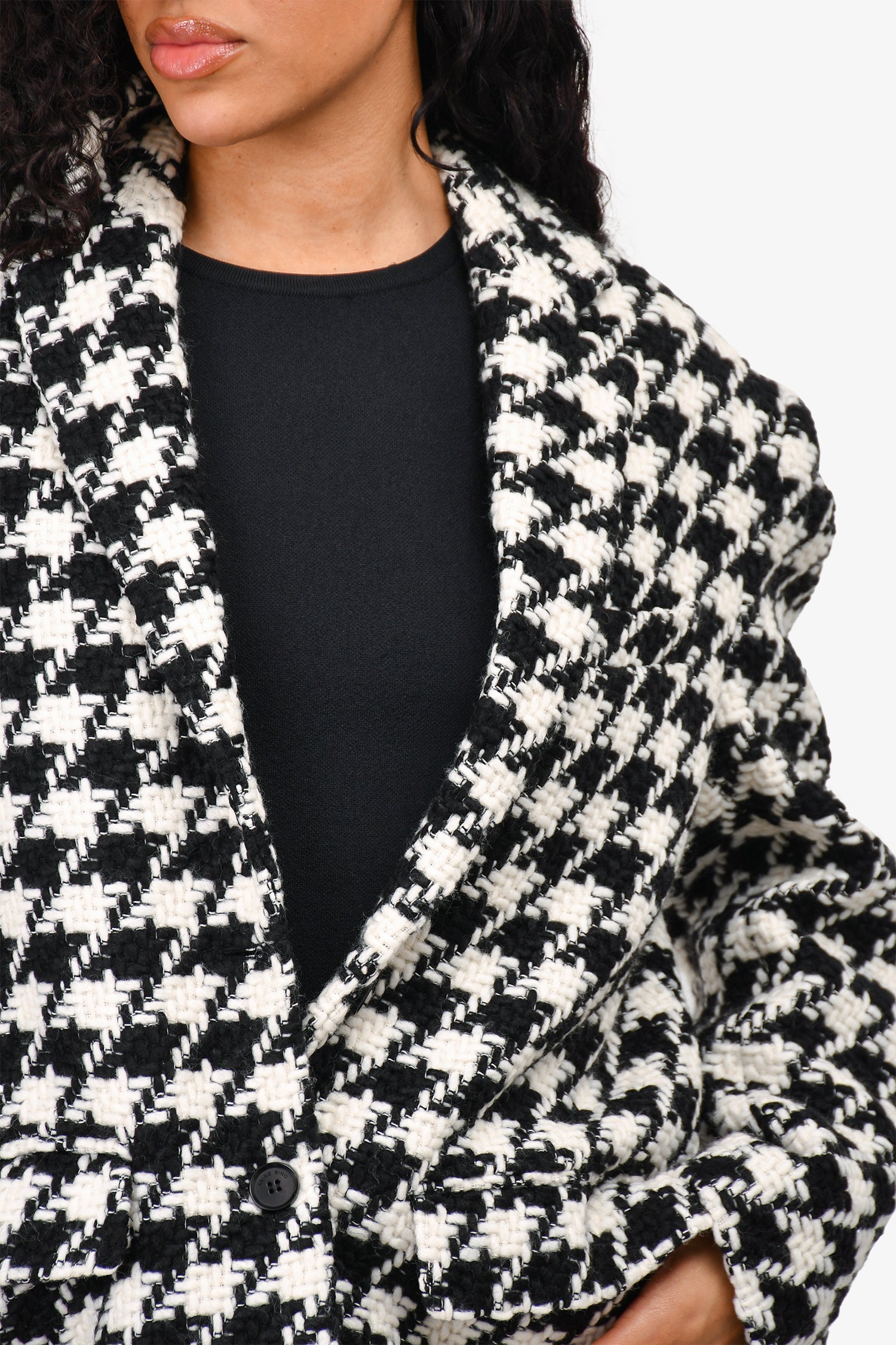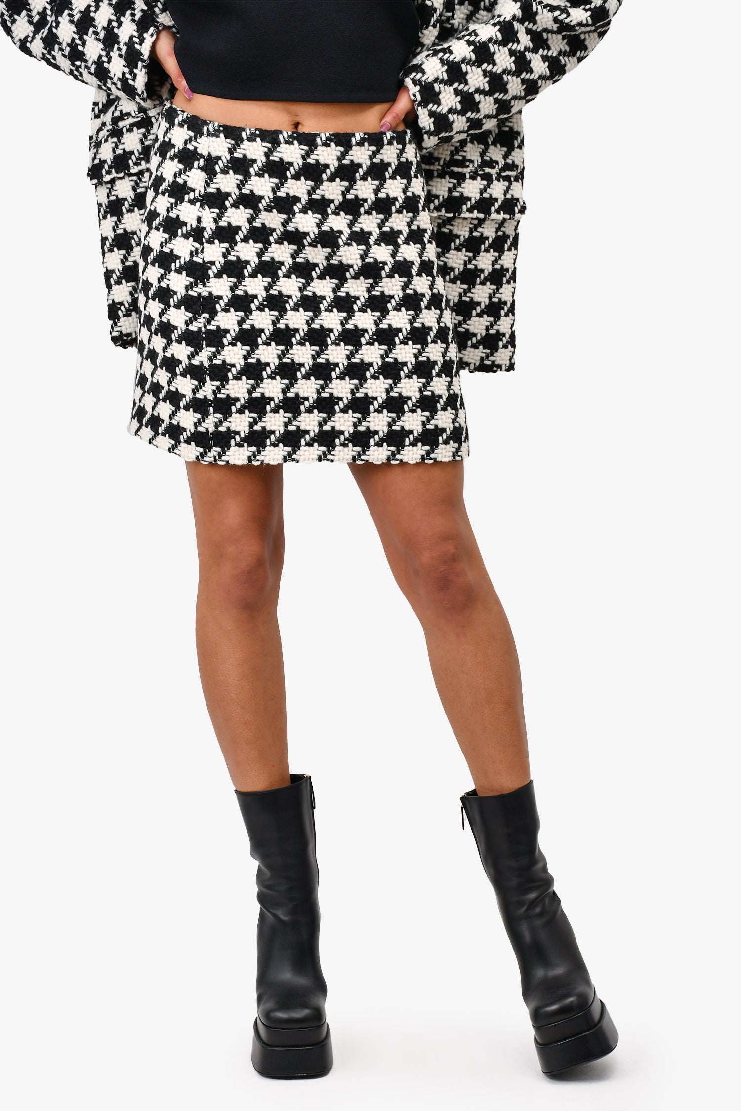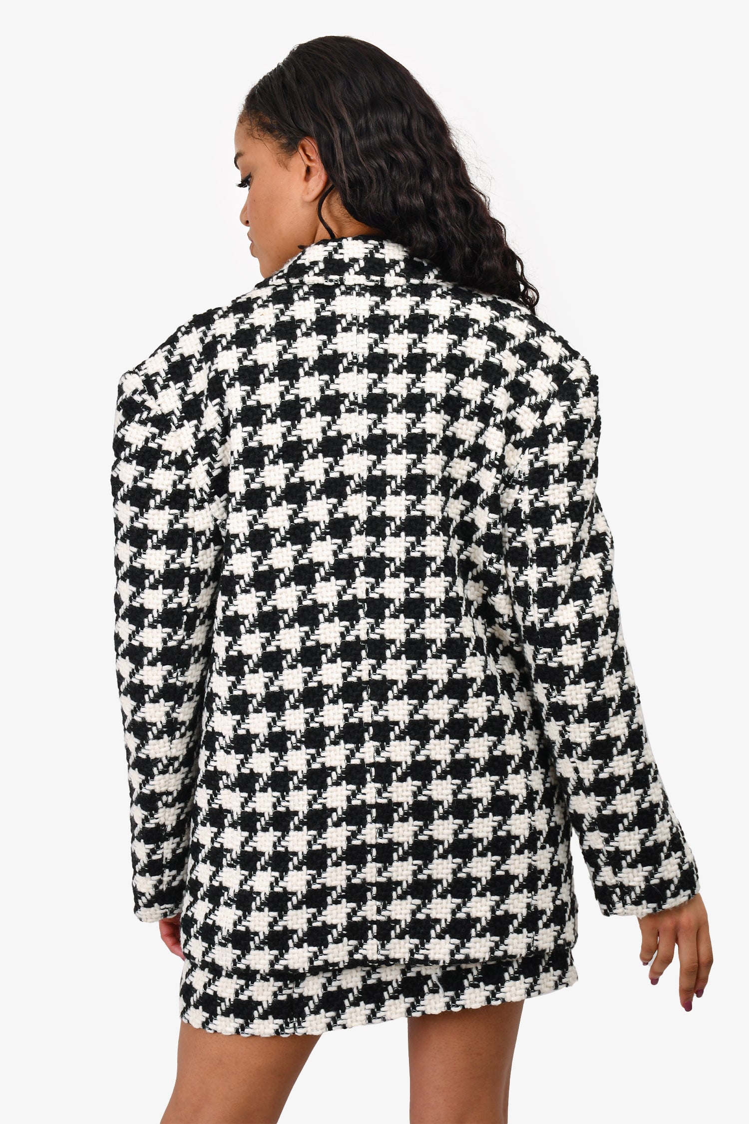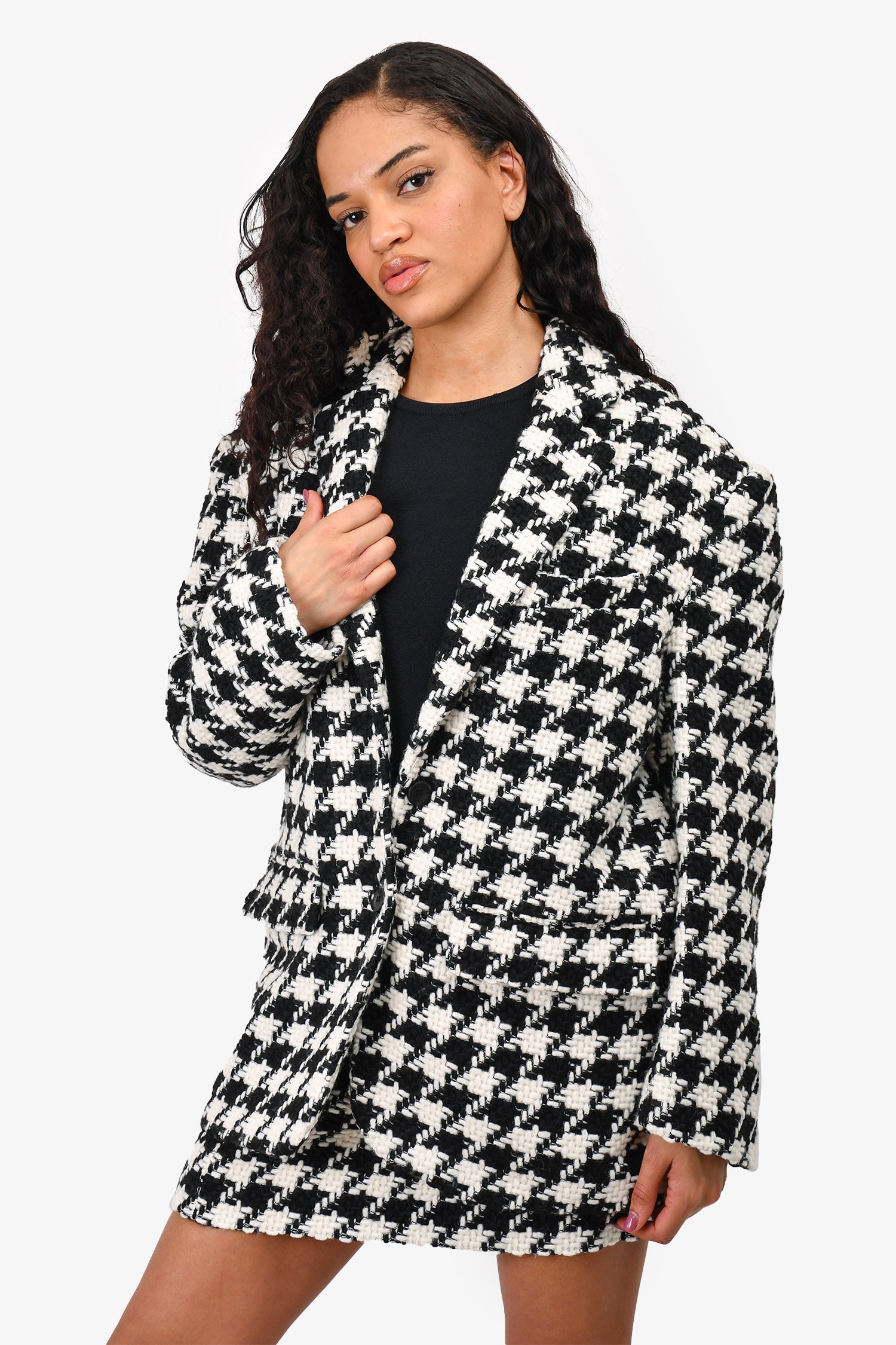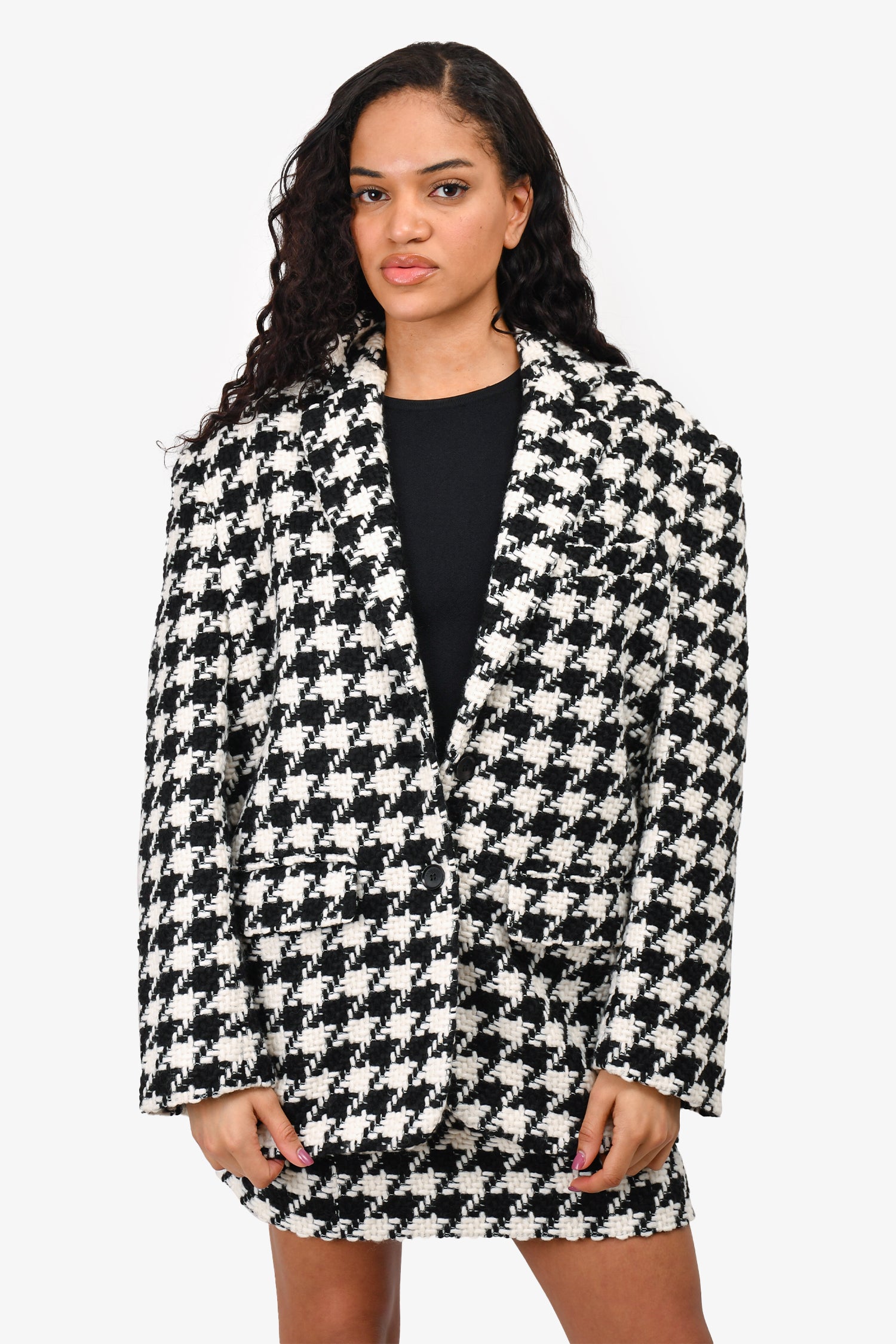 Refresh availabilityAnine Bing Black/White Herringbone Blazer + Skirt Set. Blazer: Front button-up closure. Front pockets. Lined. Padded shoulders. Skirt: Side zip and hook closure. Lined.