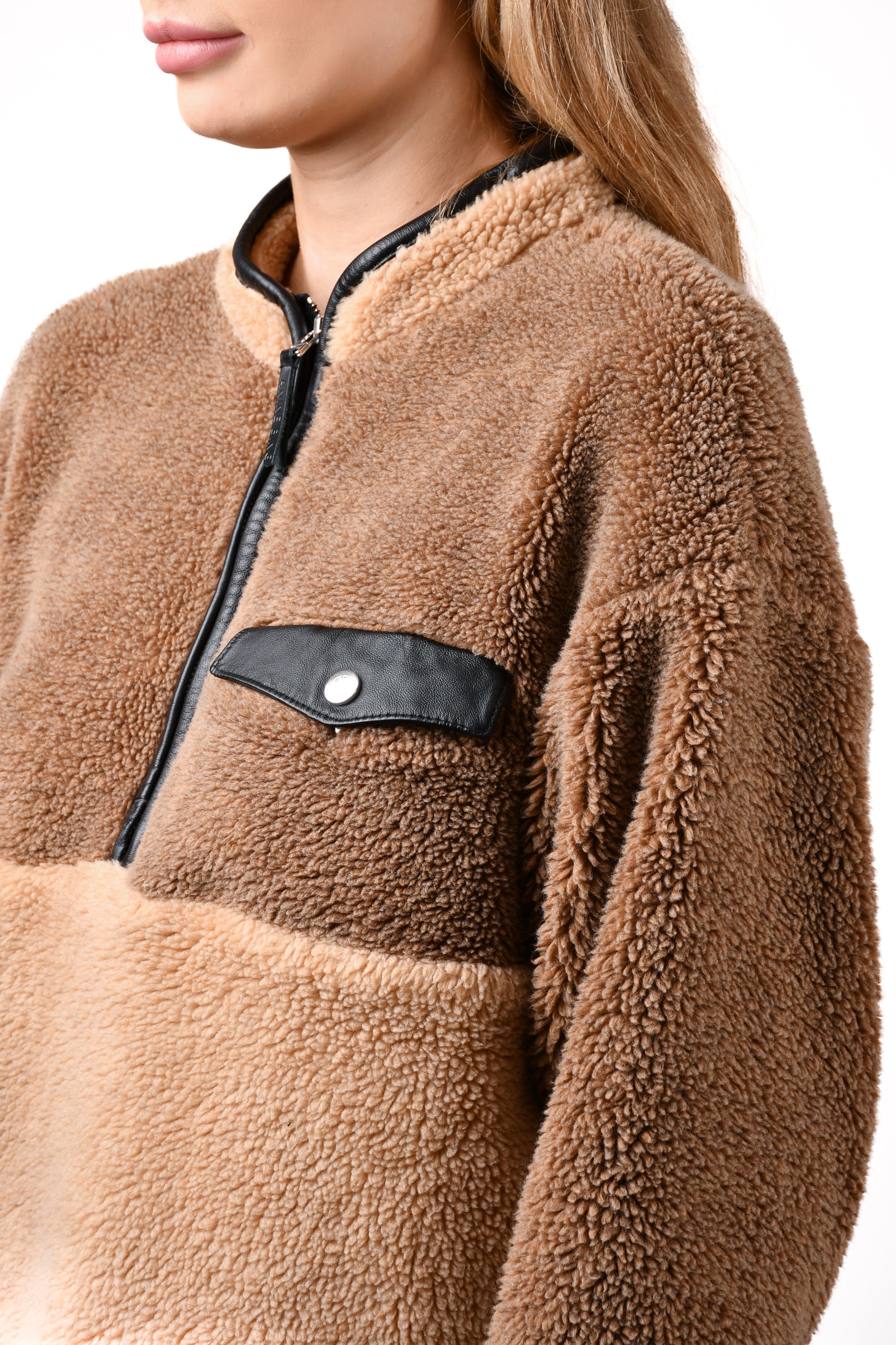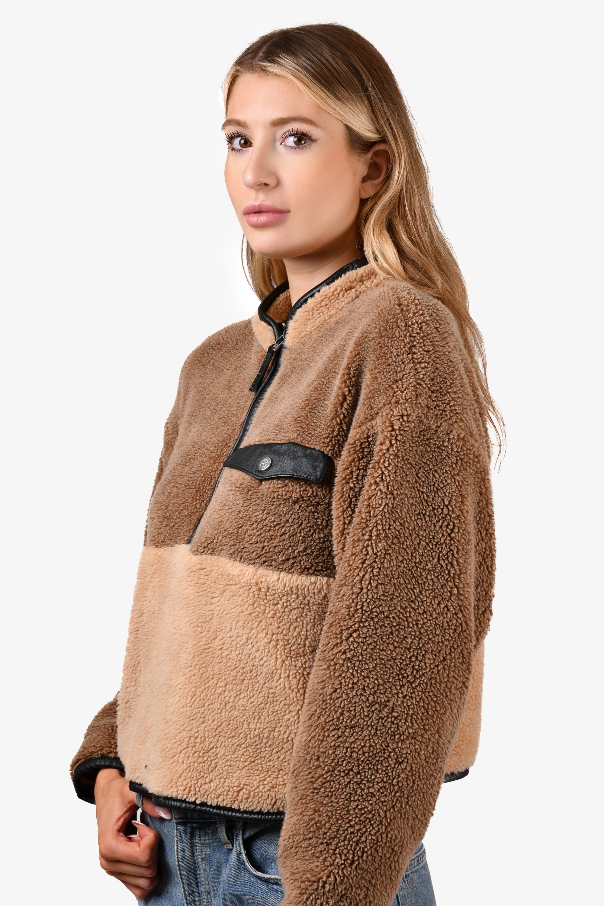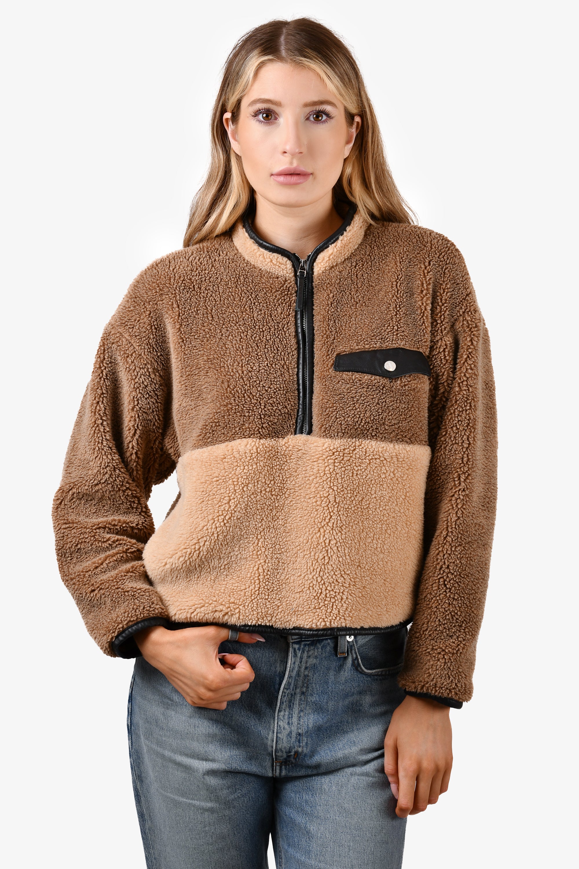 Refresh availabilityAnine Bing Two Tone Brown Teddy Sweater. Pull-on. 3/4 zip closure. Front pockets. Single front chest pocket with snap-button closure. Contrasting black leather trims on the neck, single chest pocket, cuffs and hem. Lined. Tonal stitching.