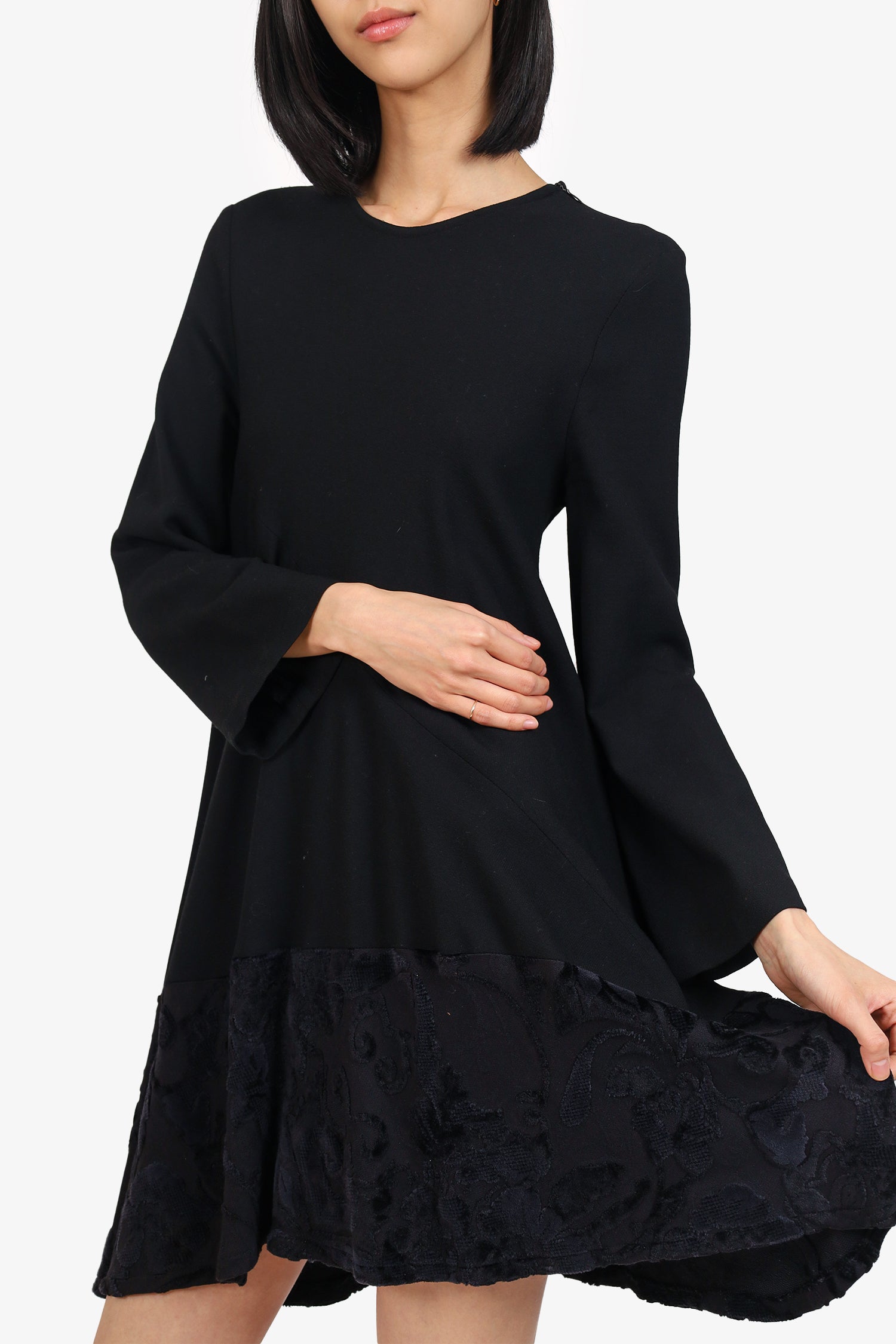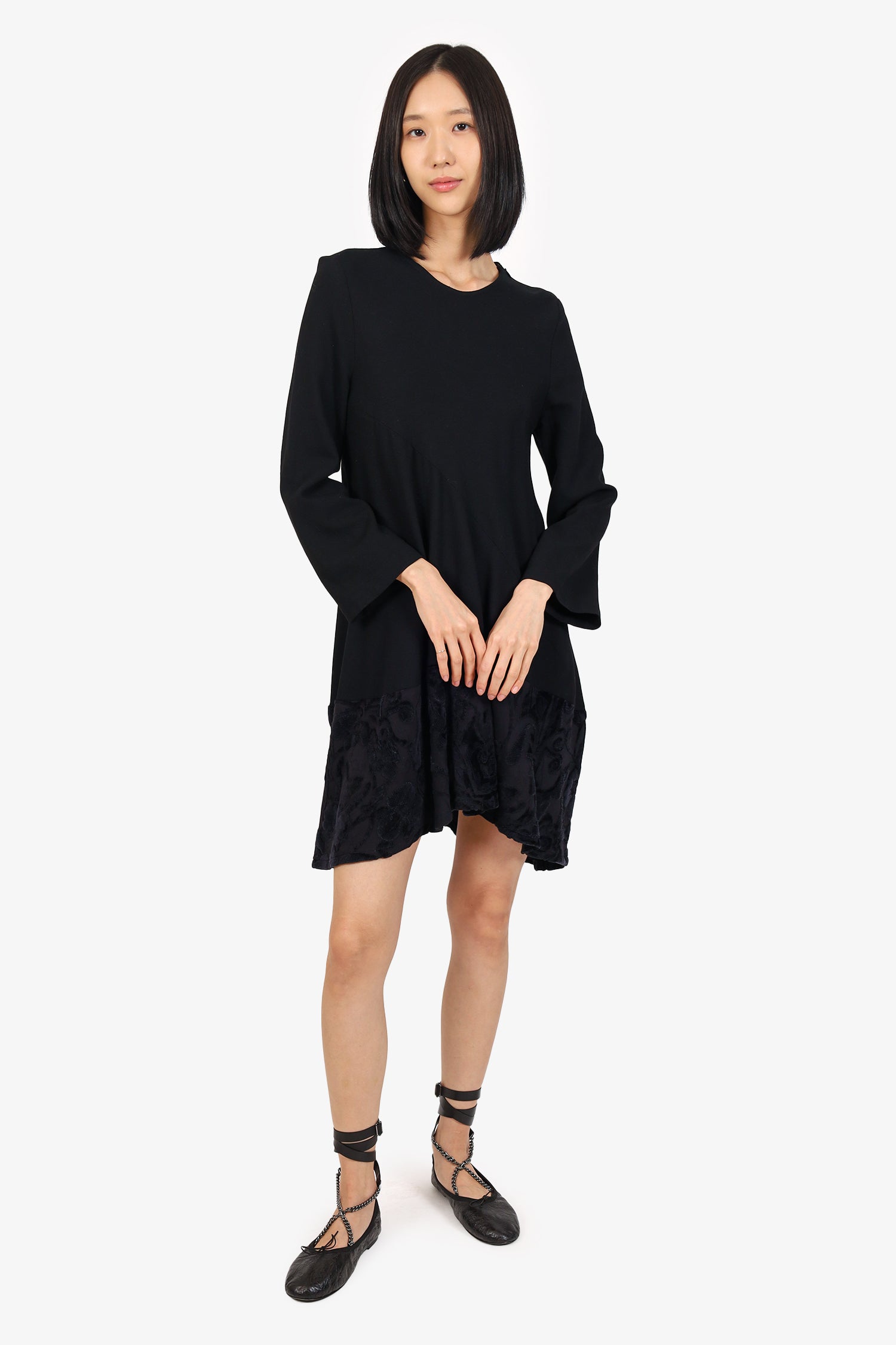 Refresh availabilityAnn Demeulemeester Black Long Sleeve Velvet Hem Dress. Pull-on. Round-neckline. Zip closure left of neckline. Tonal stitching.
