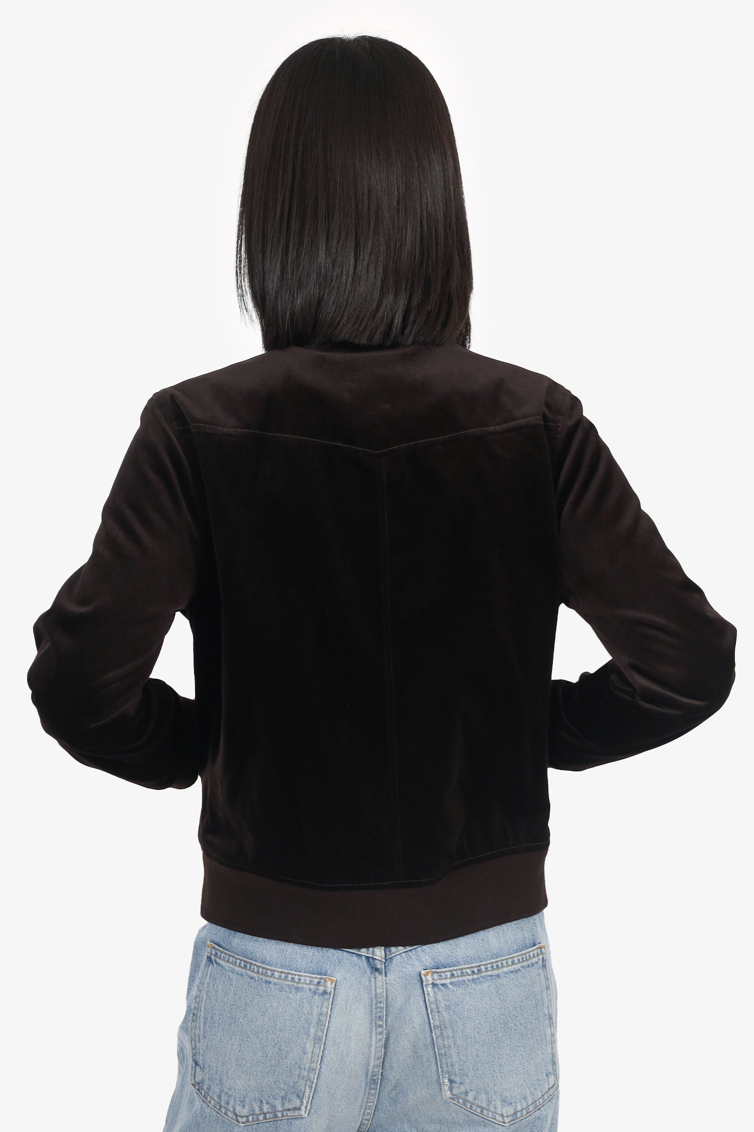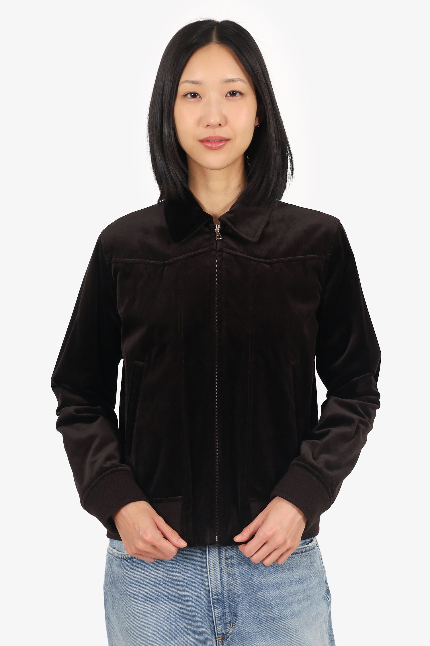 Refresh availabilityA.P.C Black Velvet Candem Jacket. Pull-on. Collared neckline. Front zip closure. 2 exterior front slip pockets. Lined interior. Silver-tone hardware. Tonal stitching.
