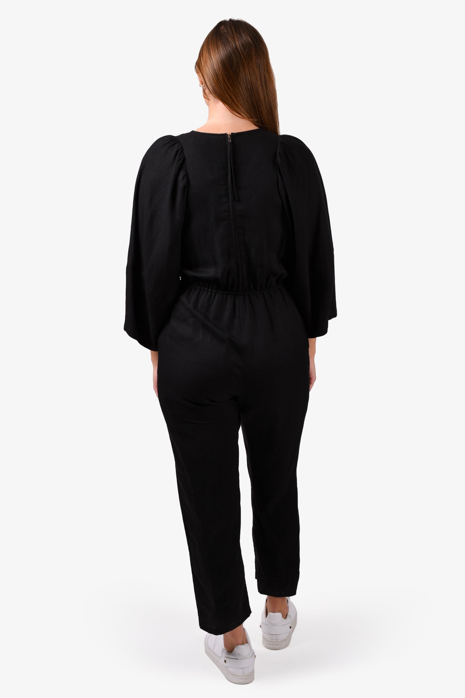 Refresh availabilityApiece Apart Black Ruffle Sleeve Jumpsuit. V-neckline. Long-sleeved. Rear zip closure. Elasticized waist. Tonal stitching.