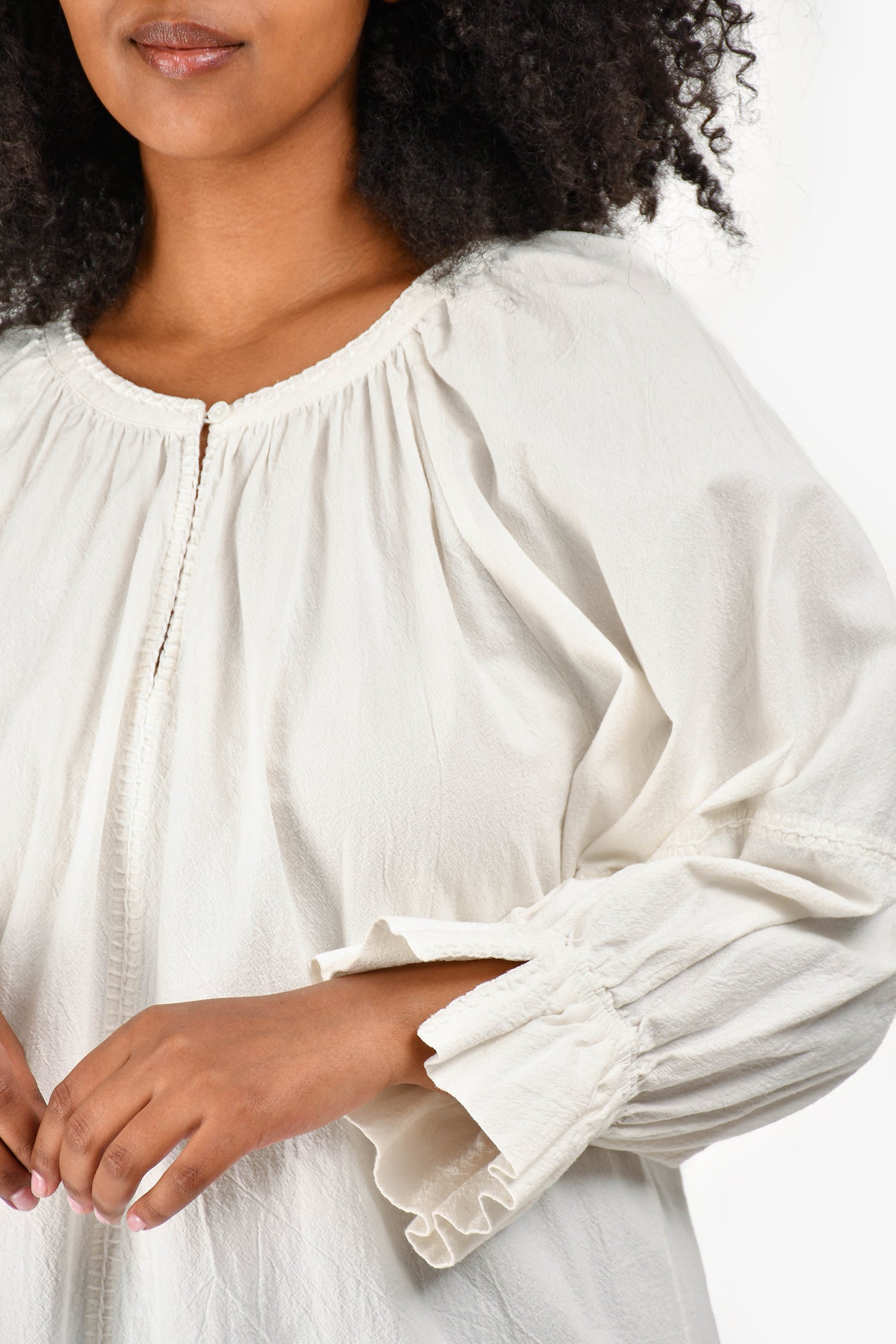 Refresh availabilityApiece Apart White Cotton Long Sleeve Mini Dress. Crew neckline. Long sleeves with elastic cuffs. Front single button closure an cutout detail. Tonal stitching.