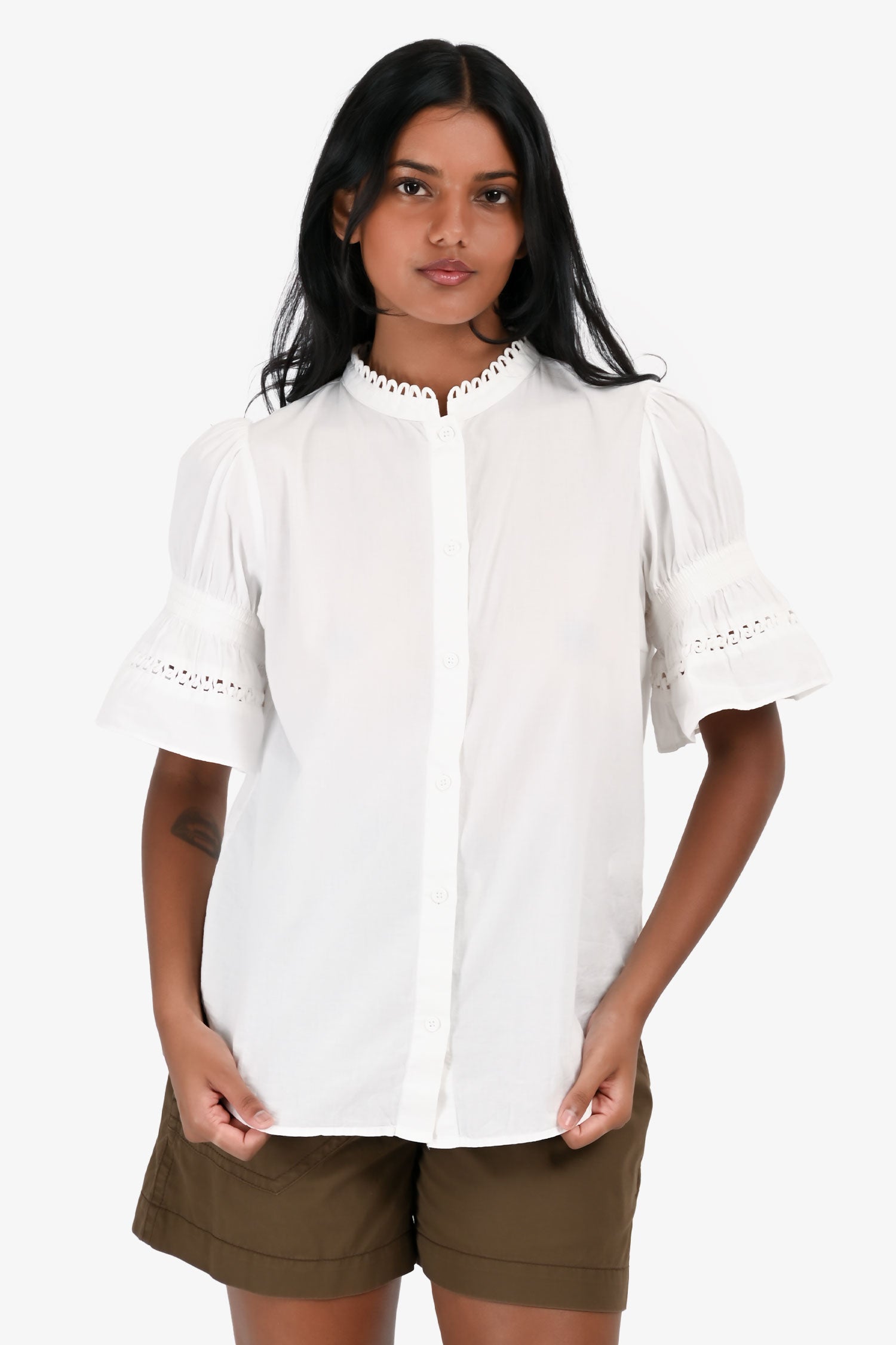 Refresh availabilityApiece Apart White Flared Button-Up Blouse. Trim detail on the collar and sleeves.