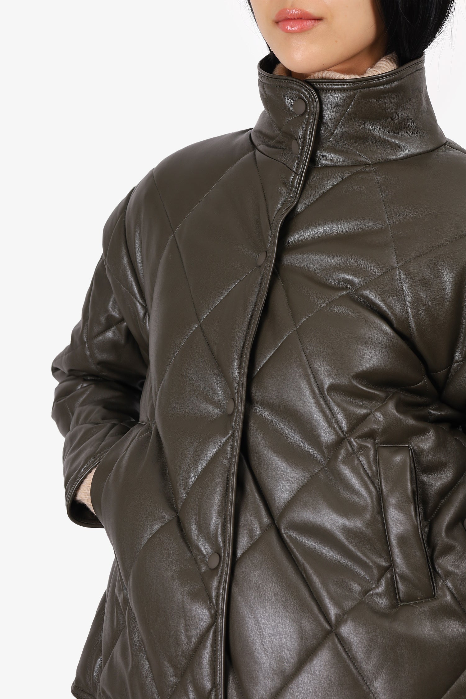 Refresh availabilityApparis Khaki Faux Leather Quilted Puffer Jacket. Two side slip pockets. Buttoned side detailing. Silver-tone hardware. Lined. Tonal stitching.