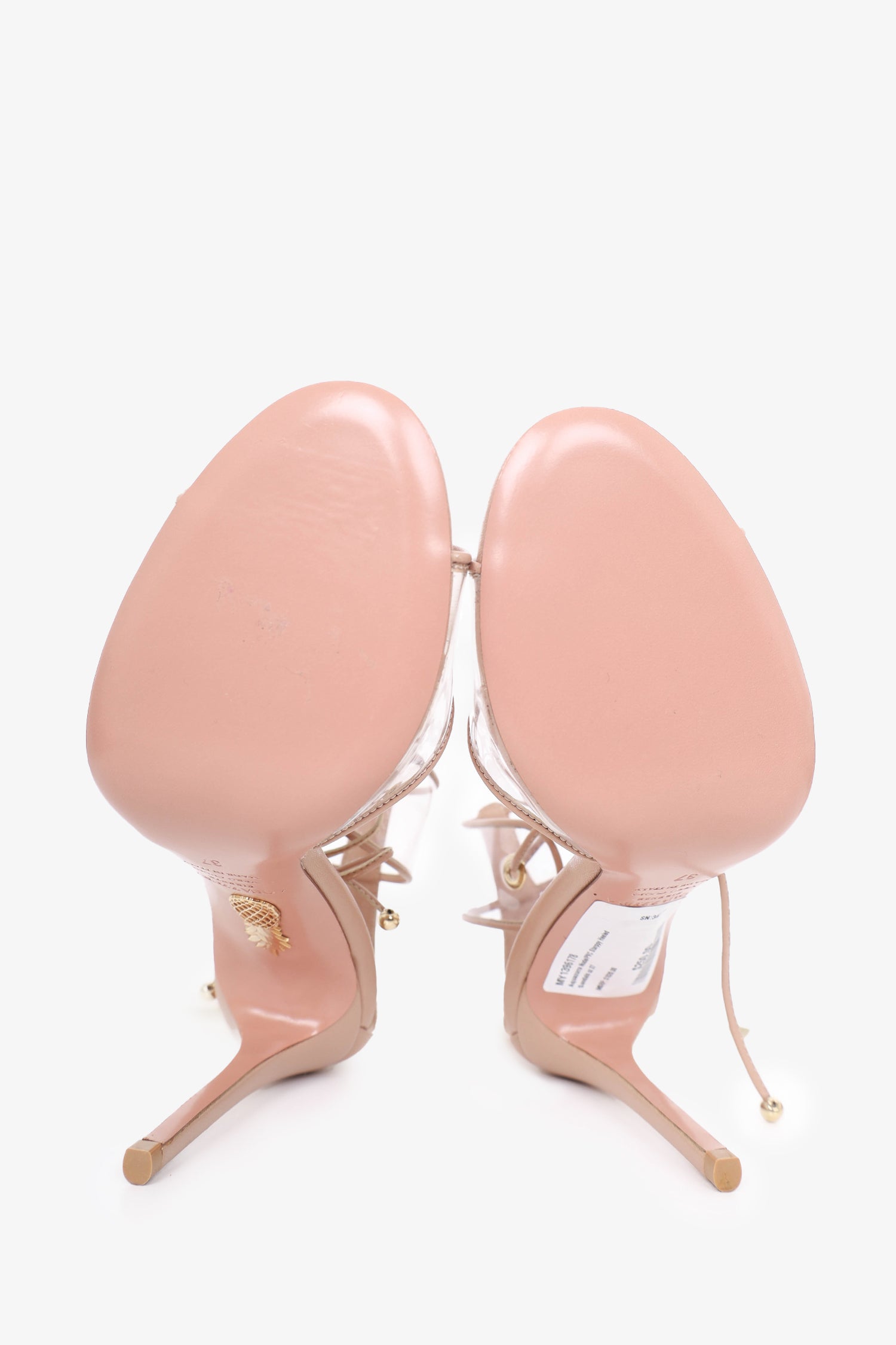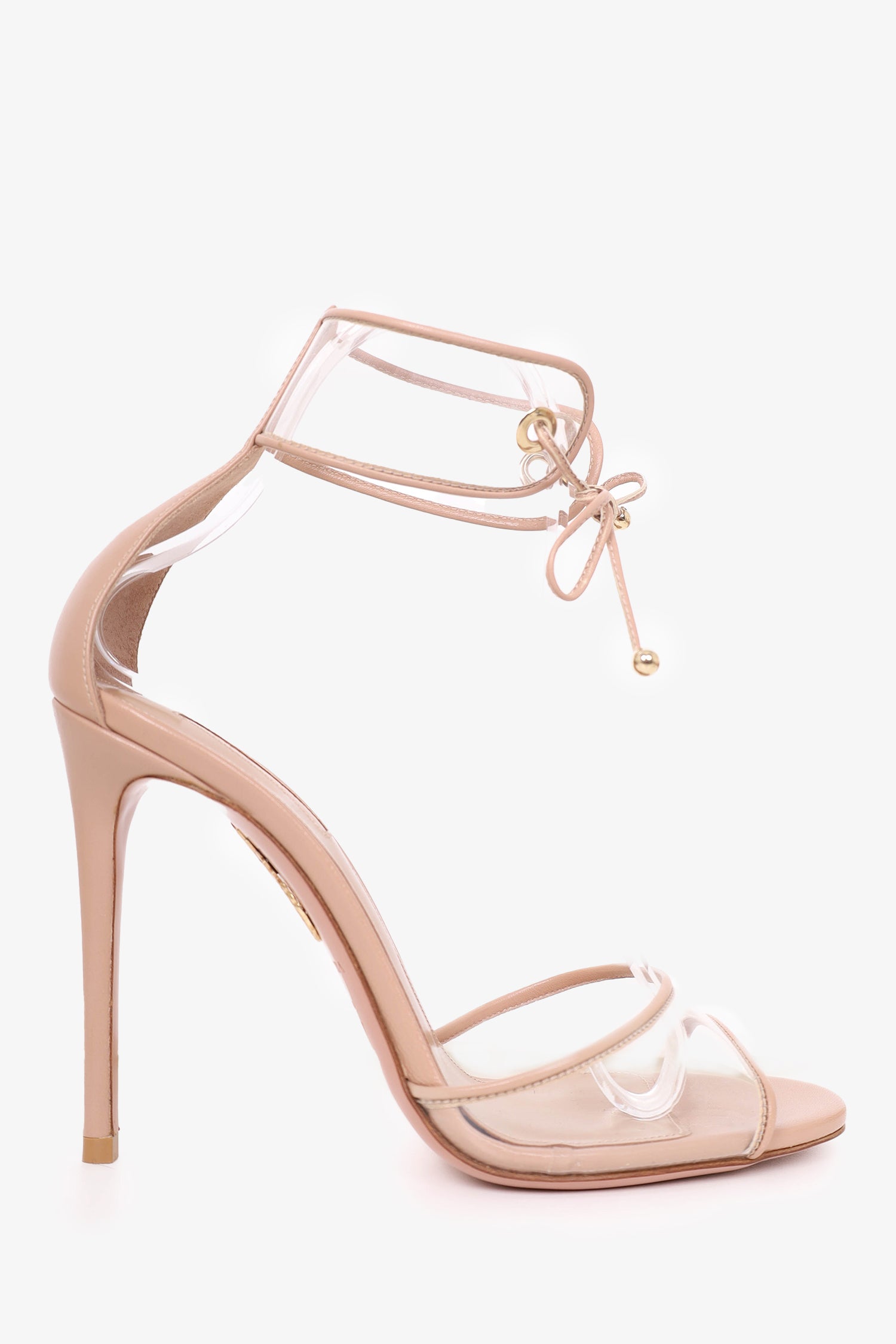 Refresh availabilityAquazurra Nude/PVC Strappy Heeled Sandals. Lace-up ankle strap closure. Round open toe. Gold-tone hardware. Tonal stitching.