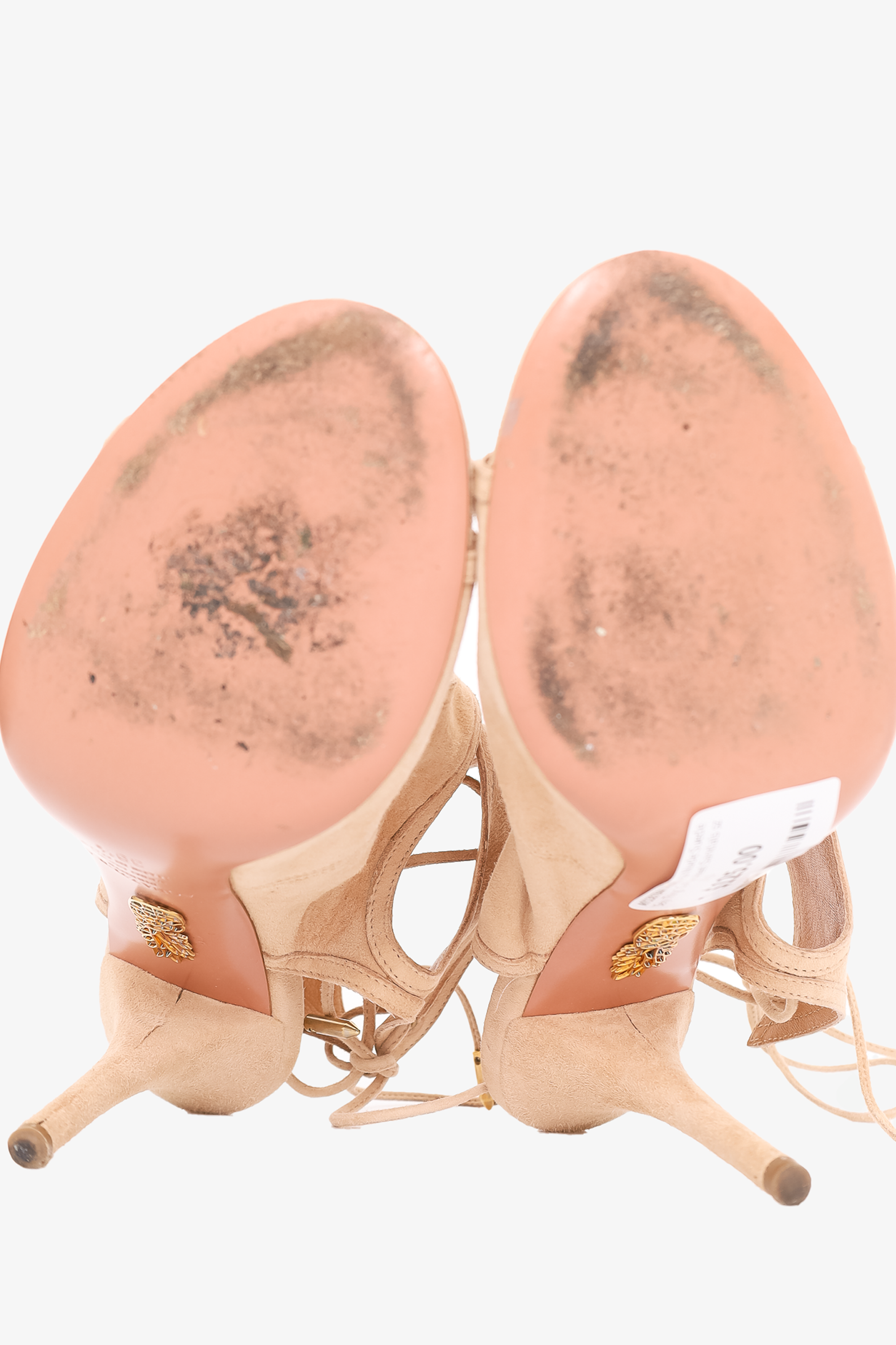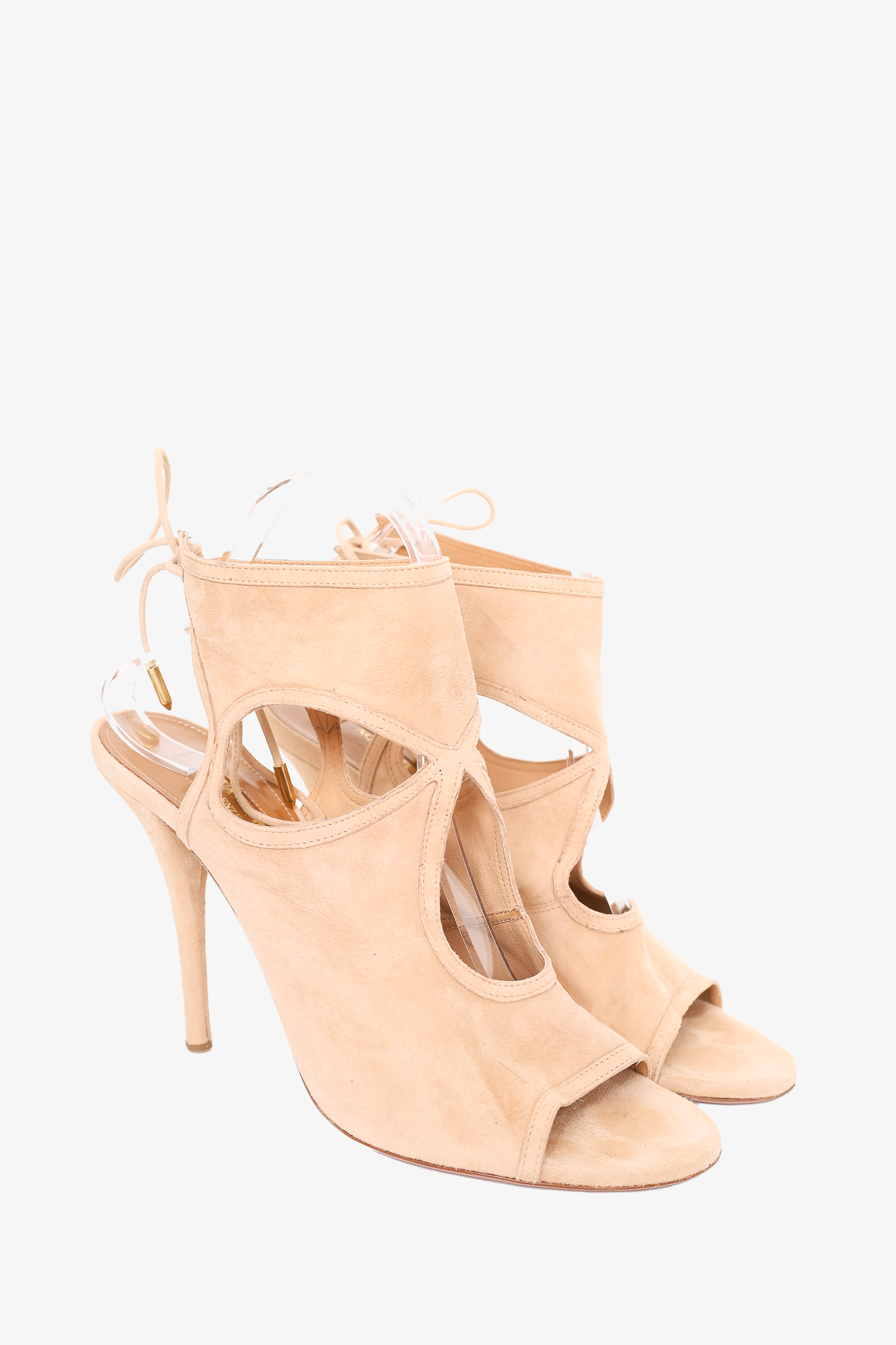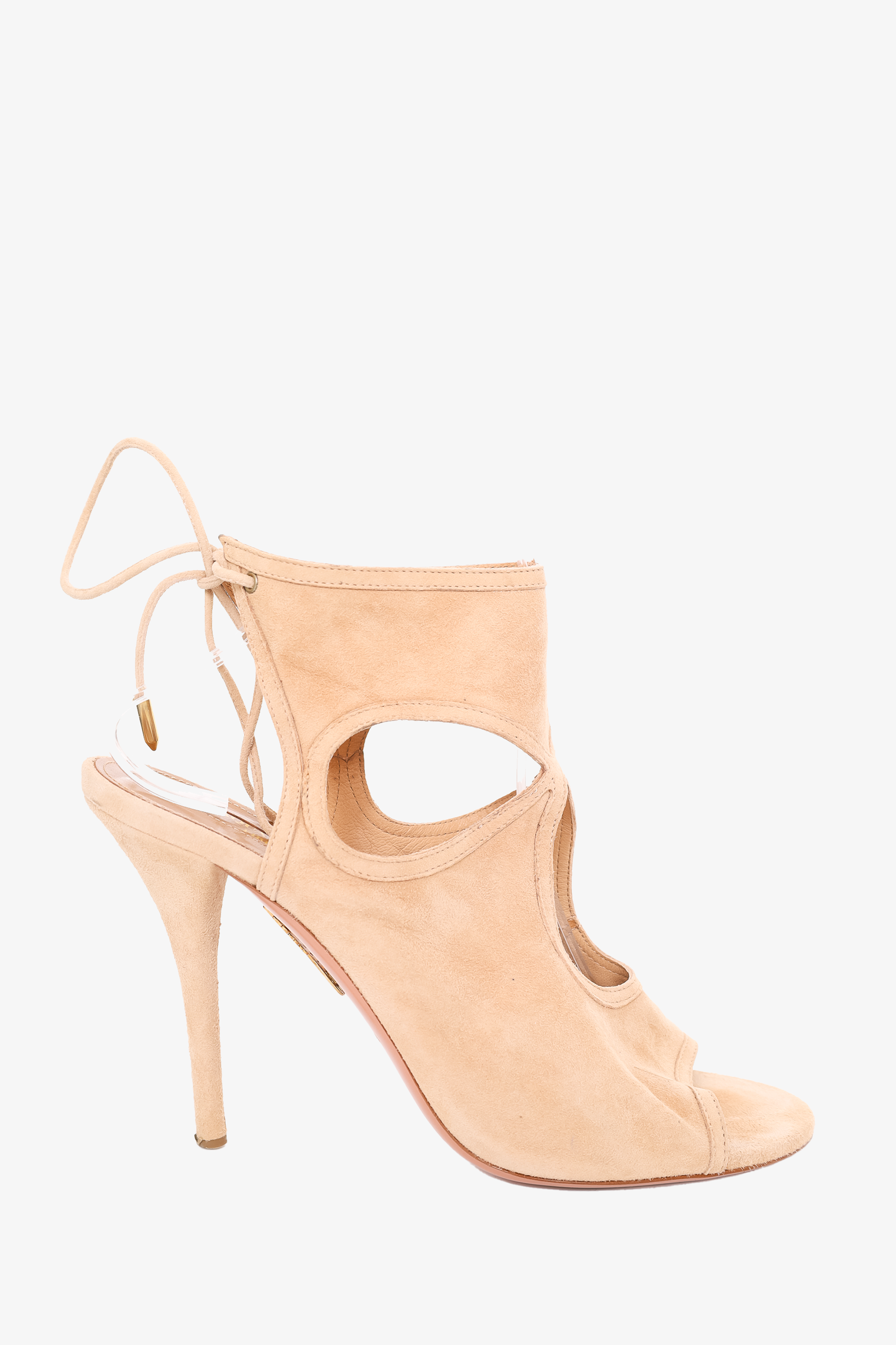 Refresh availabilityAquazurra Nude Suede 'Sexy Thing' Cut-out Heel Sandals. Round open-toe. Rear tie closure. Stiletto heel. Tonal stitching.
