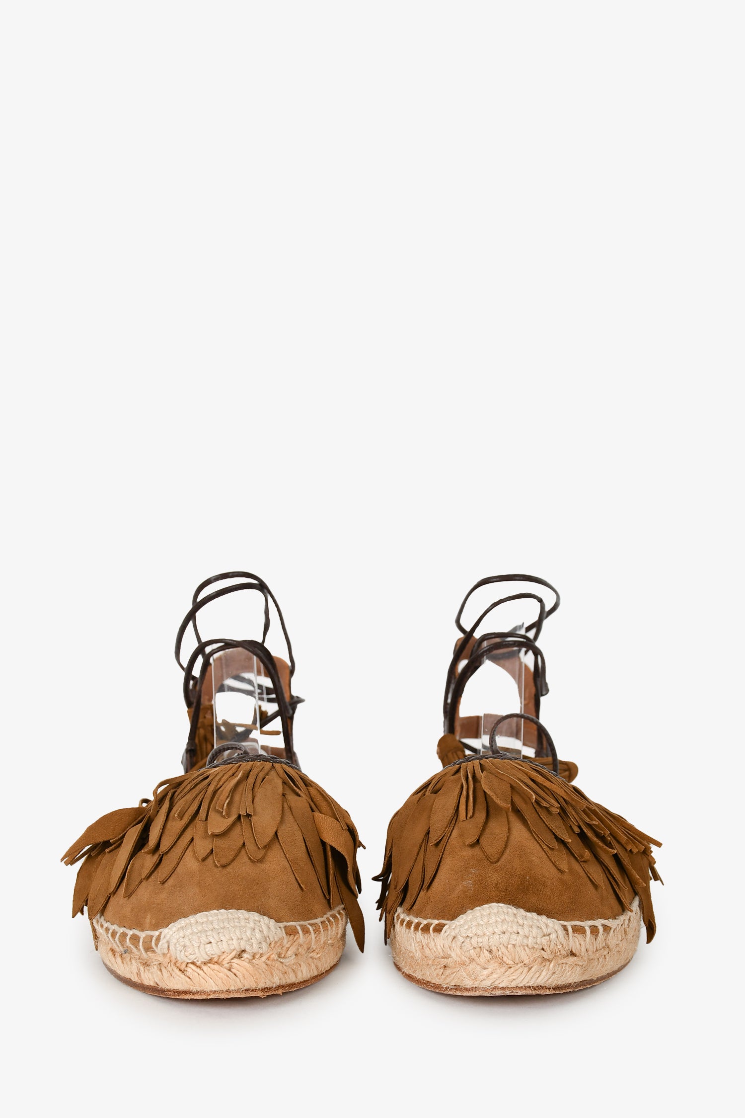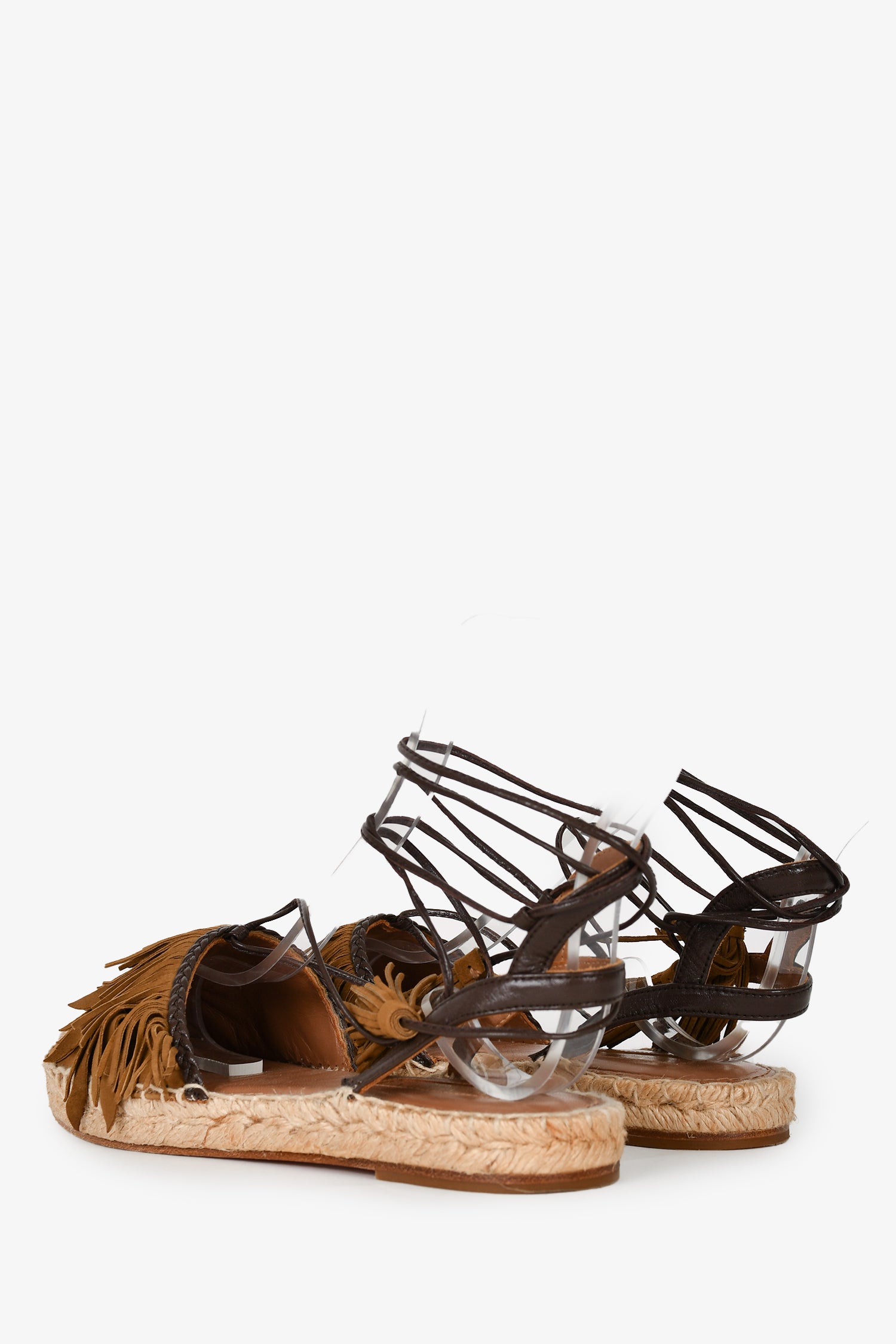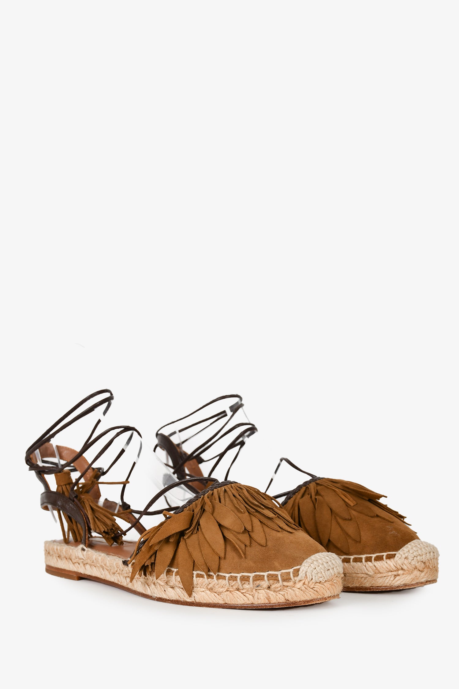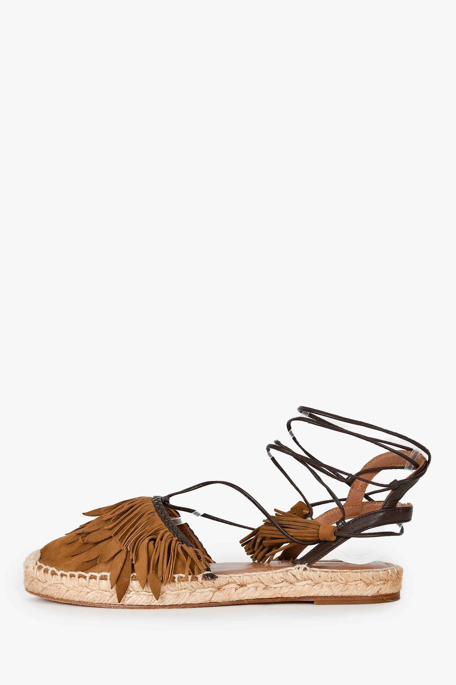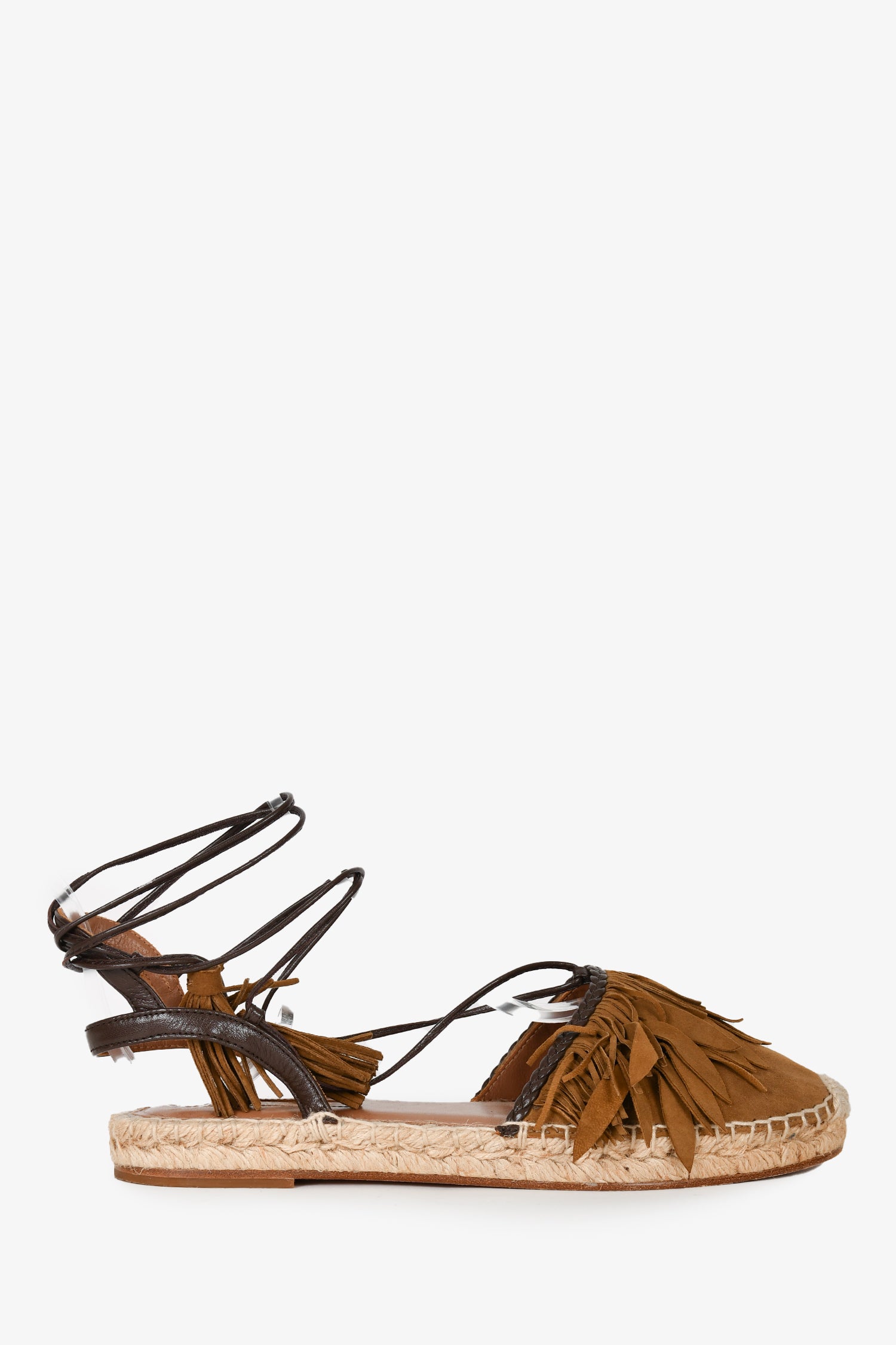 Refresh availabilityAquazurra Taupe Suede Fringe Espadrille Sandals. Open toe. Ankle strap with tie closure. Tonal stitching.