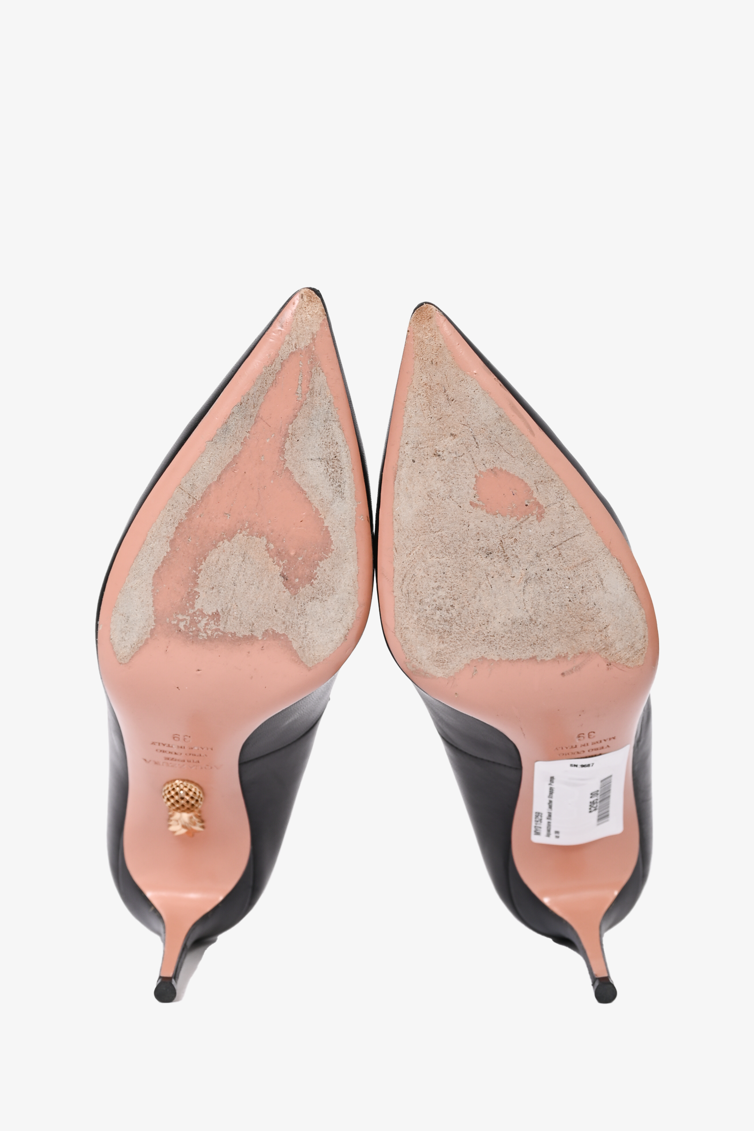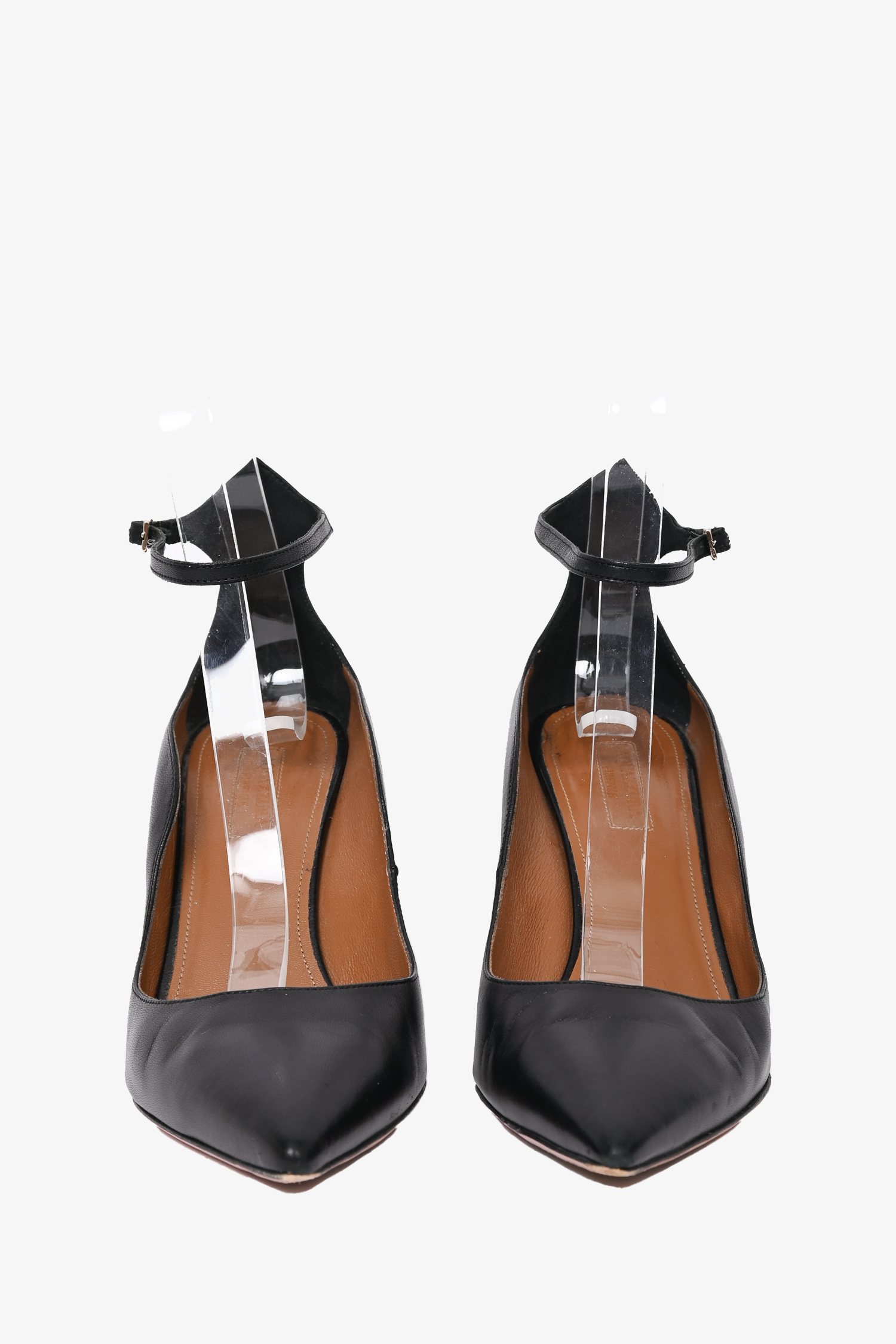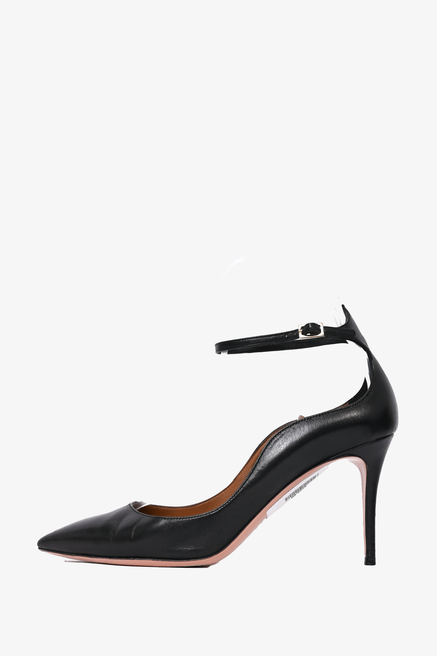 Refresh availabilityAquazzura Black Leather Strappy Pumps. Ankle strap closure. Pointed toe. Tonal stitching.