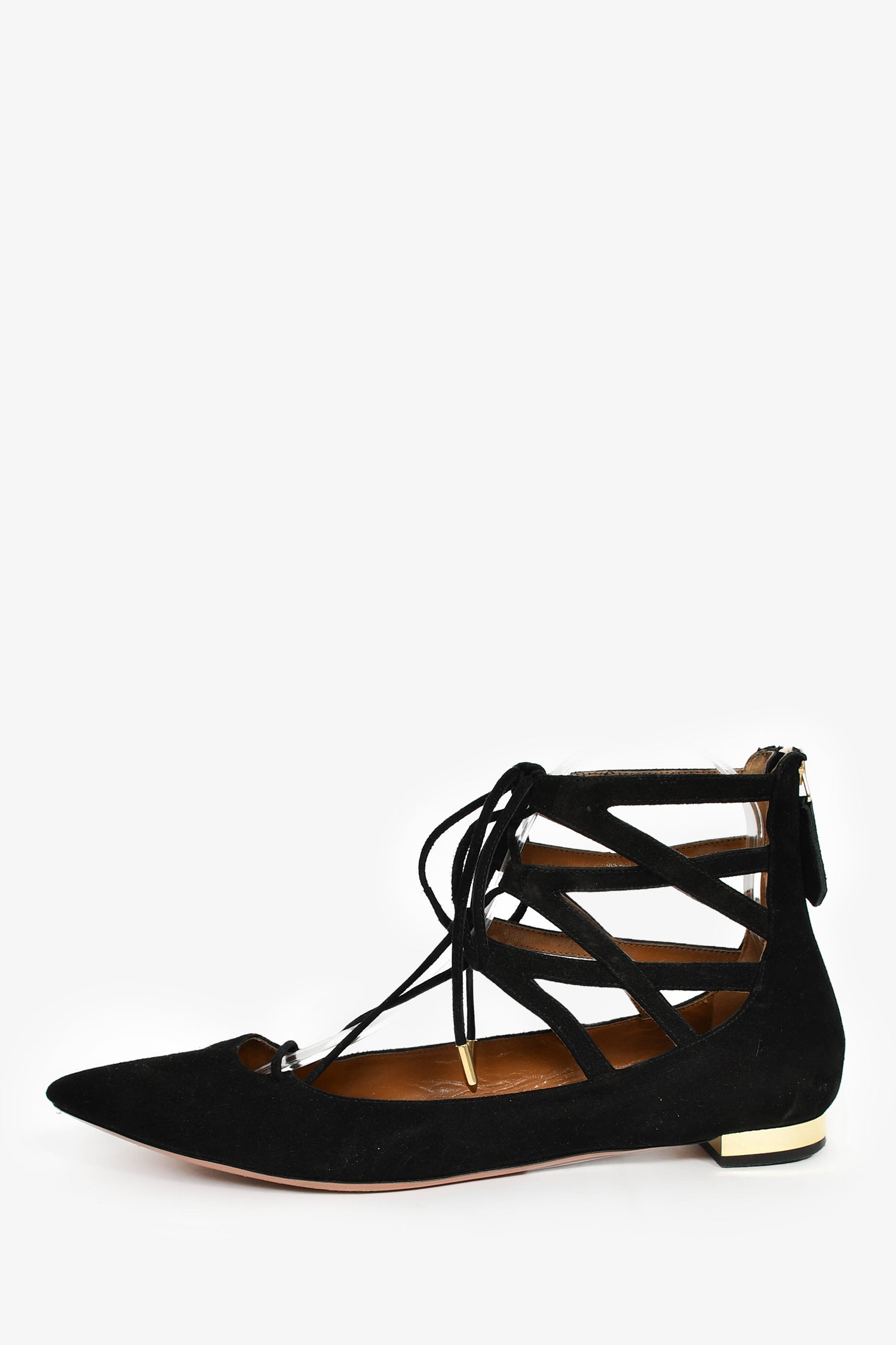 Refresh availabilityAquazzura Black Suede Pointed Tie Up Flats. Slip-on. Pointed toe. Front ankle tie-up closure. Gold-tone hardware. Tonal stitching.