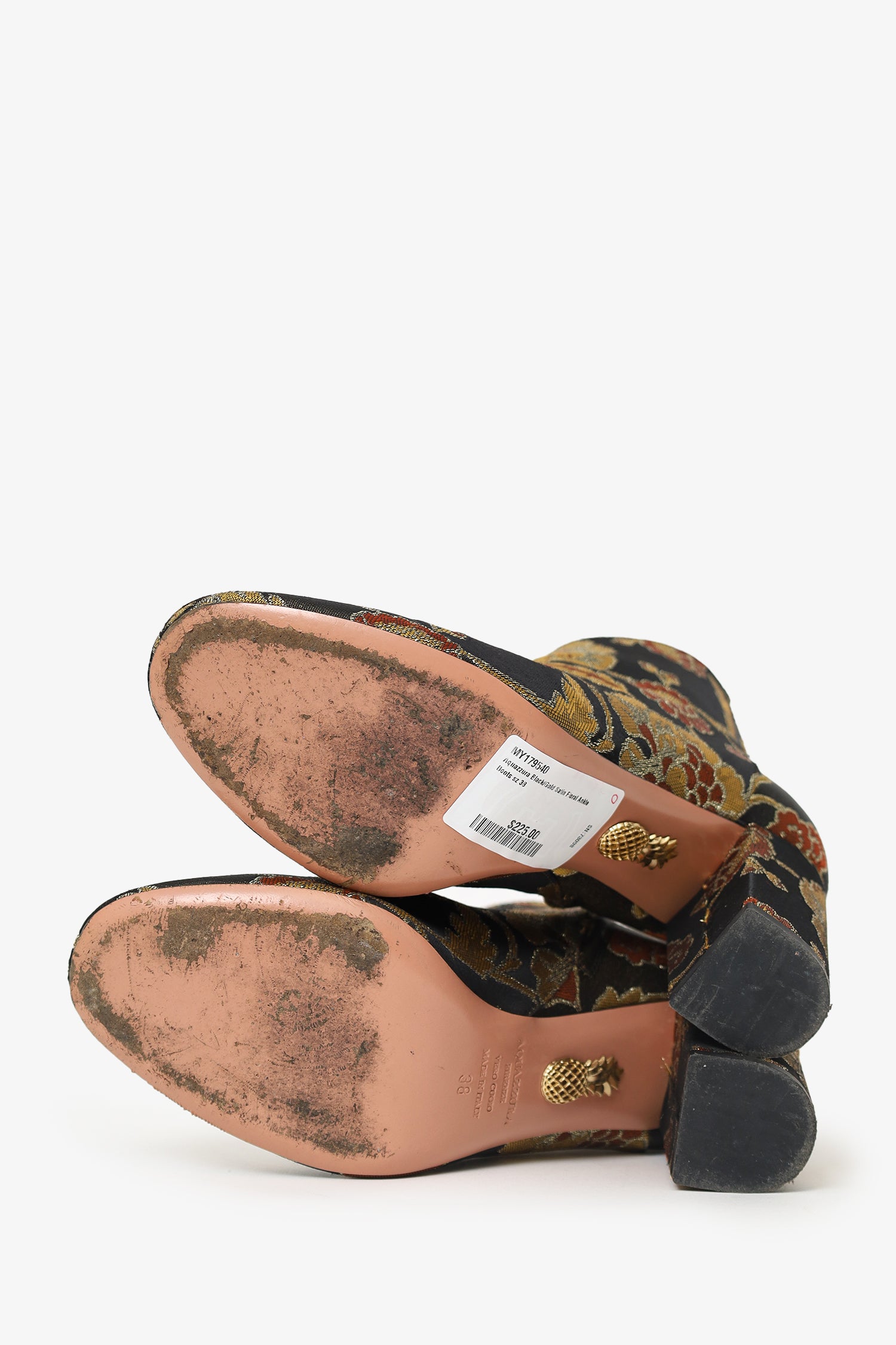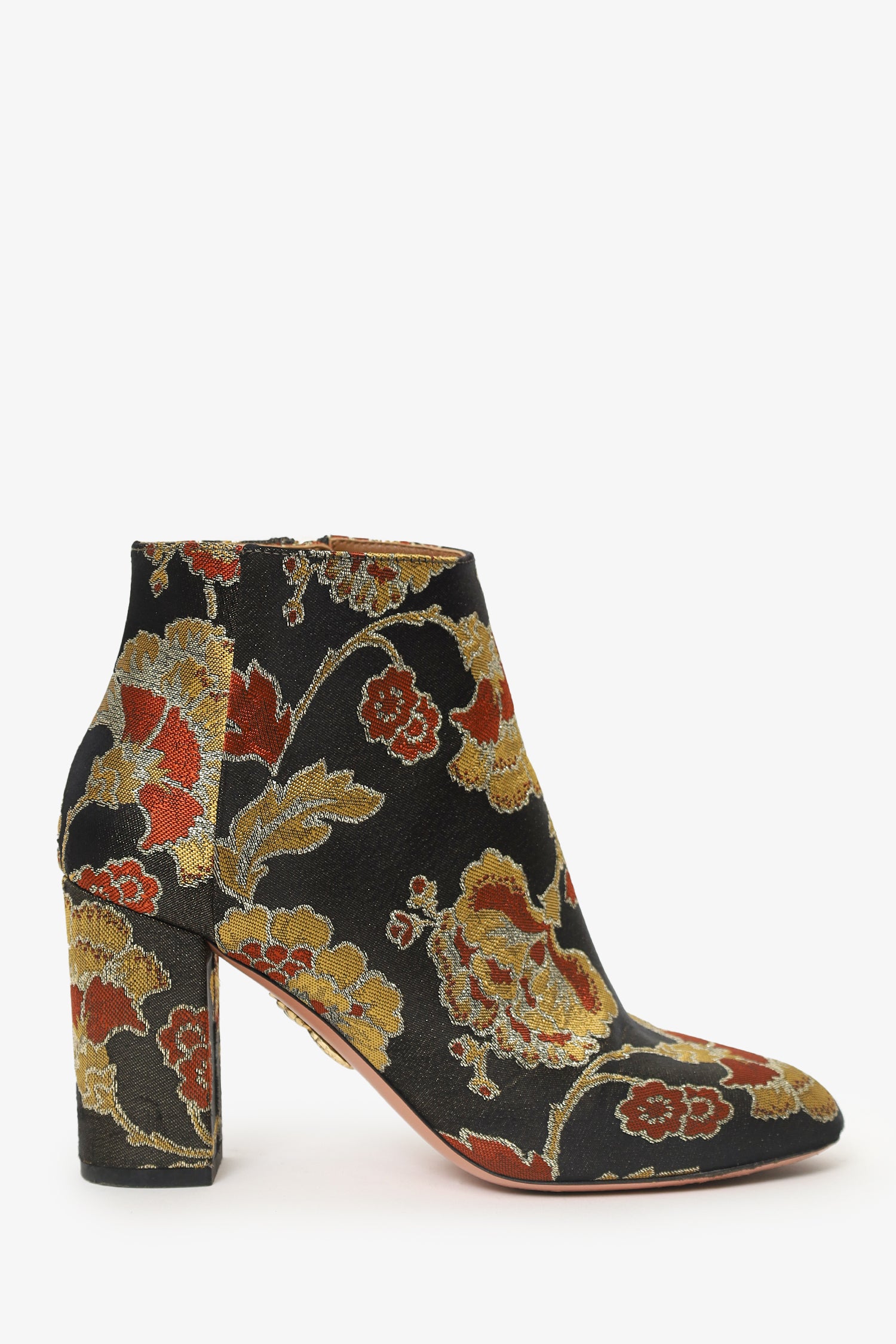 Refresh availabilityAquazzura Black/Gold Satin Floral Ankle Boots. Pull-on. Pointed toe. Side zip closure. Block heel. Lined interior Gold-tone hardware. Tonal stitching.