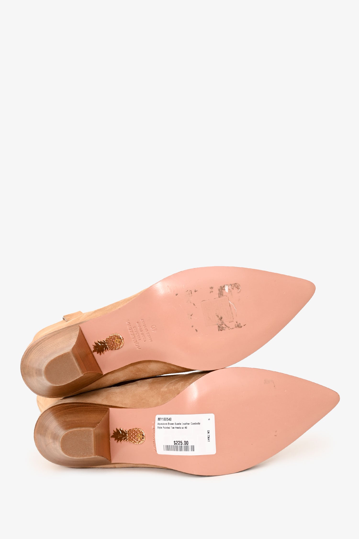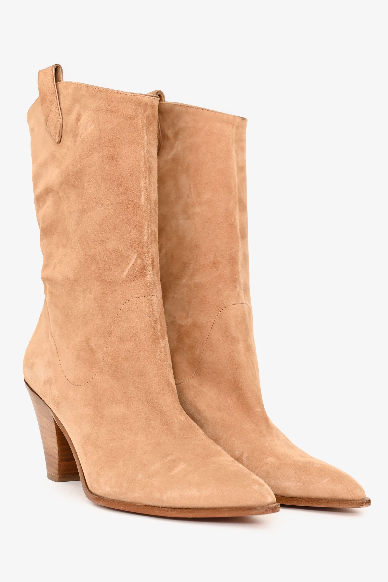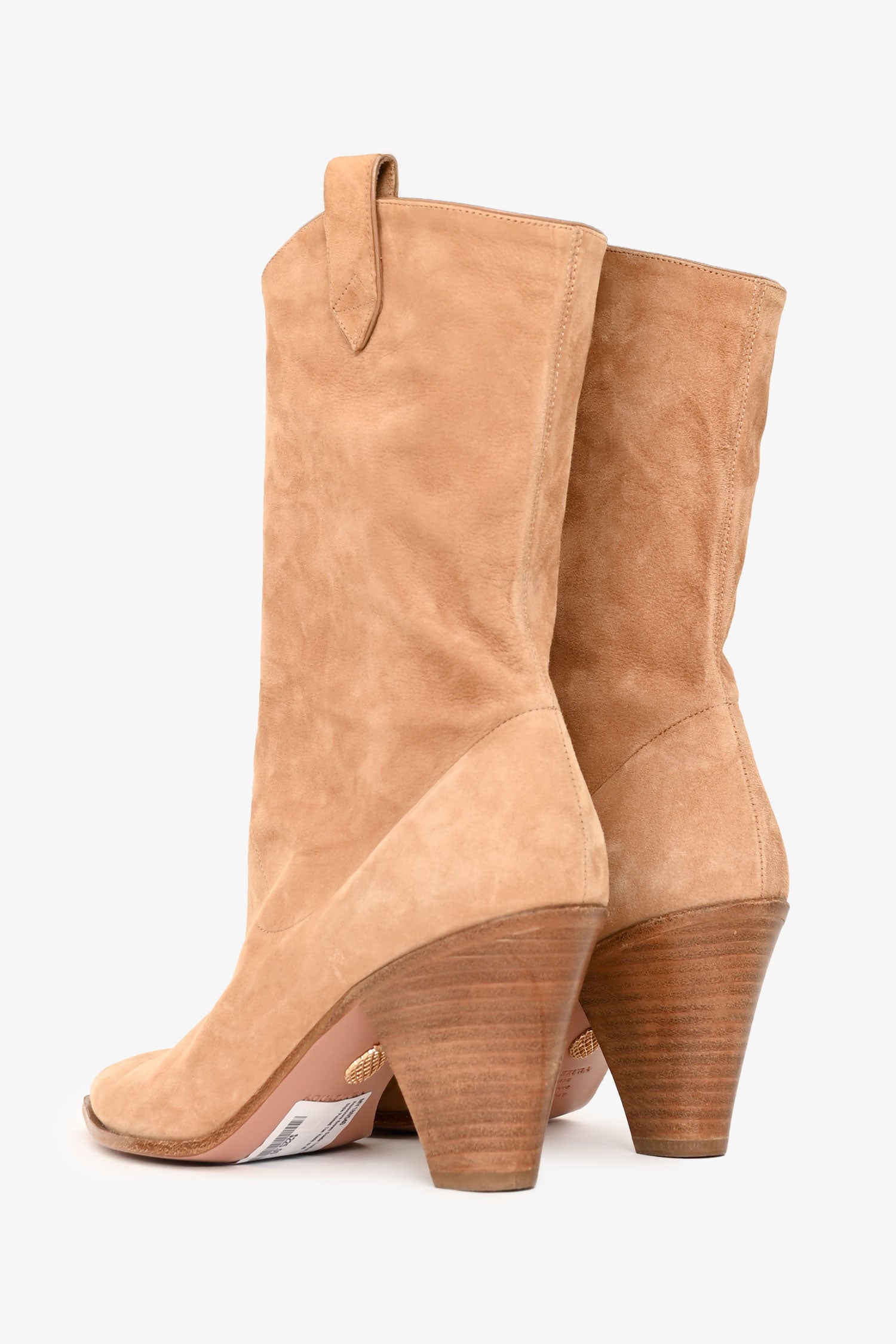 Refresh availabilityAquazzura Brown Suede Leather Cowboy Style Pointed Toe Heels. Pull-on. Pointed toe. Wooden cone heel. Tonal stitching.