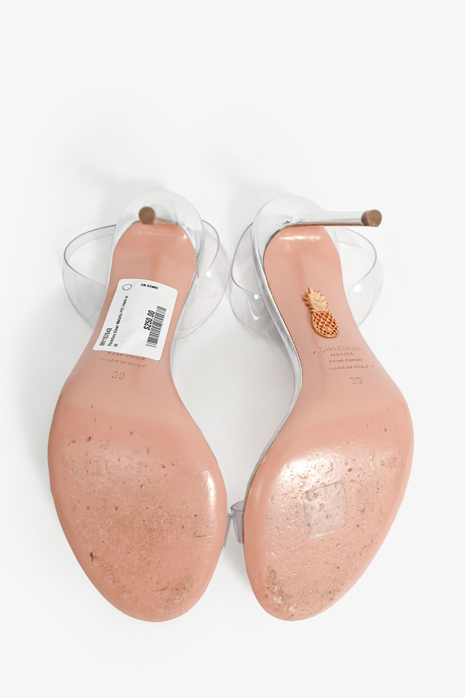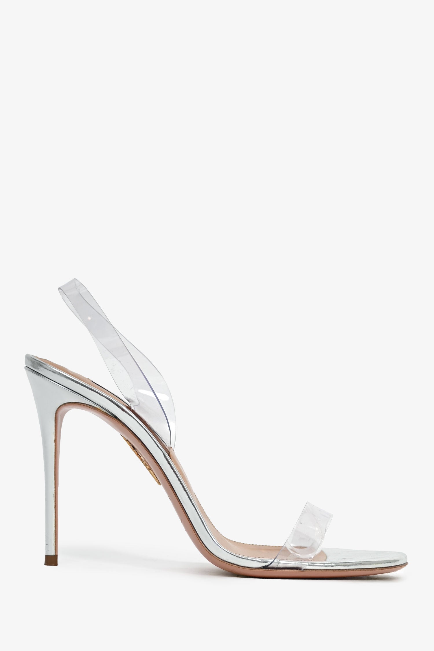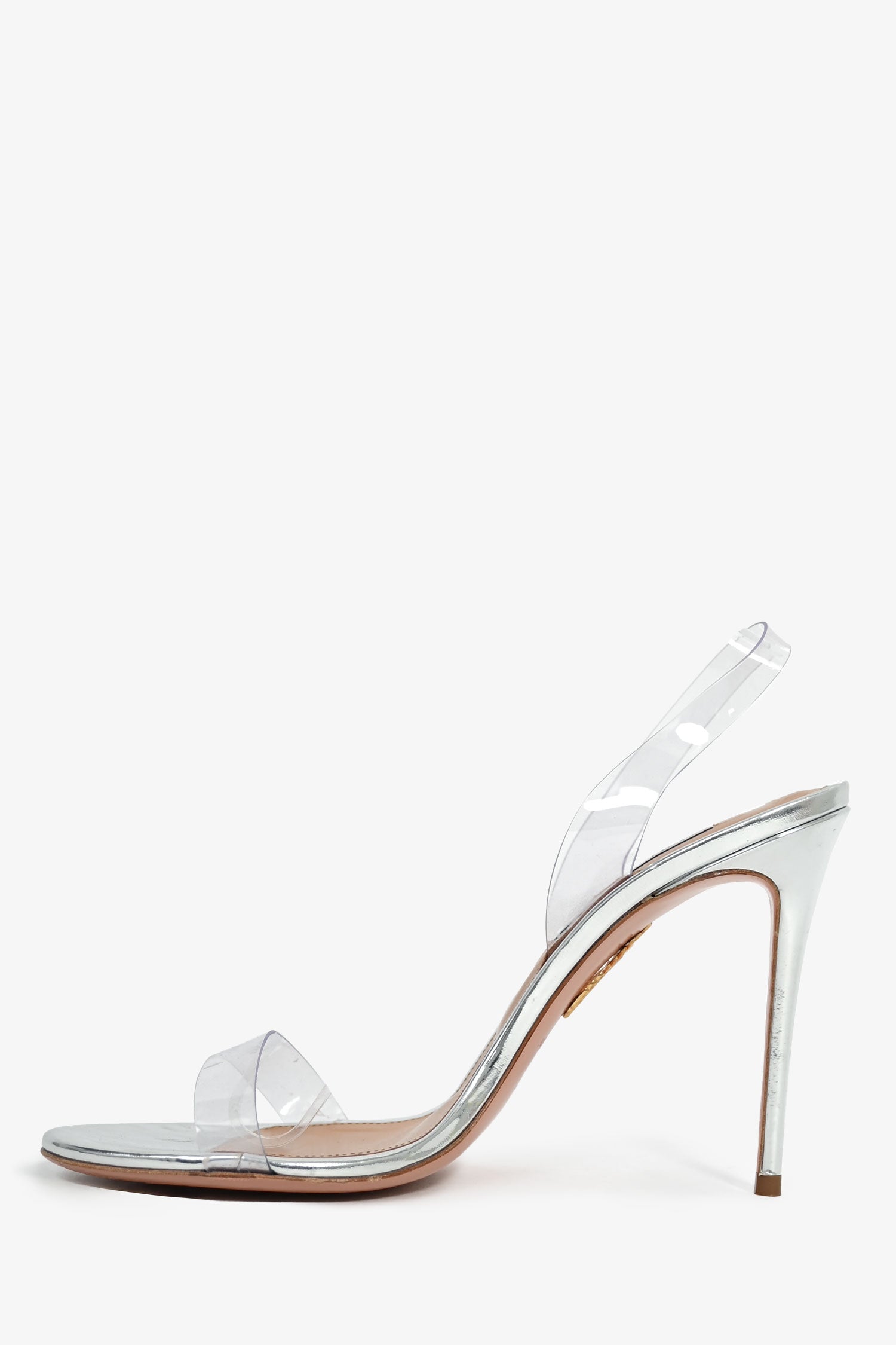 Refresh availabilityAquazzura Silver Metallic PVC Heels. PVC slingback and toe strap. Leather insoles. Metallic PVC. Rounded toe. Tonal stitching.