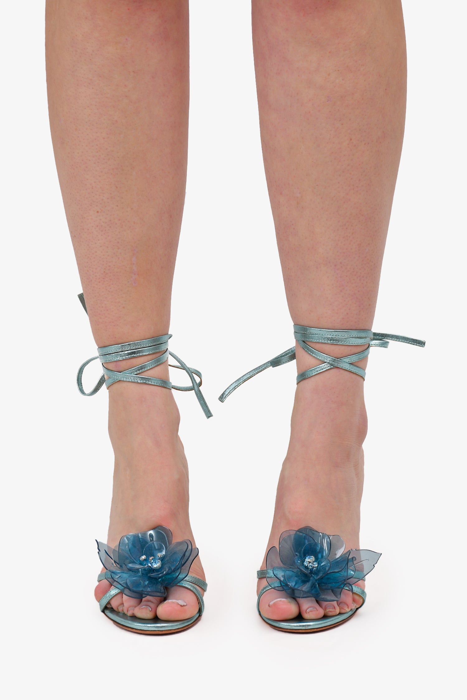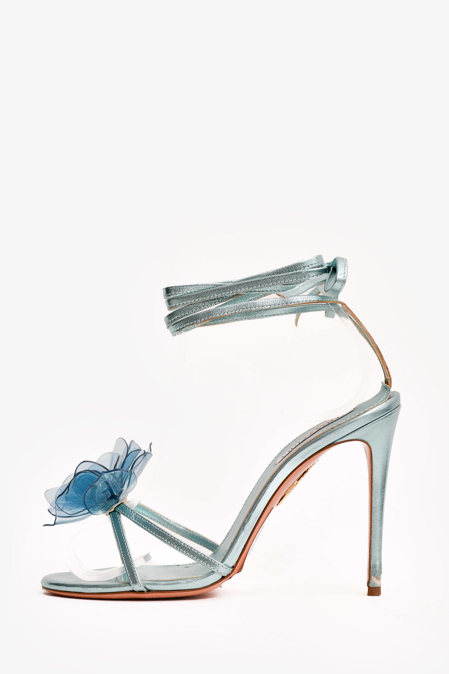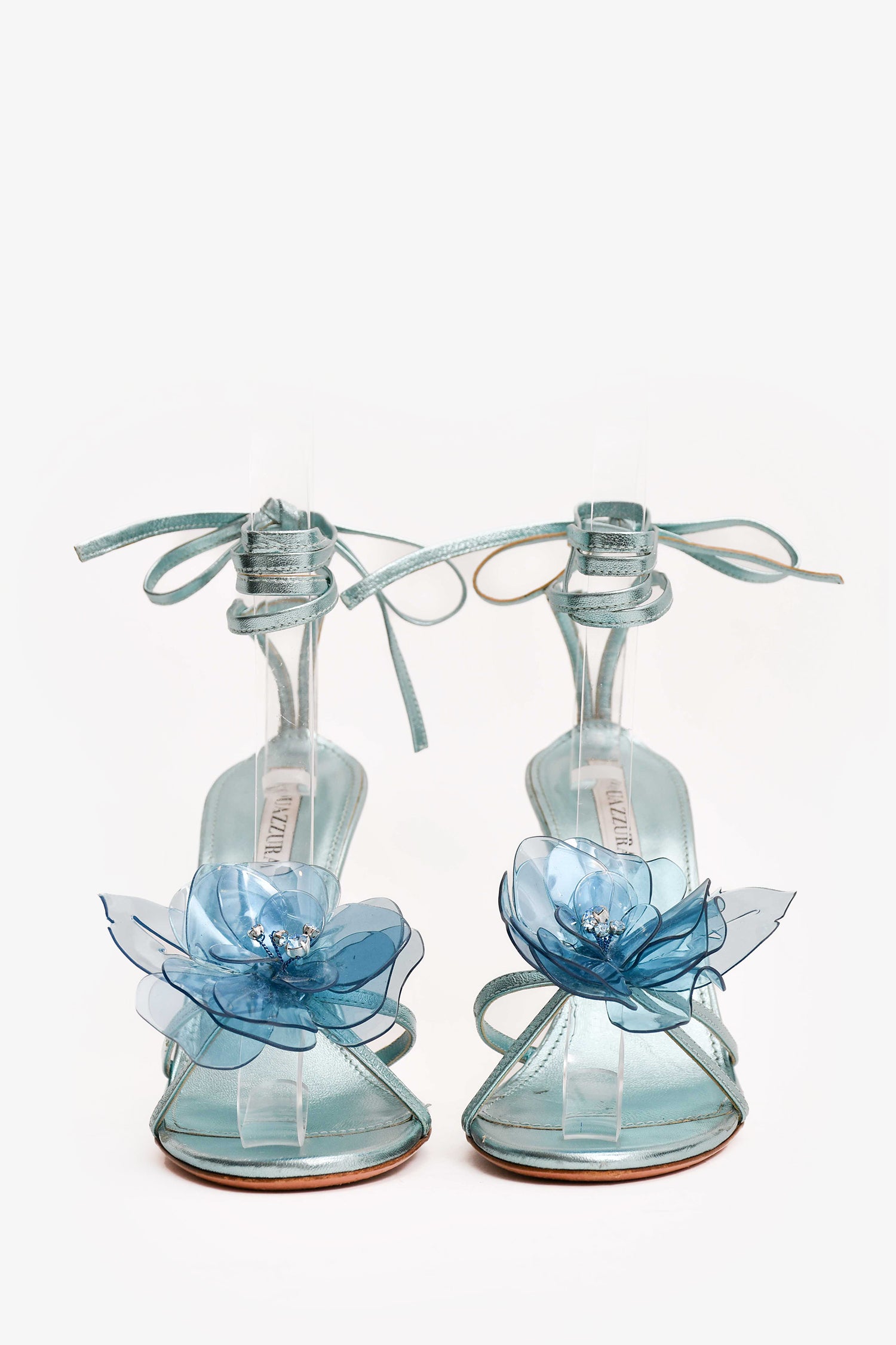 Refresh availabilityAquazzurra Blue Floral Strappy Heels. PVC flower detailing. Lace-up closure at the ankle. Tonal stitching.