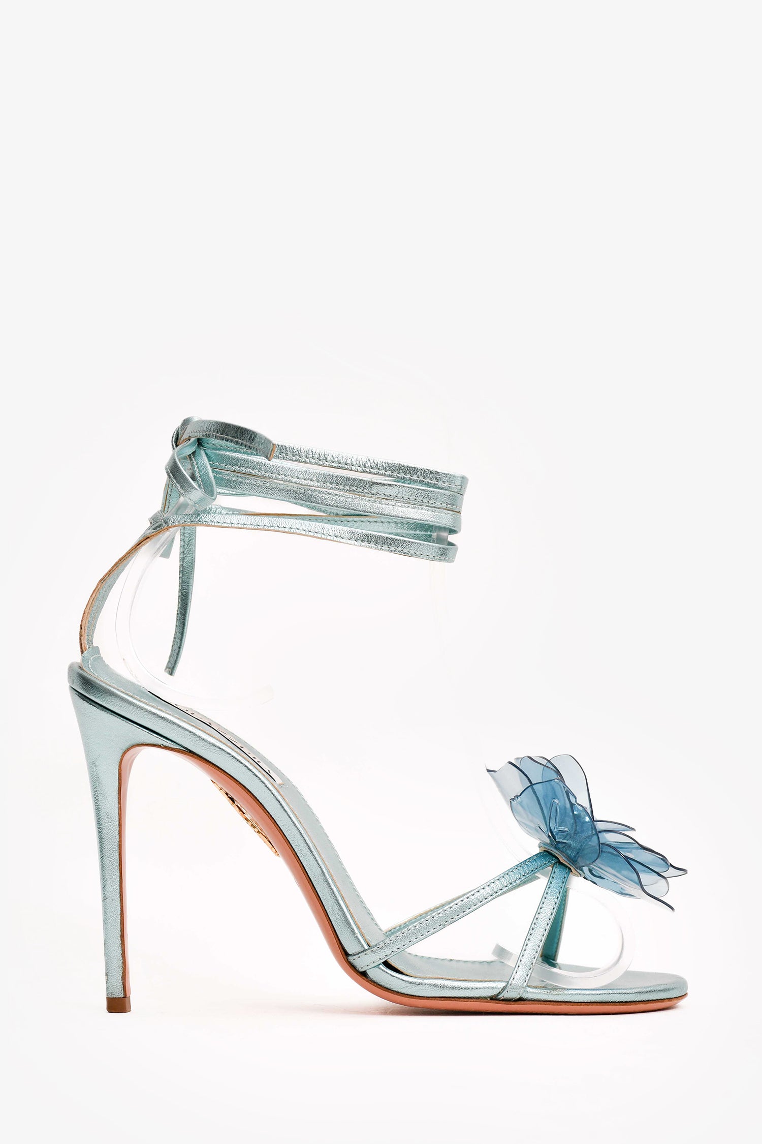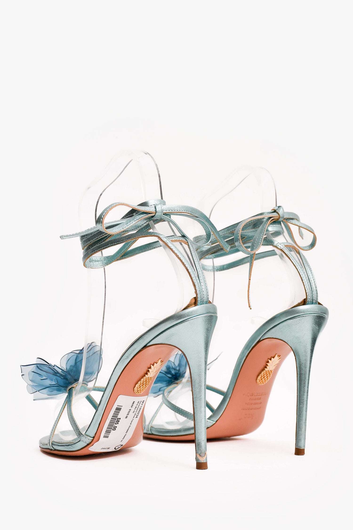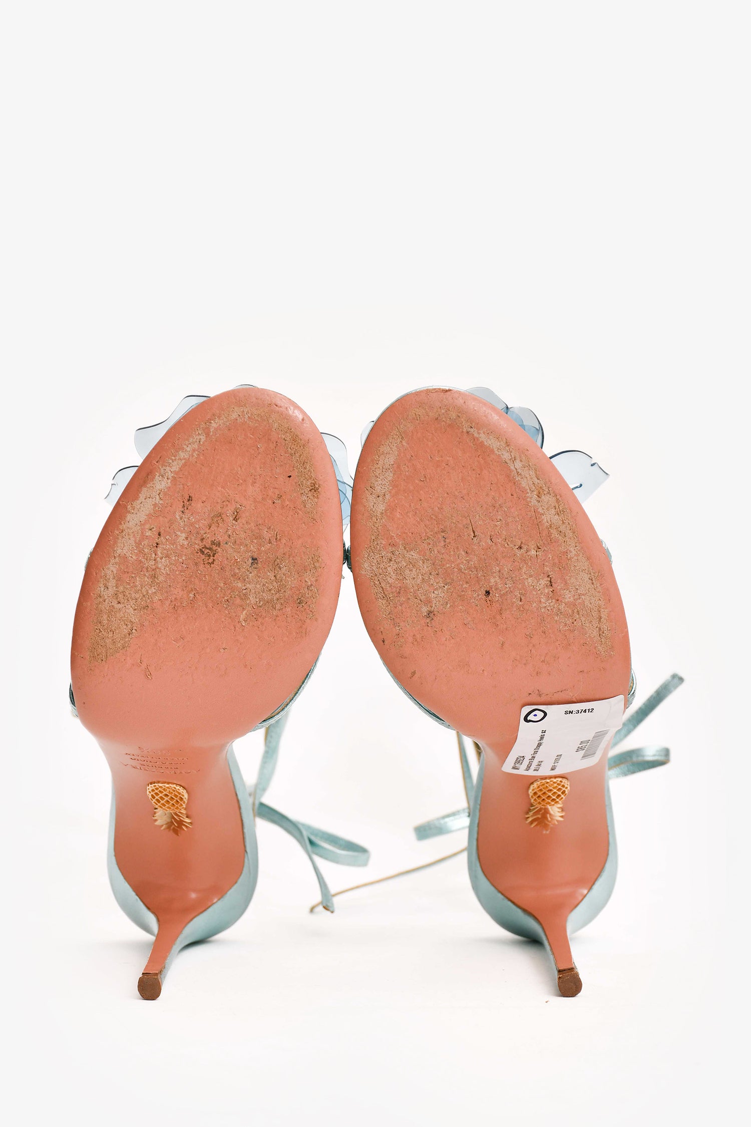 Refresh availabilityAquazzurra Blue Floral Strappy Heels. PVC flower detailing. Lace-up closure at the ankle. Tonal stitching.