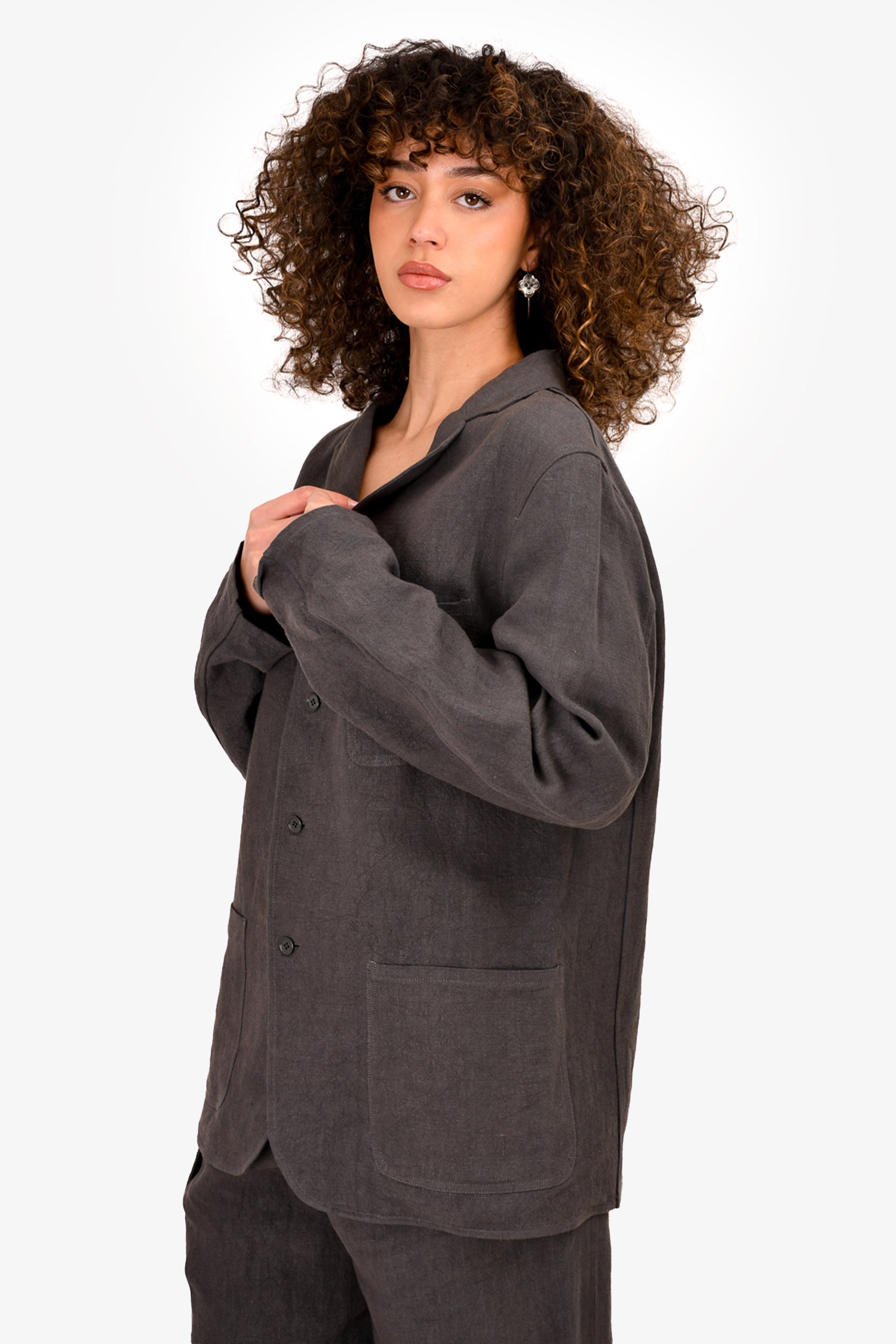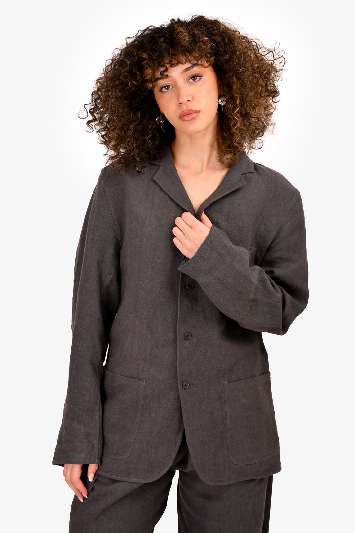 Refresh availabilityArch The Grey Linen Oversized Button Down Blazer. Front button-up closure. Front pockets. V-neck.