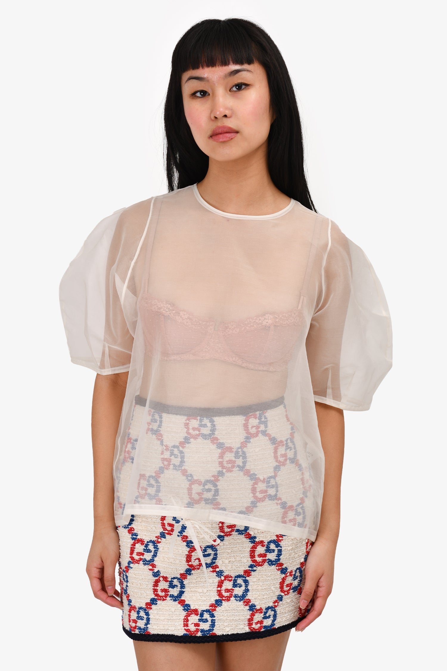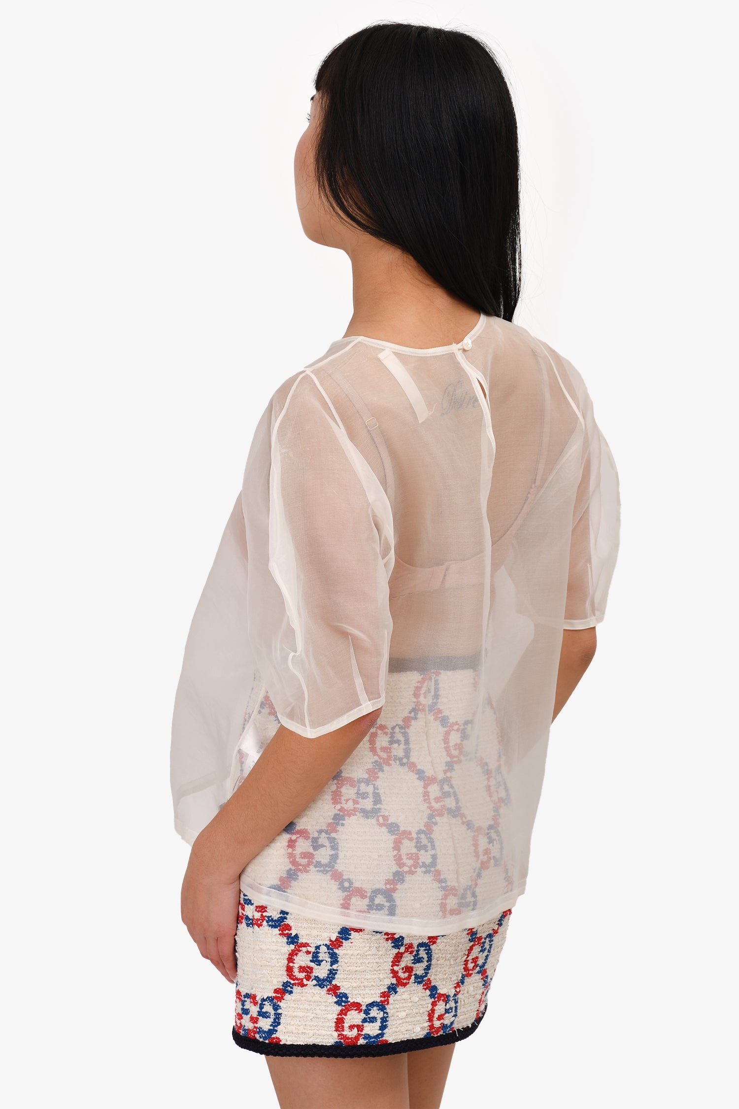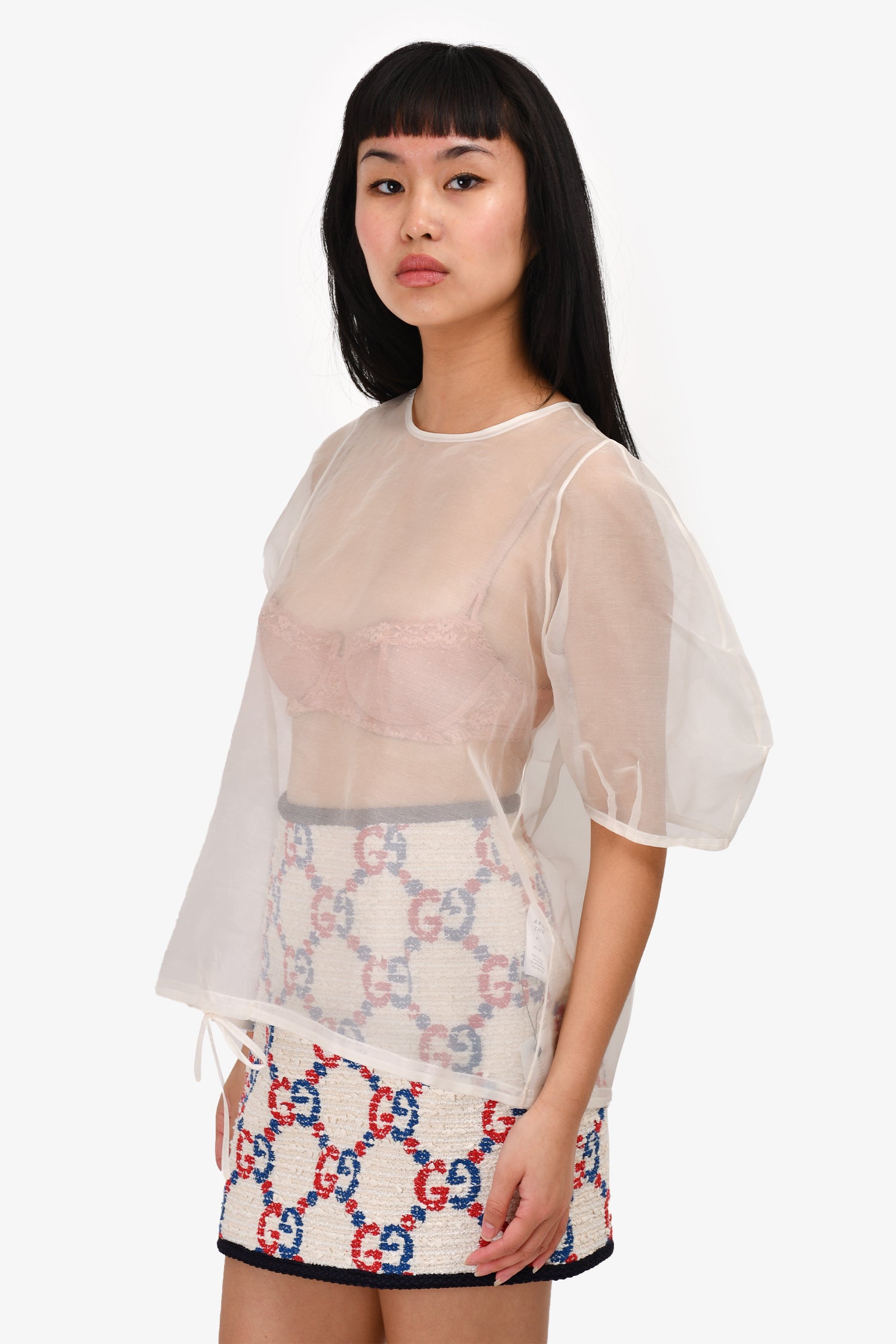 Refresh availabilityArch The White Silk Sheer Short Puff Sleeve Top. Round neck. Back-of-neck button closure. Drawstring detail on the hem.