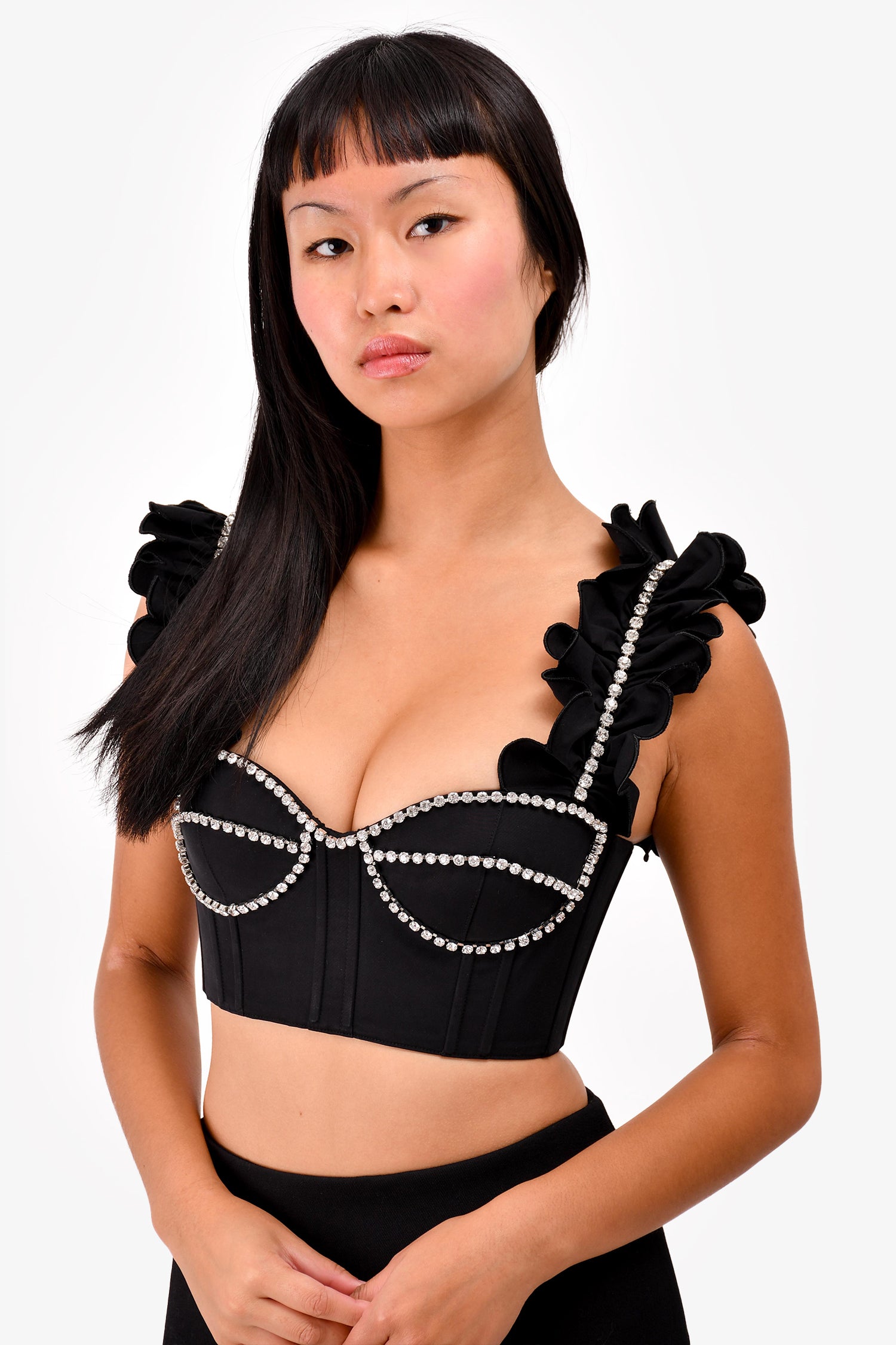 Refresh availabilityArea Black/Crystal Embellished Ruffle Crop Top. Back zipper closure. Silver-tone hardware. Bra cup padding. Bonning for the corset. Tonal stitching.