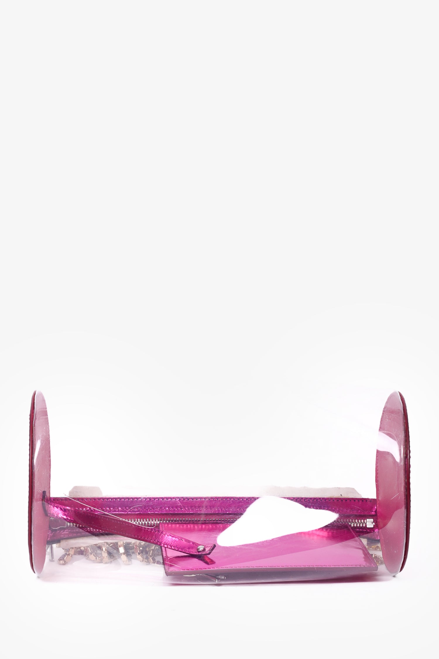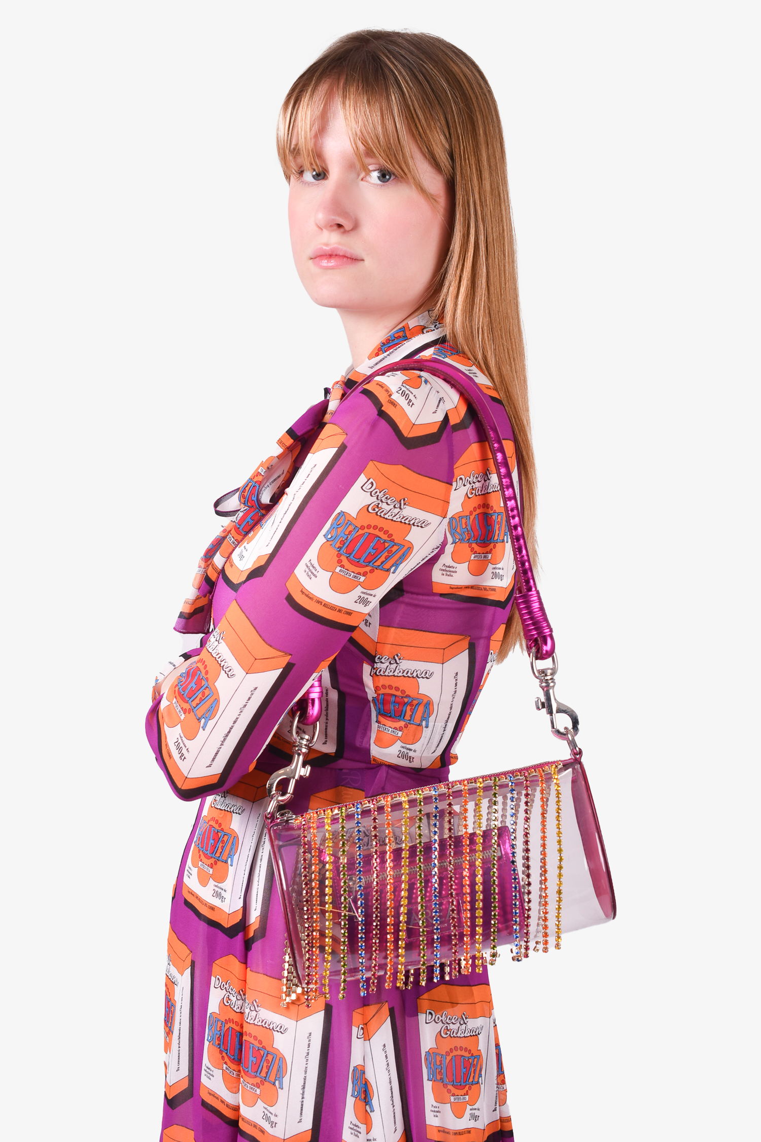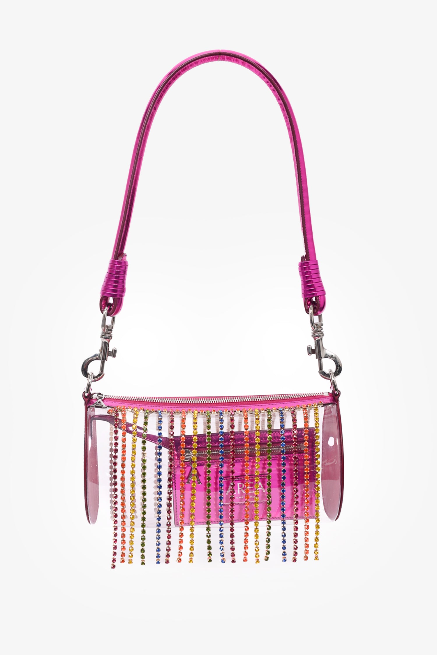 Refresh availabilityArea Pink/PVC Crystal Fringe Shoulder Bag with Attached Wallet. Top zip closure. Open interior. Interior wallet with zip closure. Silver-tone hardware. Detachable shoulder strap. Tonal stitching.