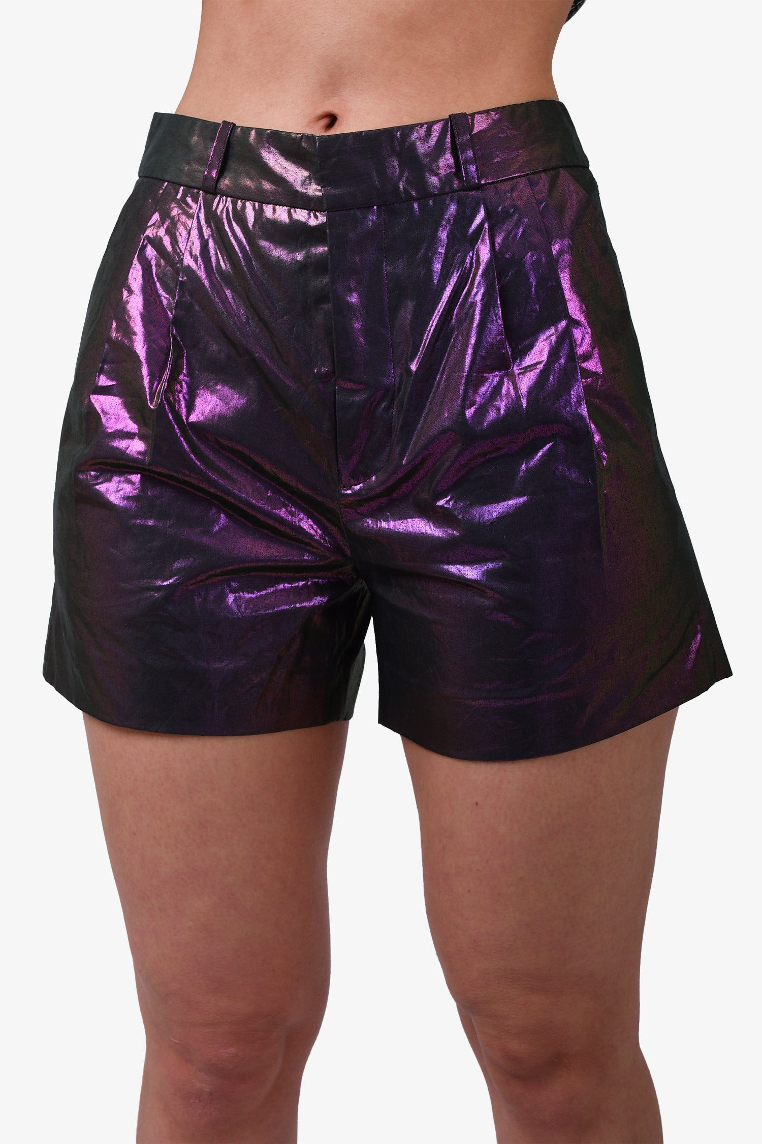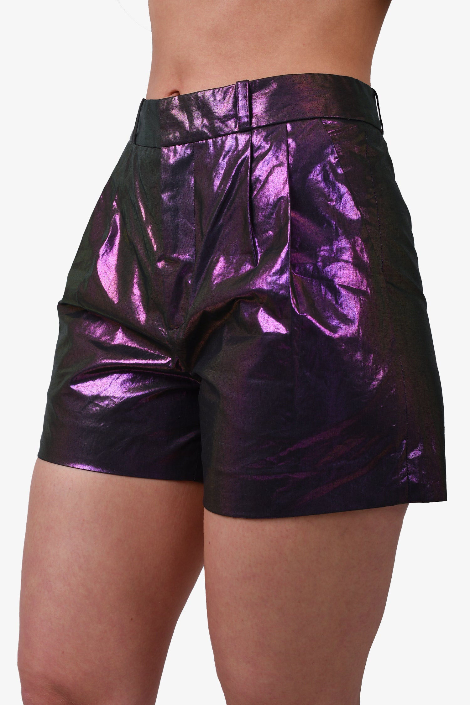Refresh availabilityArea Purple Iridescent High Waisted Tailored Shorts. Zip up with clasp closure at front. Unlined. Tonal stitching.