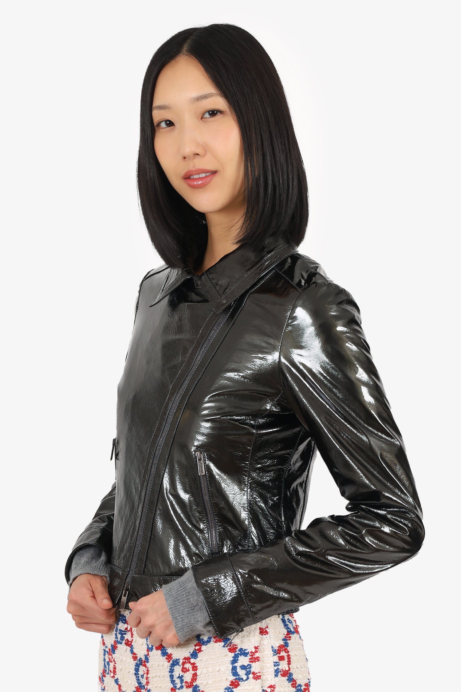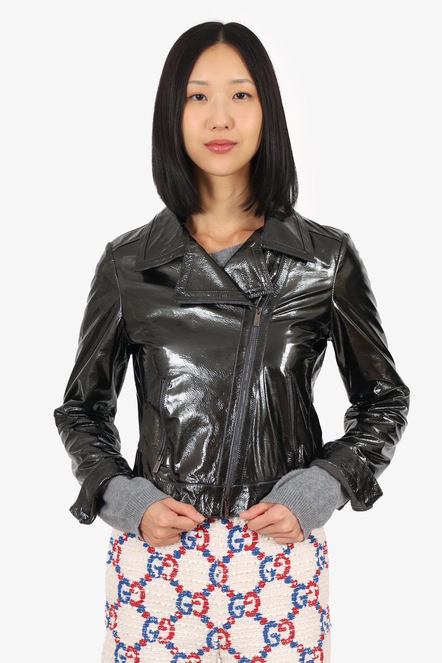 Refresh availabilityArmani Black Patent Leather Crinkled Jacket. Pull-on. Collared-neckline. Front zip closure. Sleeve cuffs with zip closure. 2 front exterior side zip pockets. Lined interior. Palladium-tone hardware. Tonal stitching.