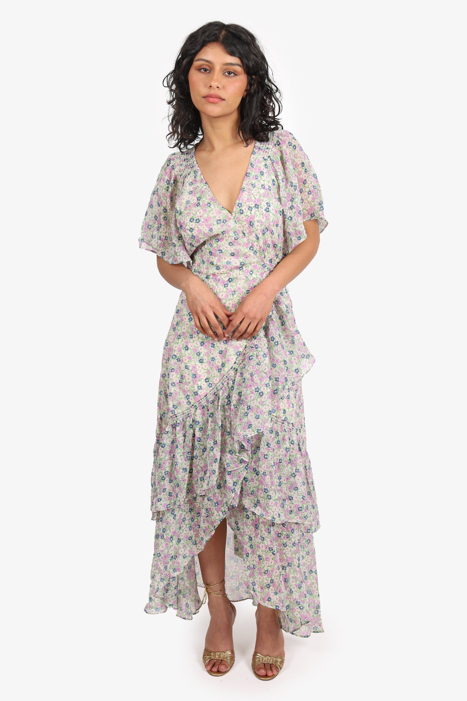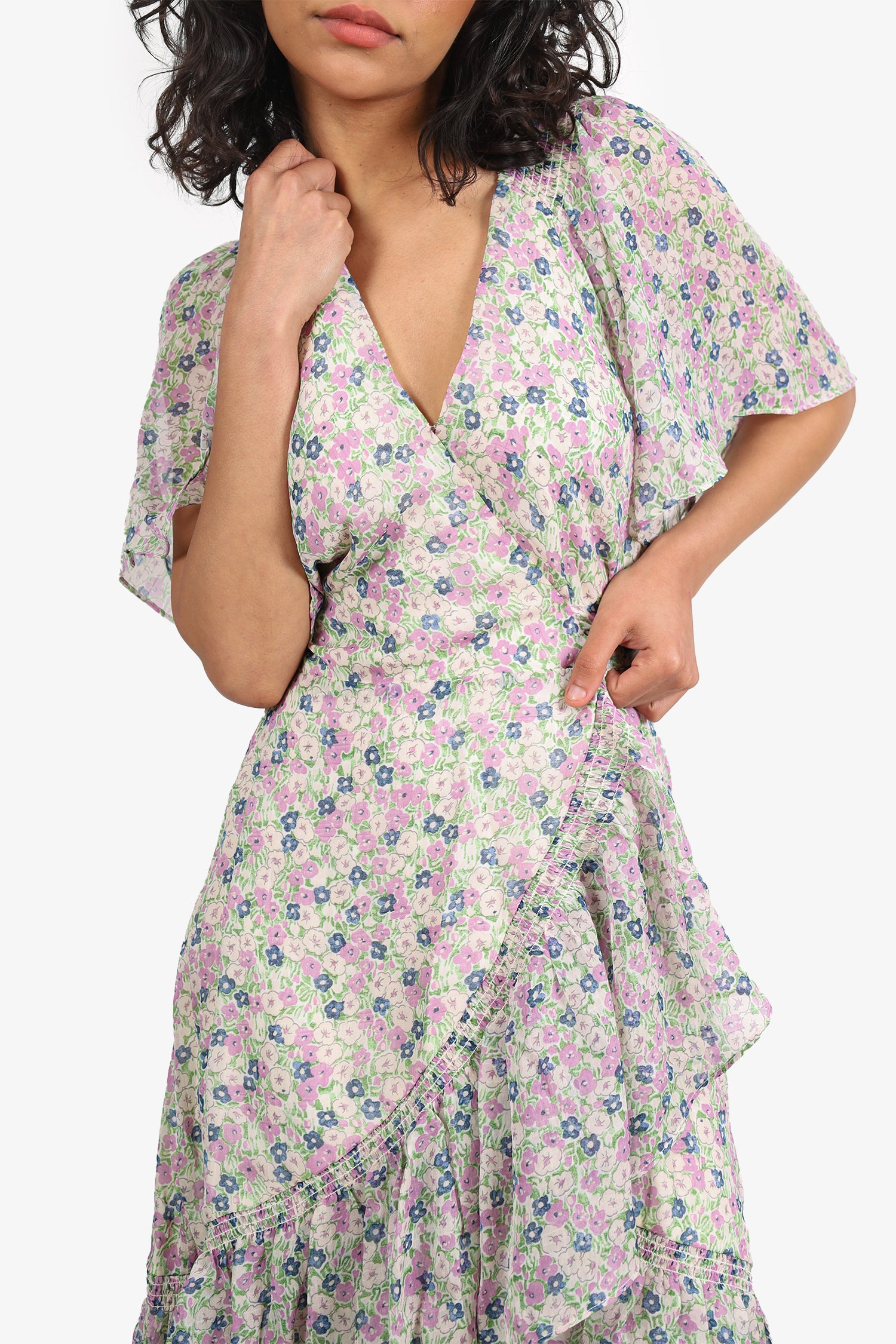 Refresh availabilityASTR The Label Green Floral 'Adella' Dress. Pull-on. V-neckline. Front hook closure. Tie-up closure at waistline. Elasticated neckline and sleeve cuffs. Lined interior. Tonal stitching.