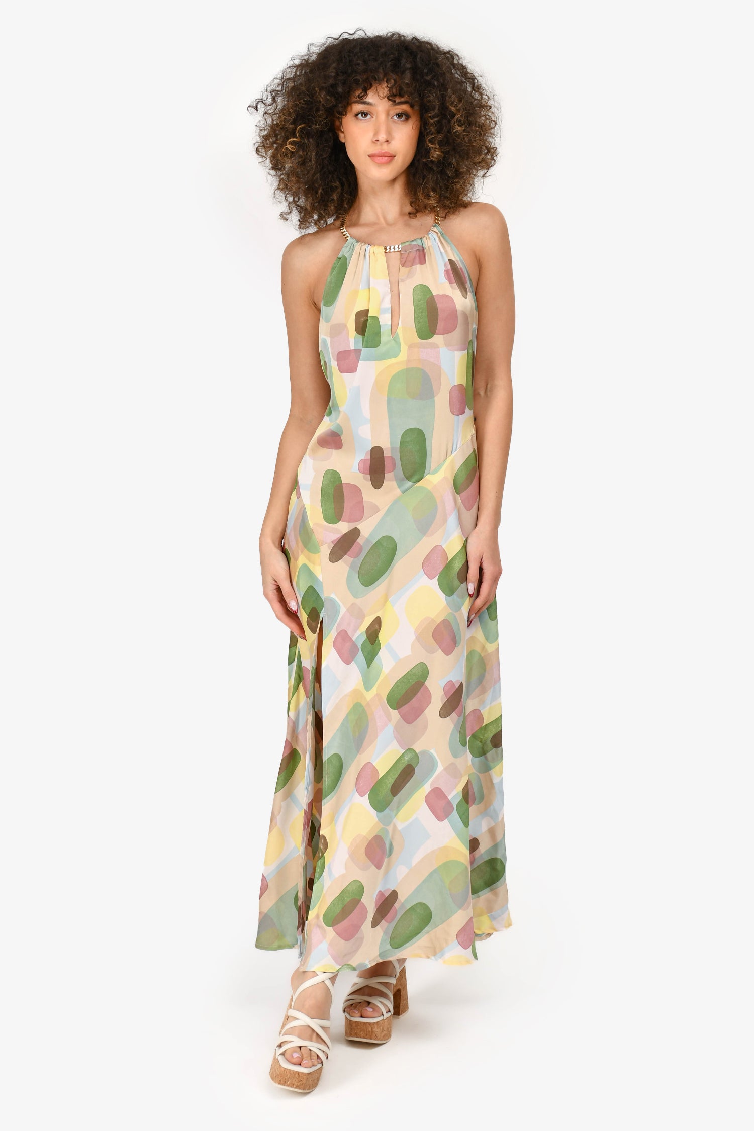 Refresh availabilityASTR The Label Multicolour 'Kazia' Dress. Back zip-up closure. Features halter neckline with a gold-tone chain that wraps around the neck. Side slit. Lined interior. Tonal stitching.