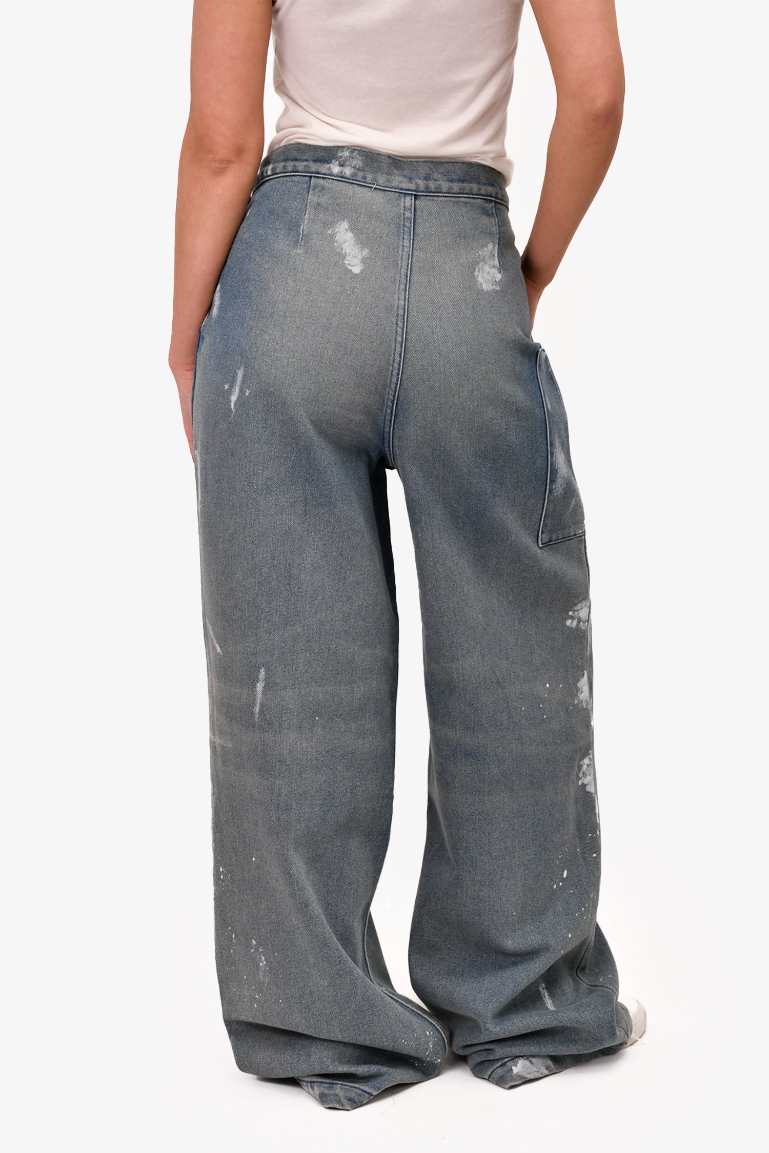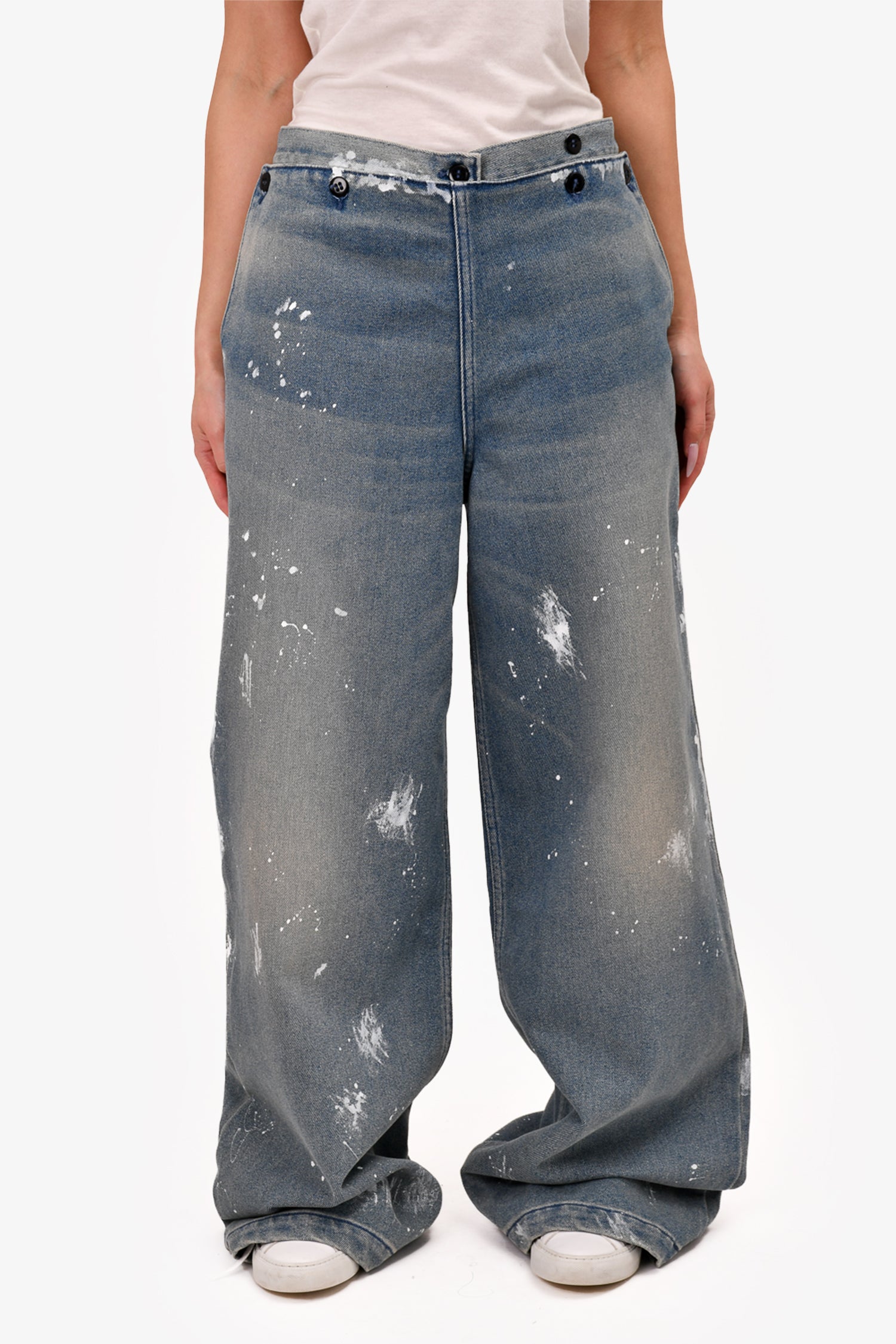 Refresh availabilityB Sides Blue Paint Splatter Wide Leg Jeans. Front button closure. Front pockets. Tonal stitching. *Pinned on model