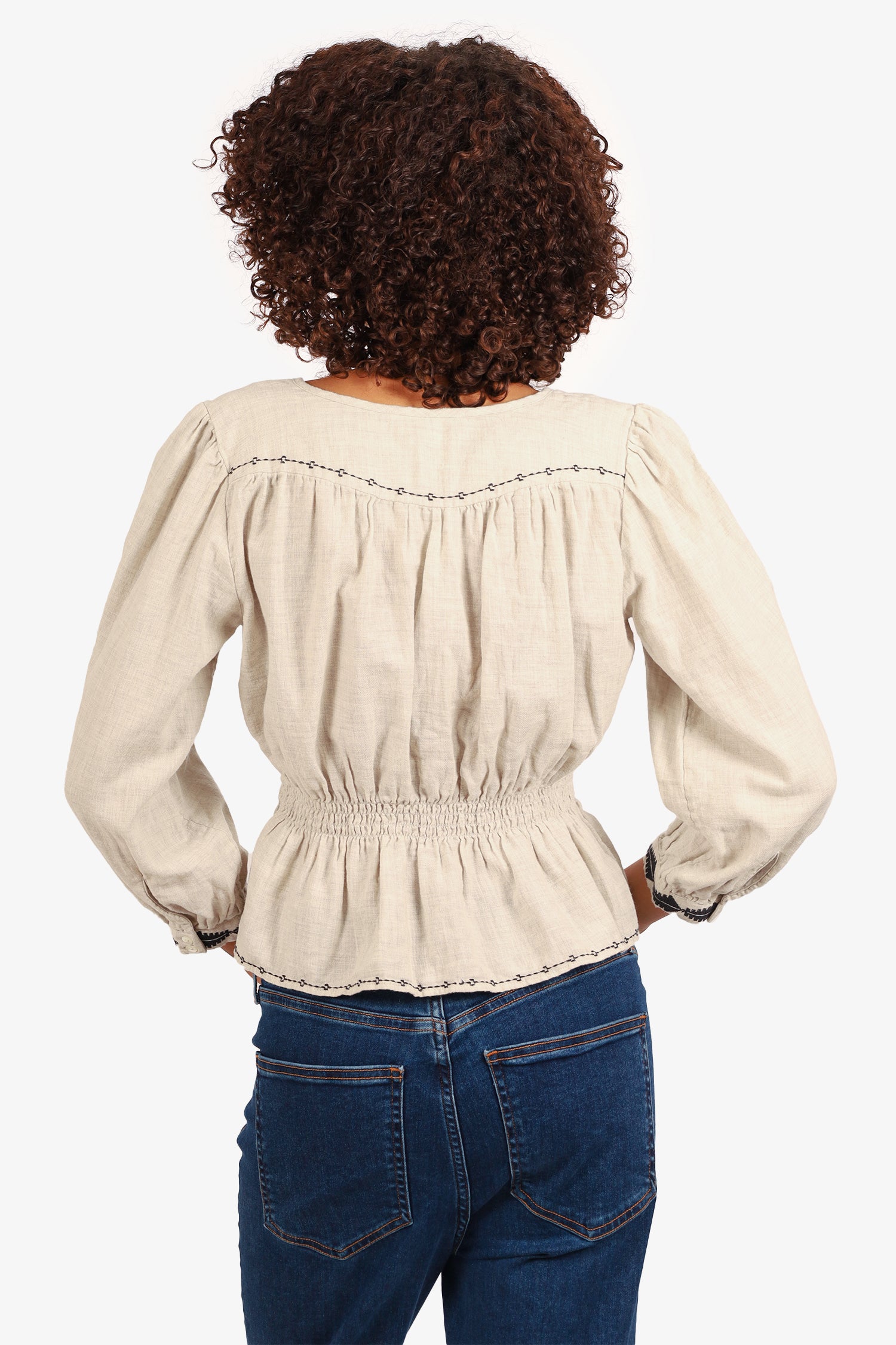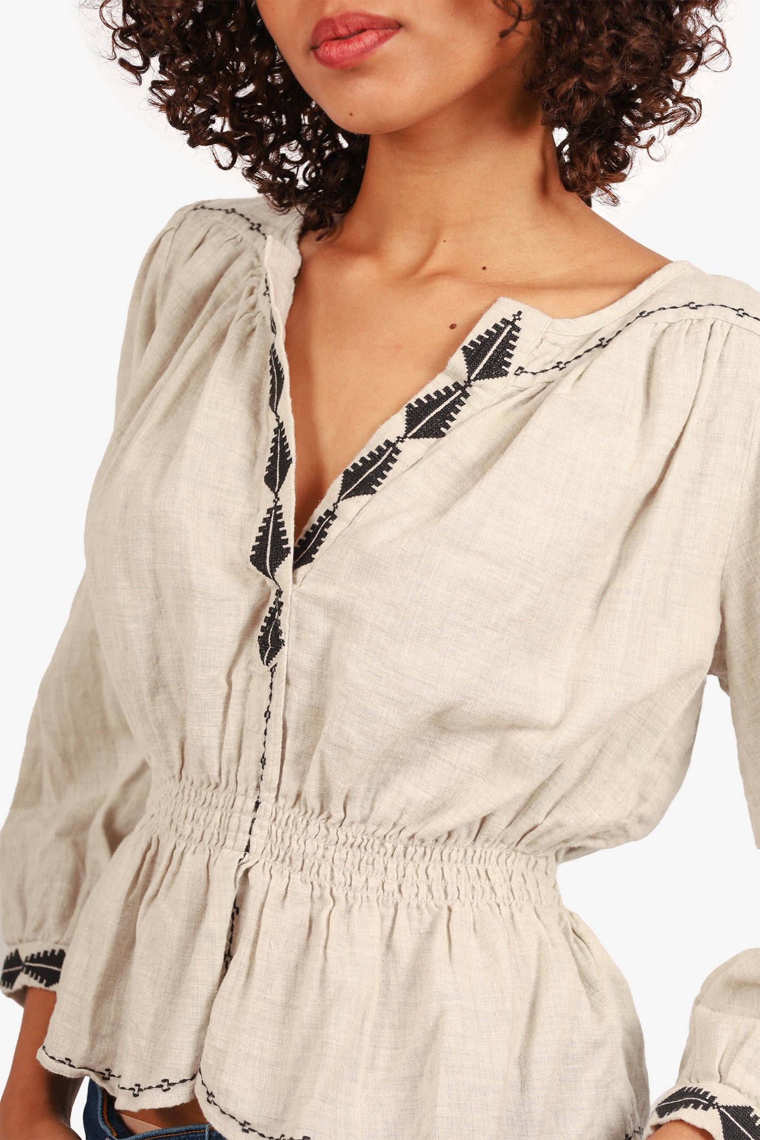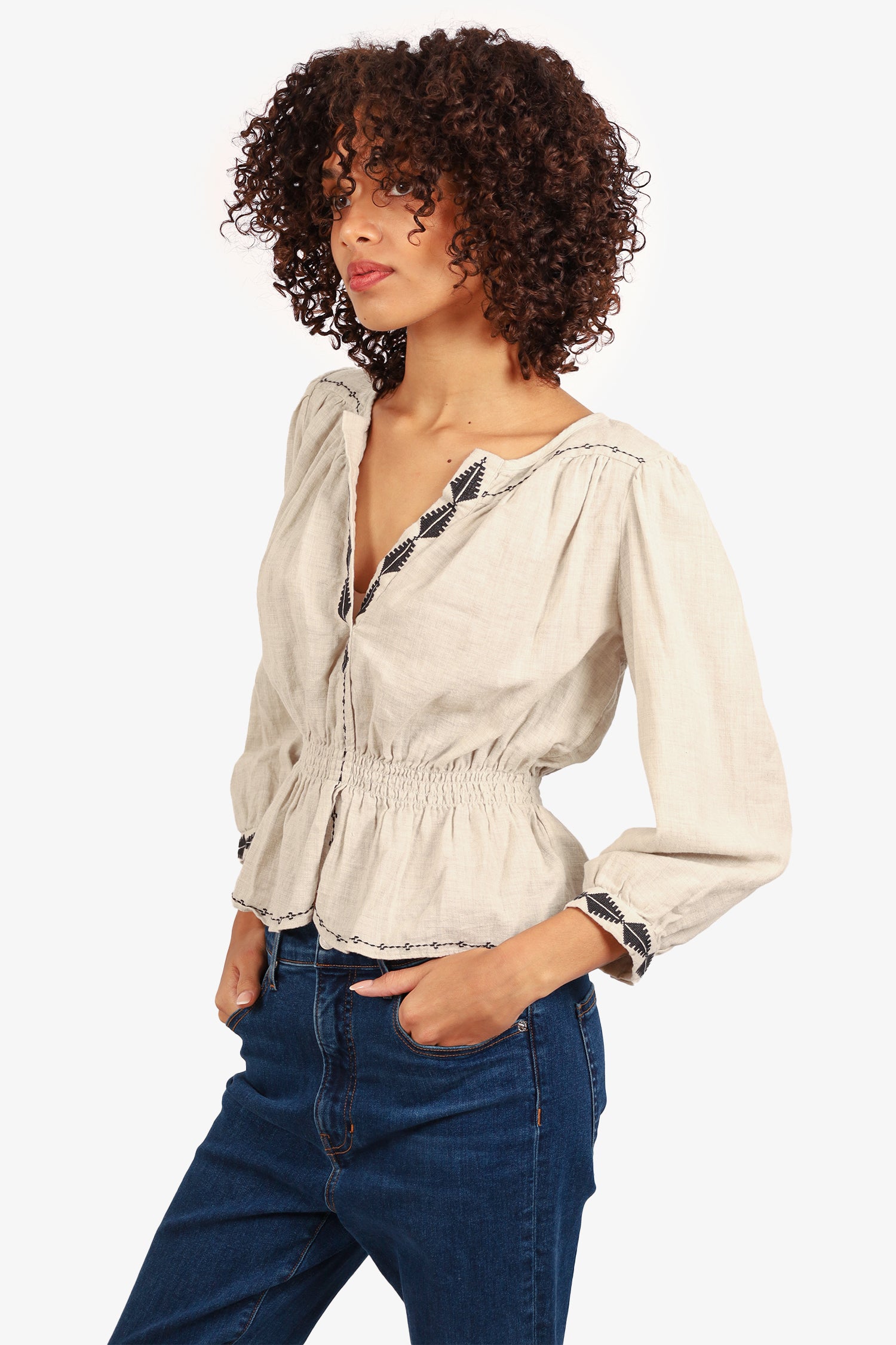 Refresh availabilityBa&sh Biege Embroidered Peplum Top. Pull-on. V-neckline. Cinched waistline. Split bottom hem. Button-up sleeve cuff closure. Tonal stitching.